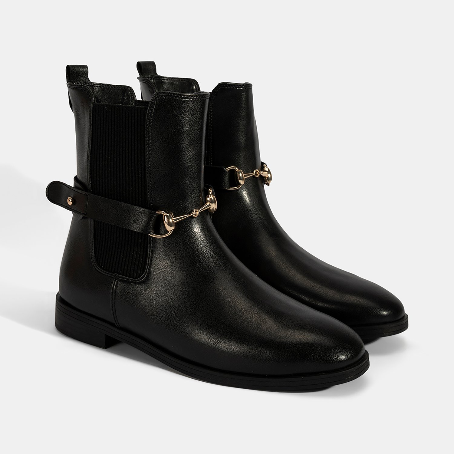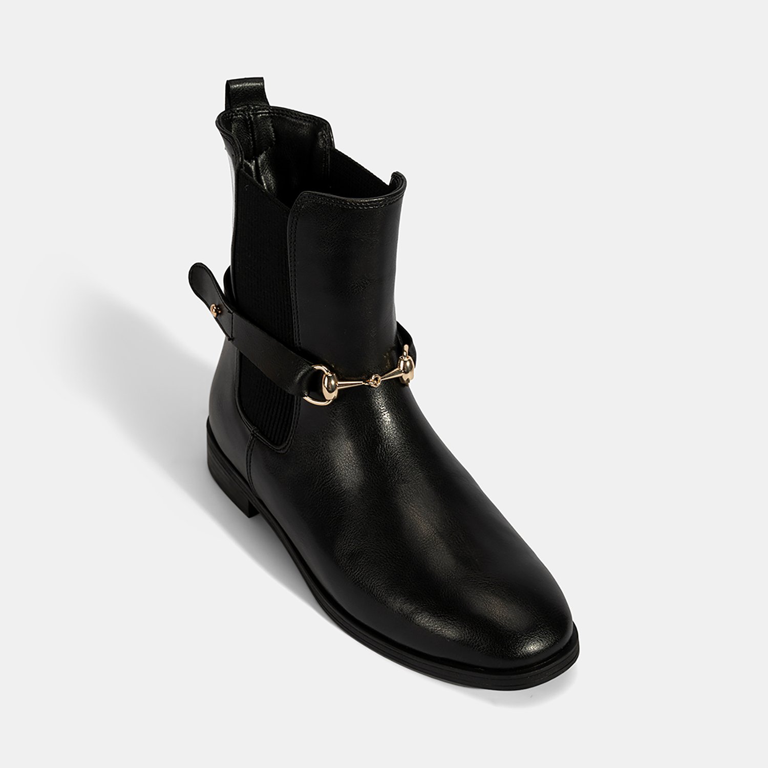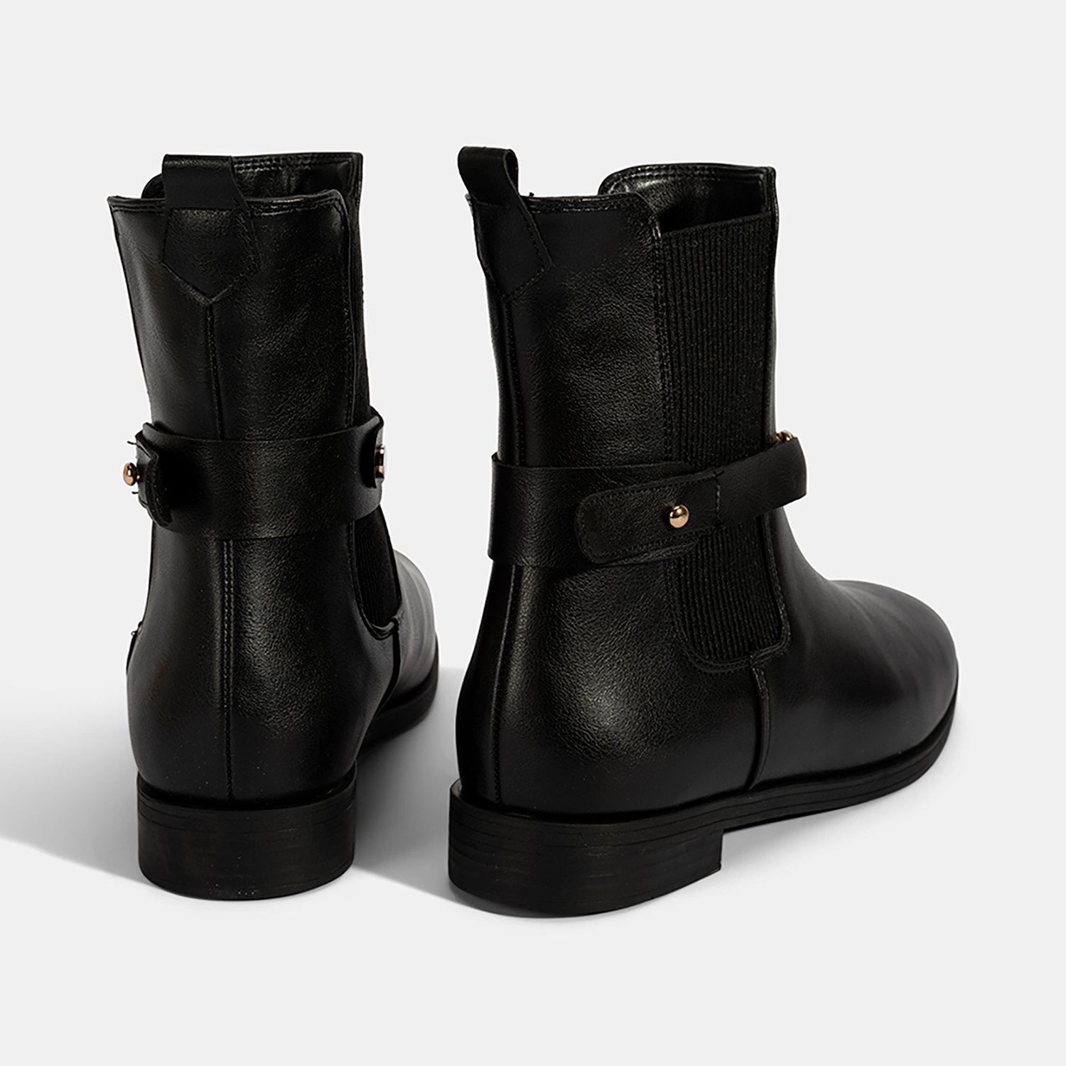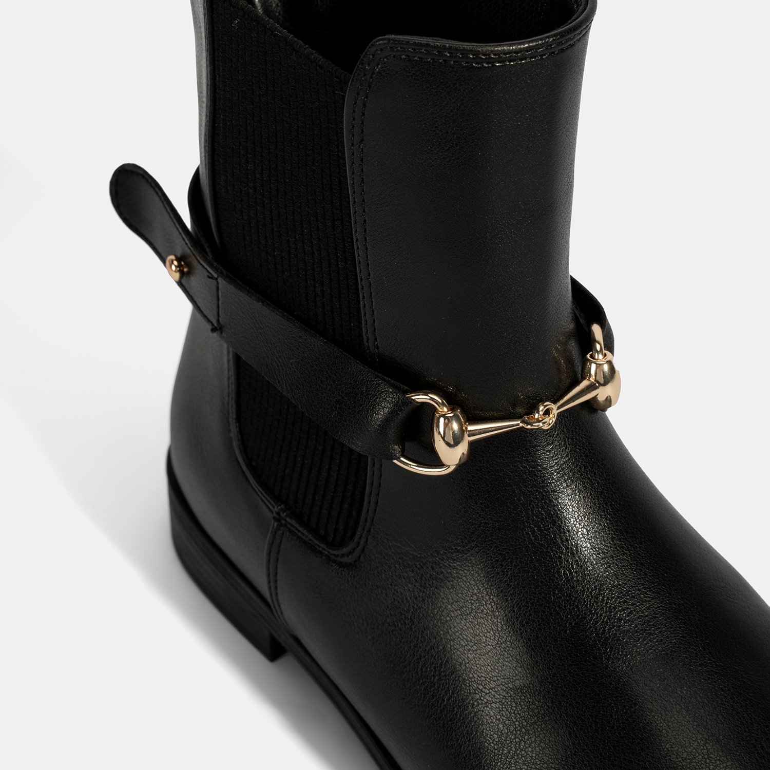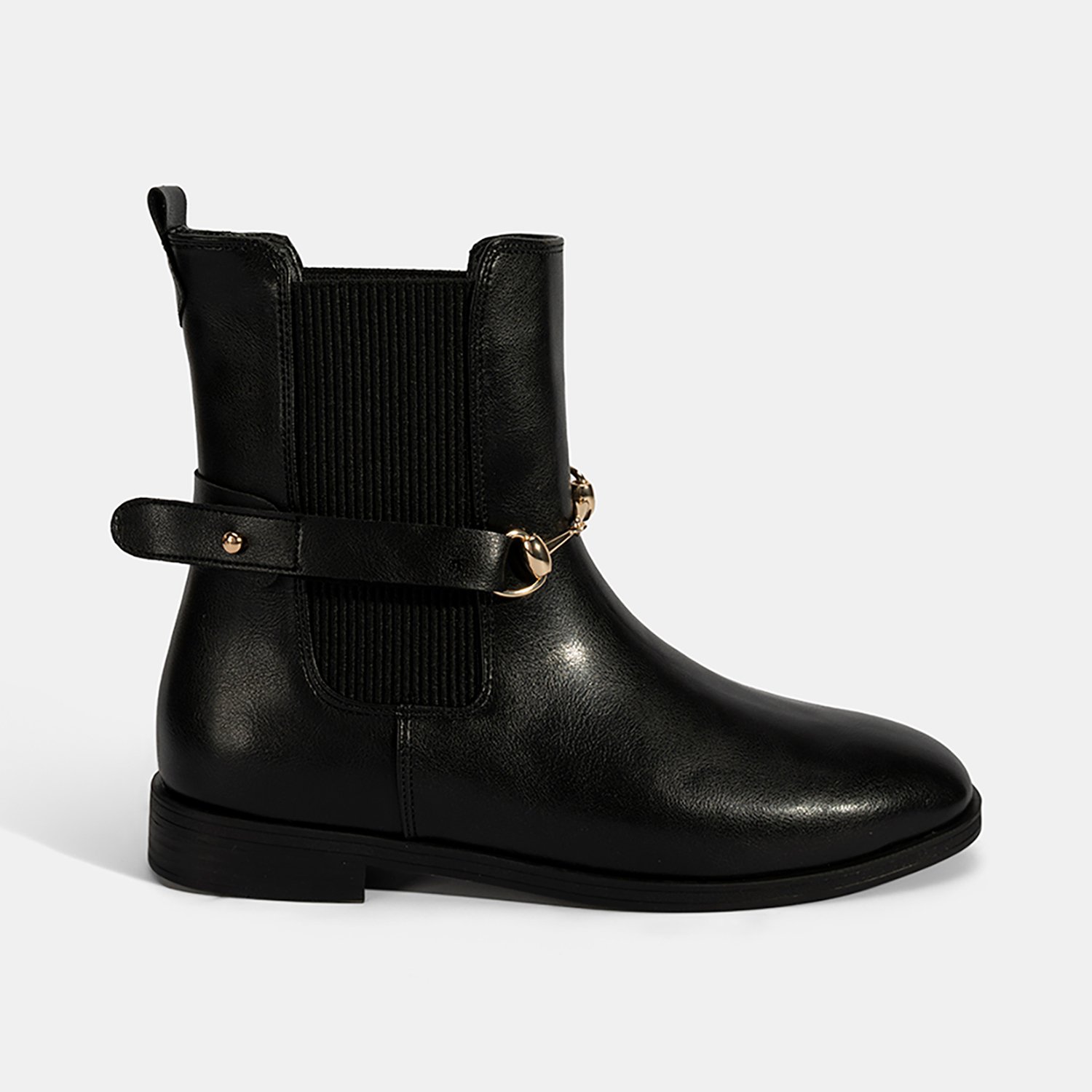 PU materyalden üretilmiş, sıcak tekstil astarlı, tekstil iç tabanlı, termo tabanlı, metal aksesuar detaylı ve lastikli kadın bot. Topuk yüksekliği: 3 cm