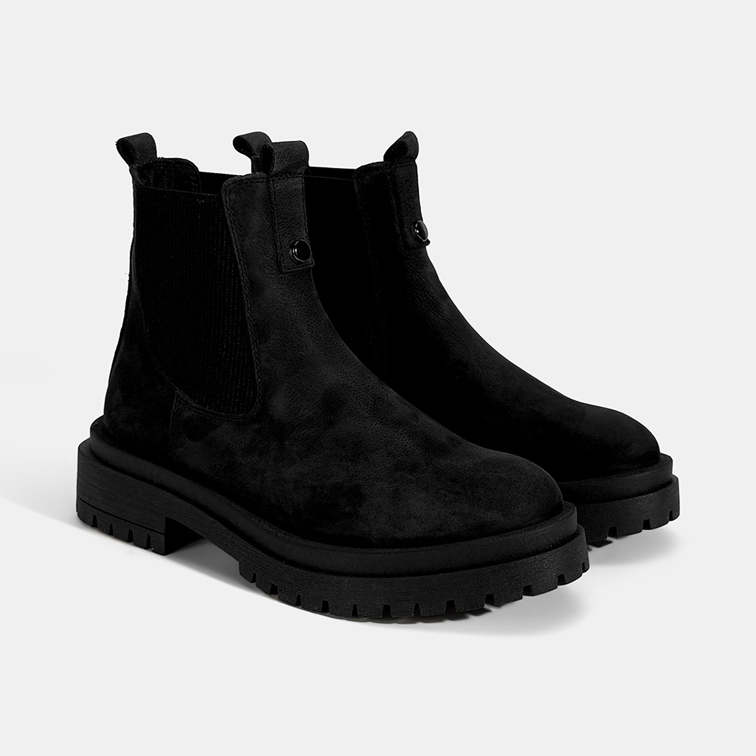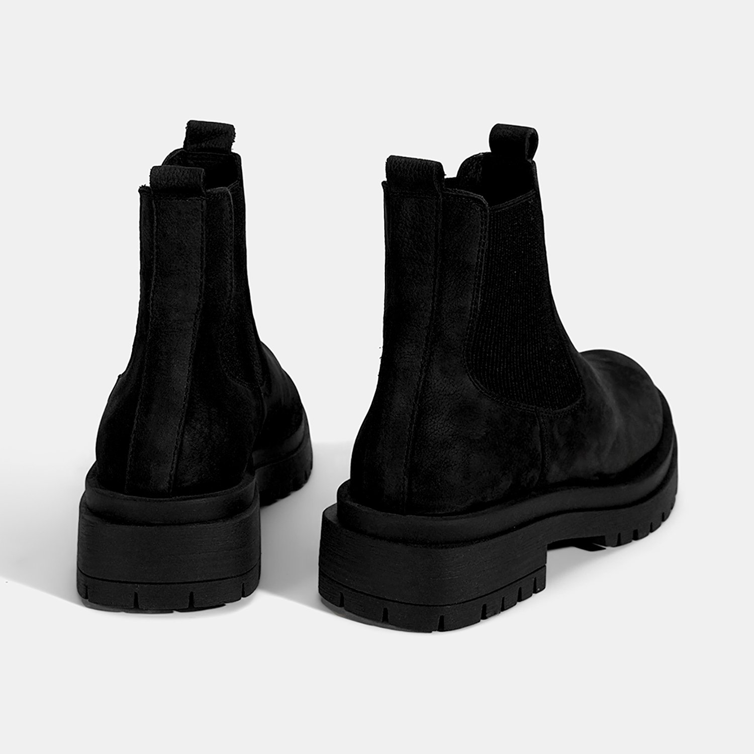 %100 nubuk deriden üretilmiş, sıcak tekstil astarlı, tekstil iç tabanlı, termo tabanlı, lastik detaylı kadın Chelsea bot. Topuk yüksekliği: 3,5 cm