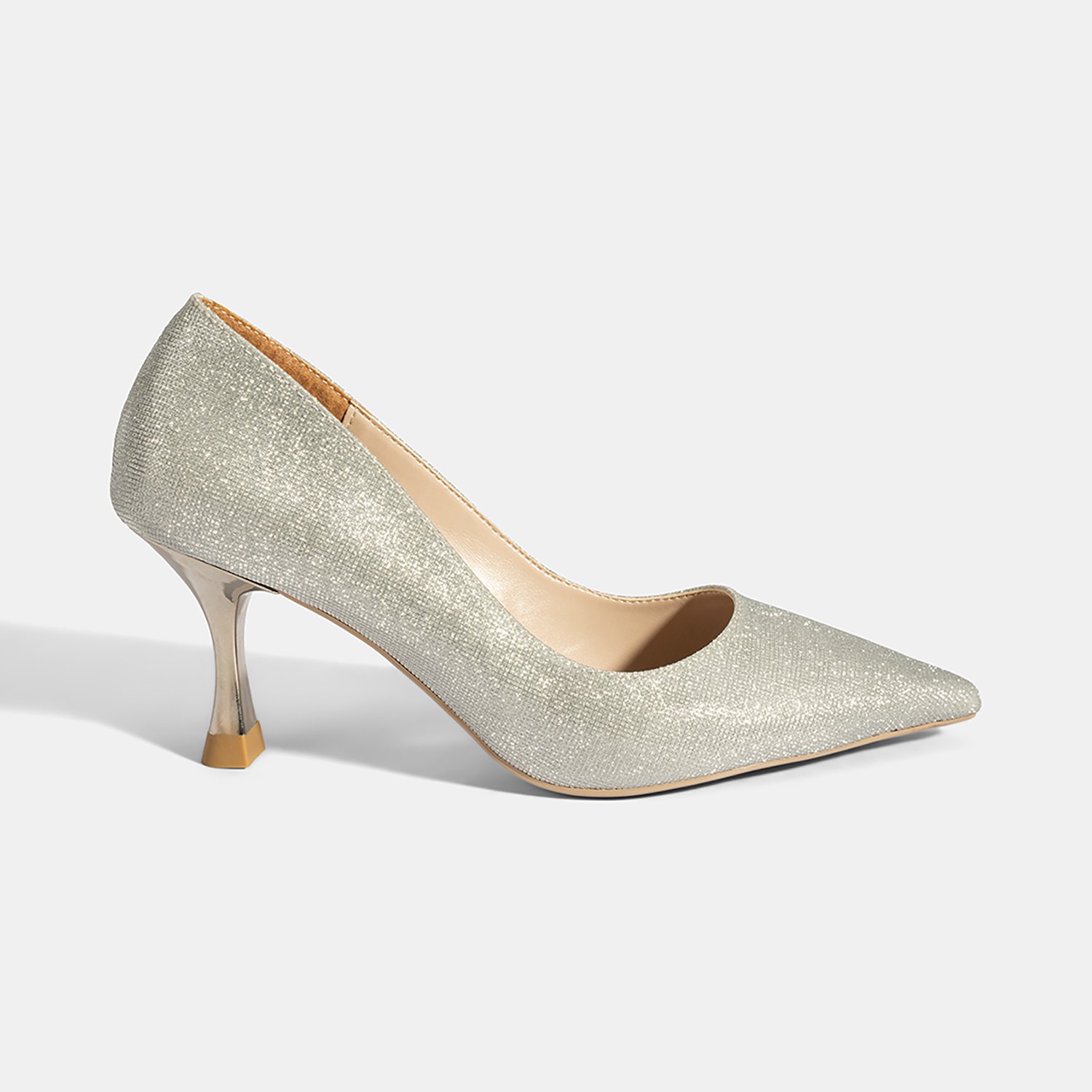 %100 tekstil, PU iç tabanlı, PU astarlı, neolit tabanlı, sivri burunlu kadın abiye ayakkabı.