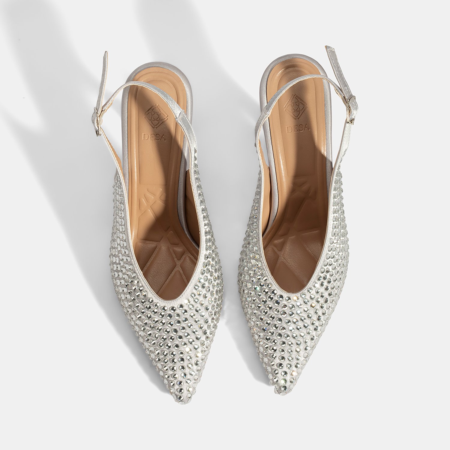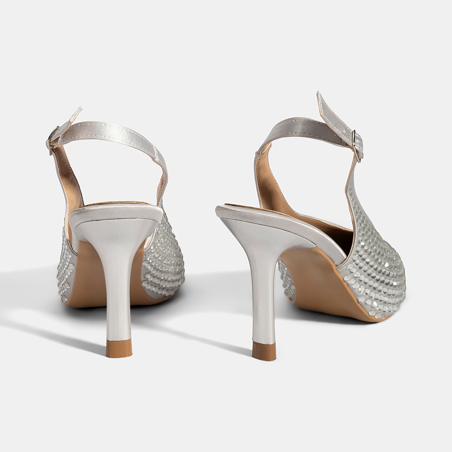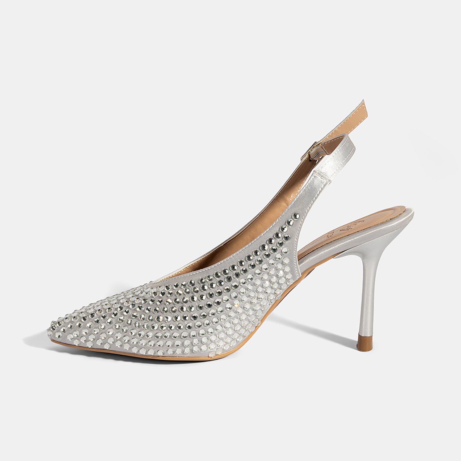 %100 saten tekstil, PU iç tabanlı, PU astarlı, neolit tabanlı, sivri burunlu, ayarlanabilir metal tokalı, arkası açık kadın abiye ayakkabı.