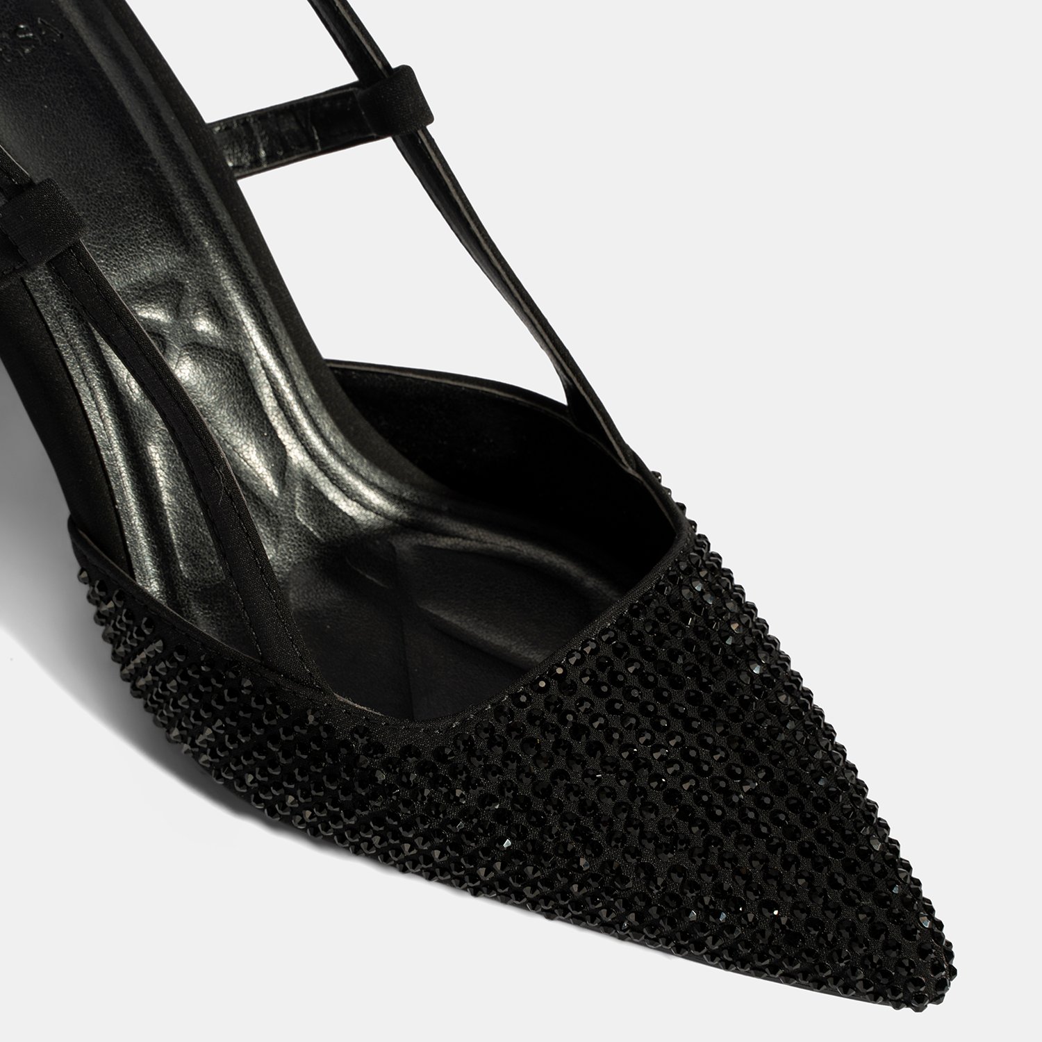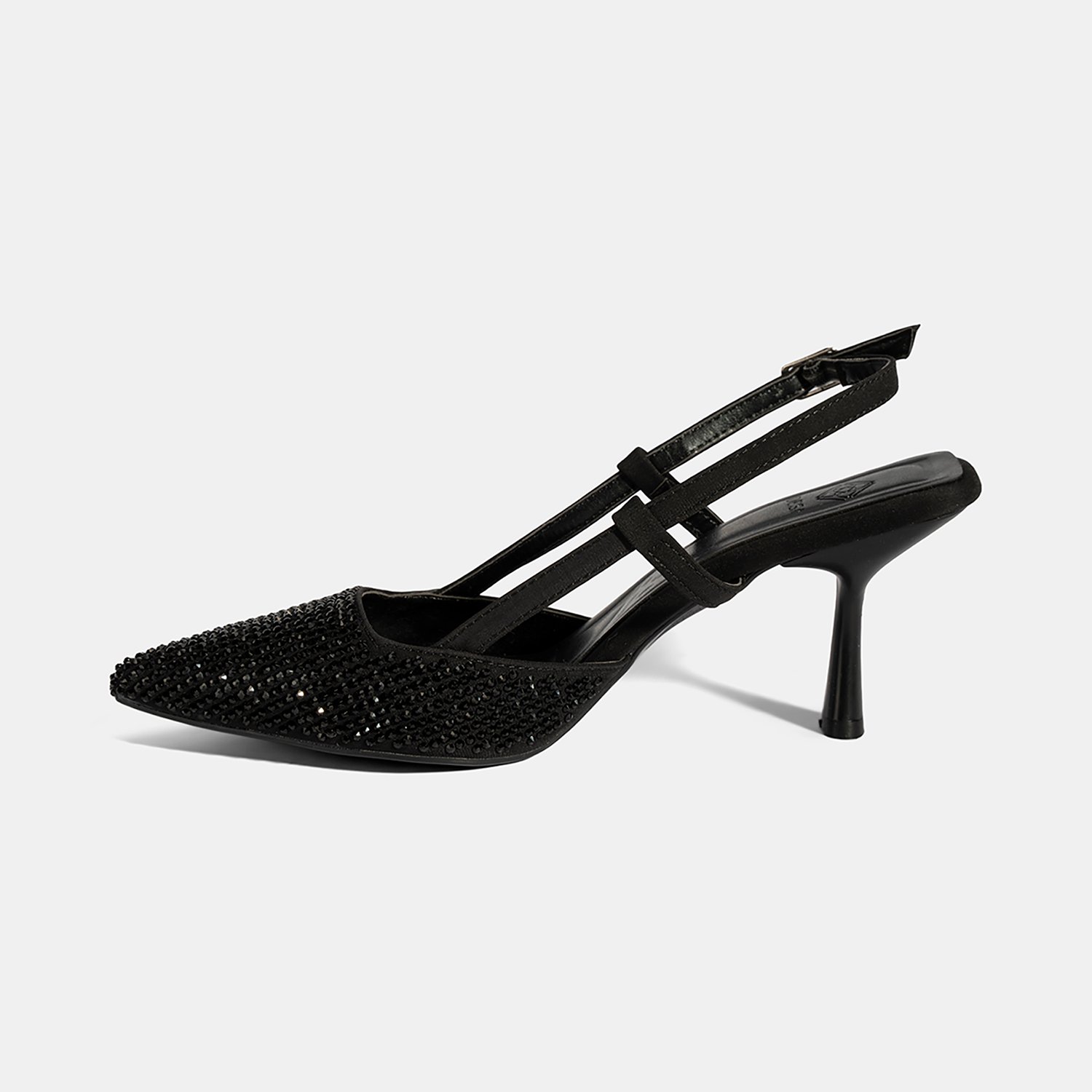 %100 saten tekstil, PU iç tabanlı, PU astarlı, neolit tabanlı, sivri burunlu, ayarlanabilir metal tokalı, arkası açık kadın abiye ayakkabı.