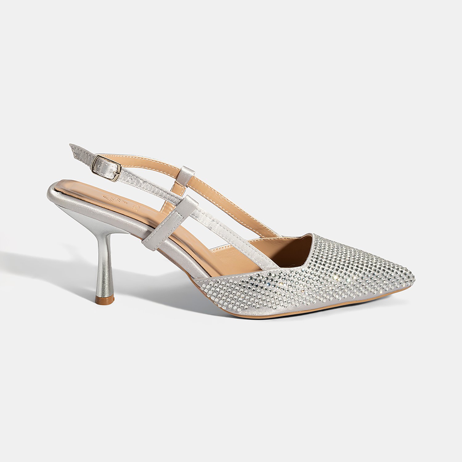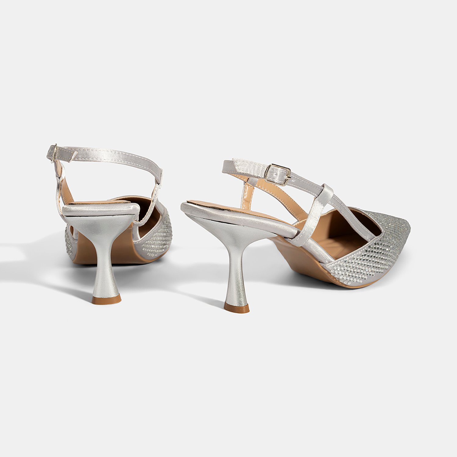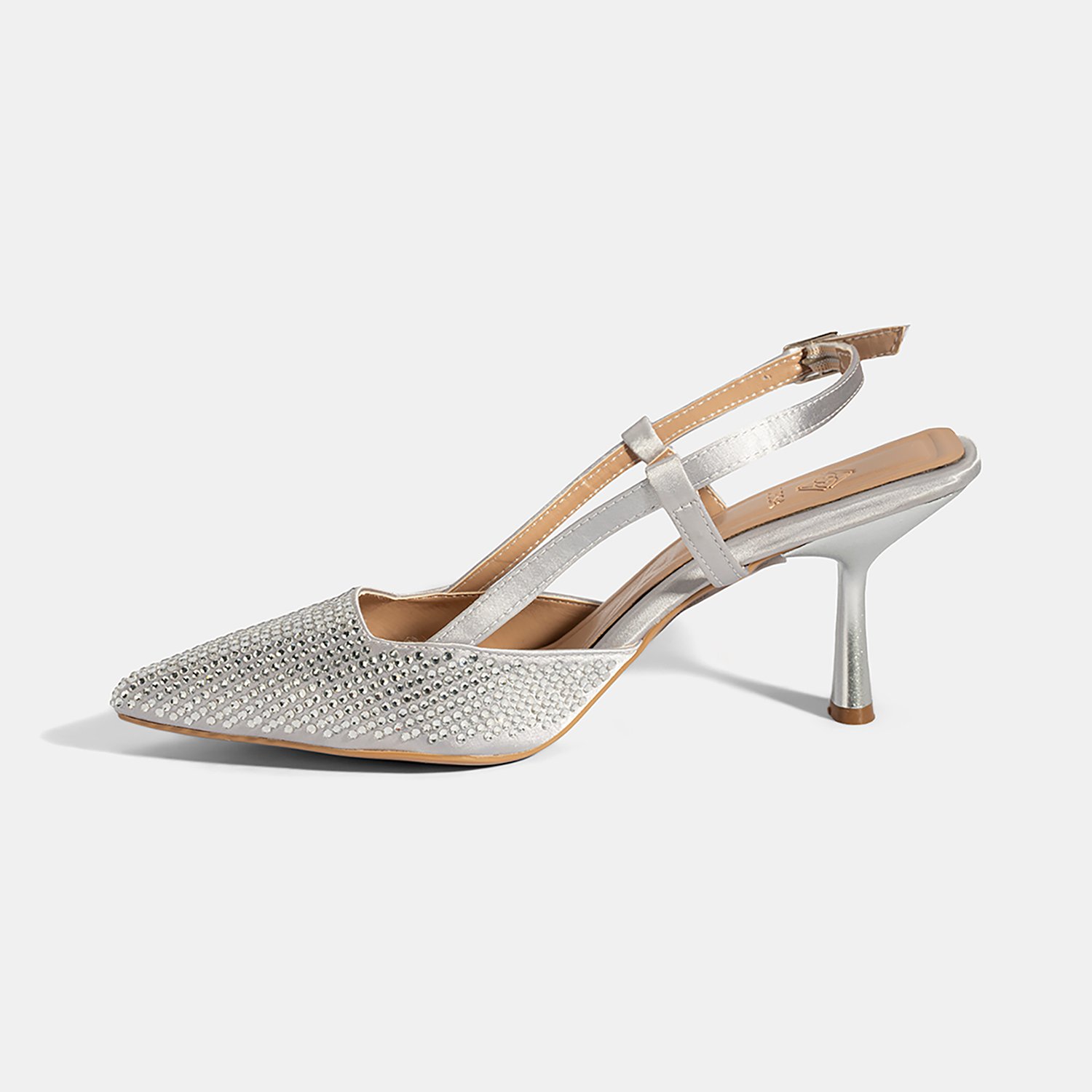 %100 saten tekstil, PU iç tabanlı, PU astarlı, neolit tabanlı, sivri burunlu, ayarlanabilir metal tokalı, arkası açık kadın abiye ayakkabı.