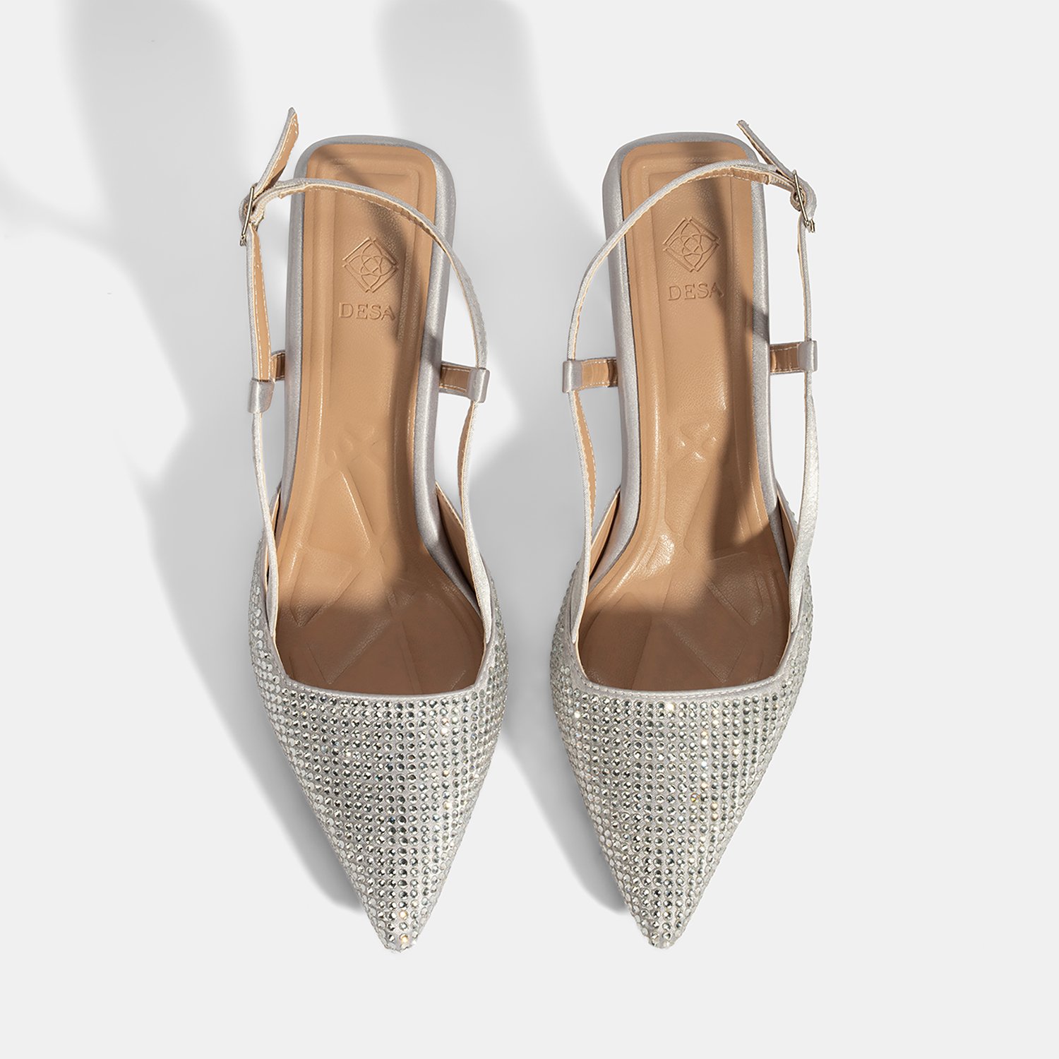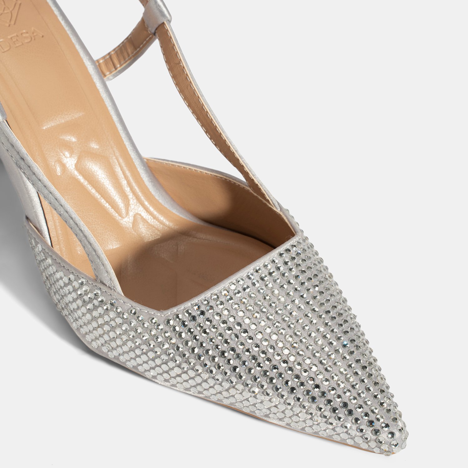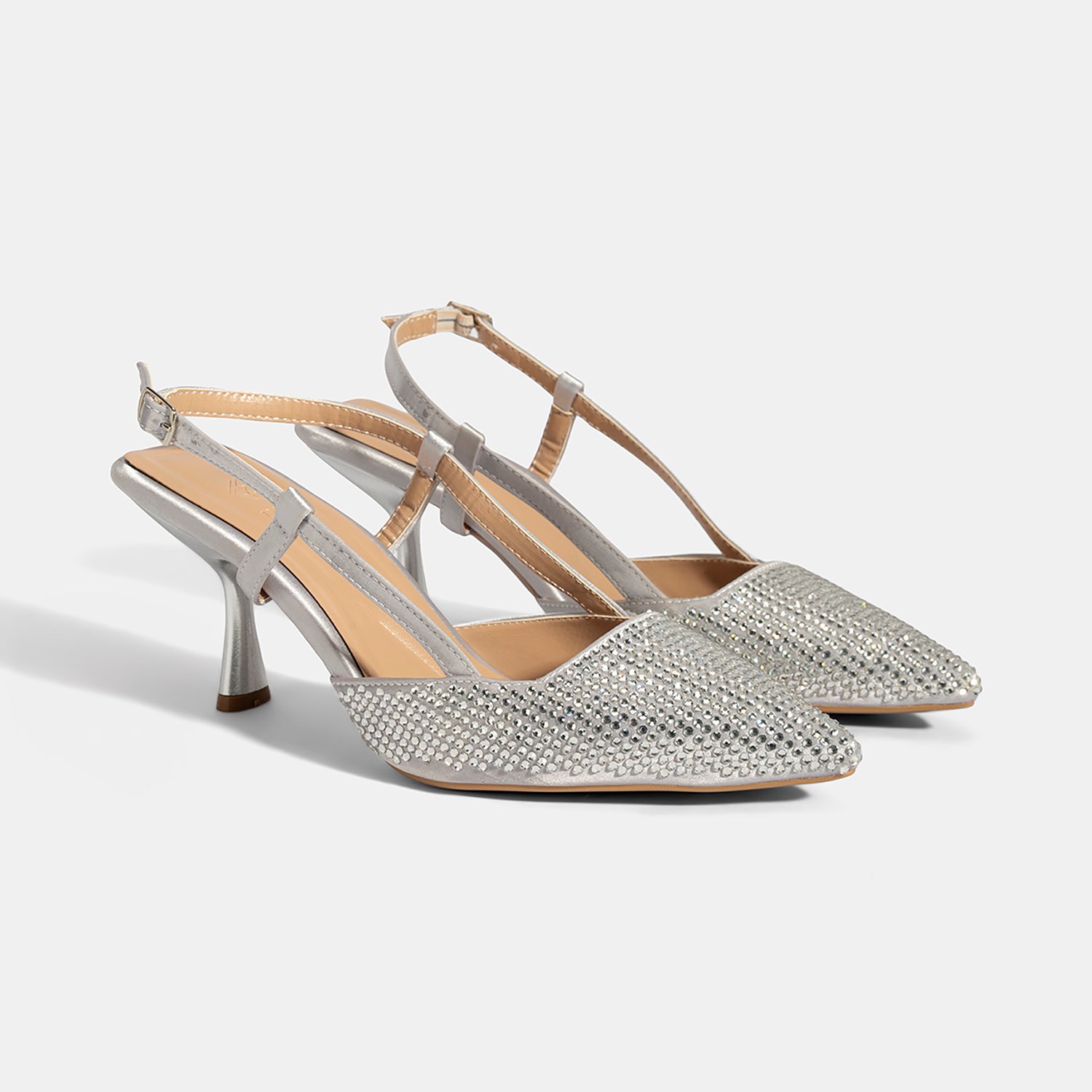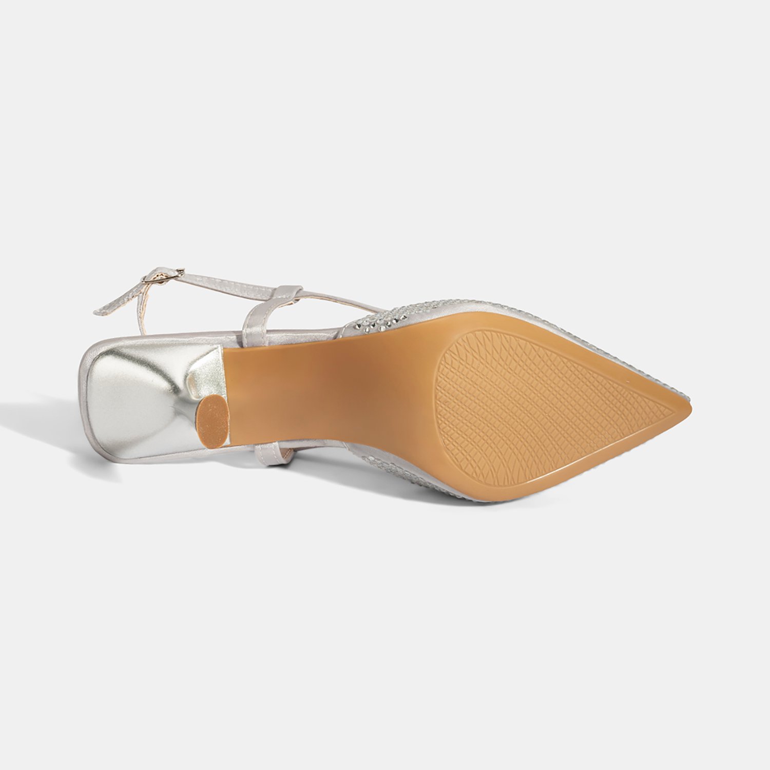 %100 saten tekstil, PU iç tabanlı, PU astarlı, neolit tabanlı, sivri burunlu, ayarlanabilir metal tokalı, arkası açık kadın abiye ayakkabı.