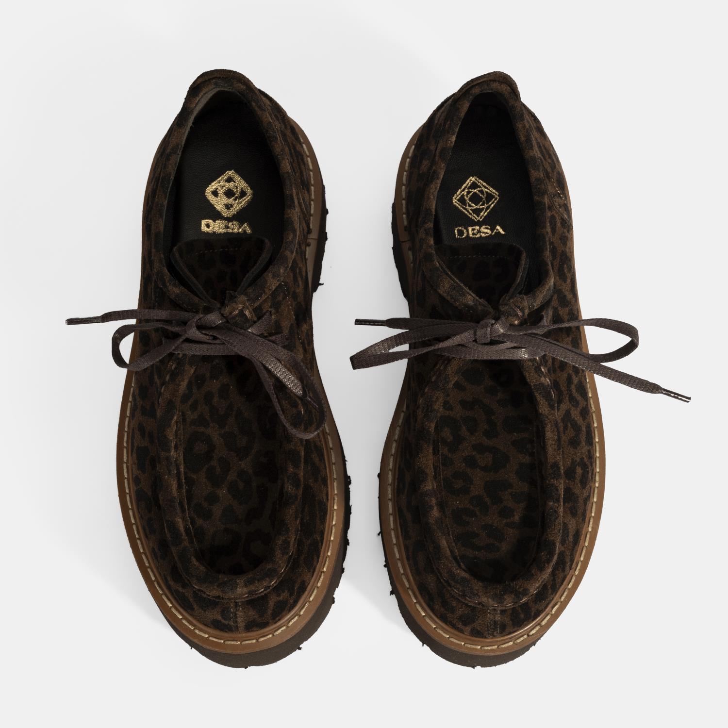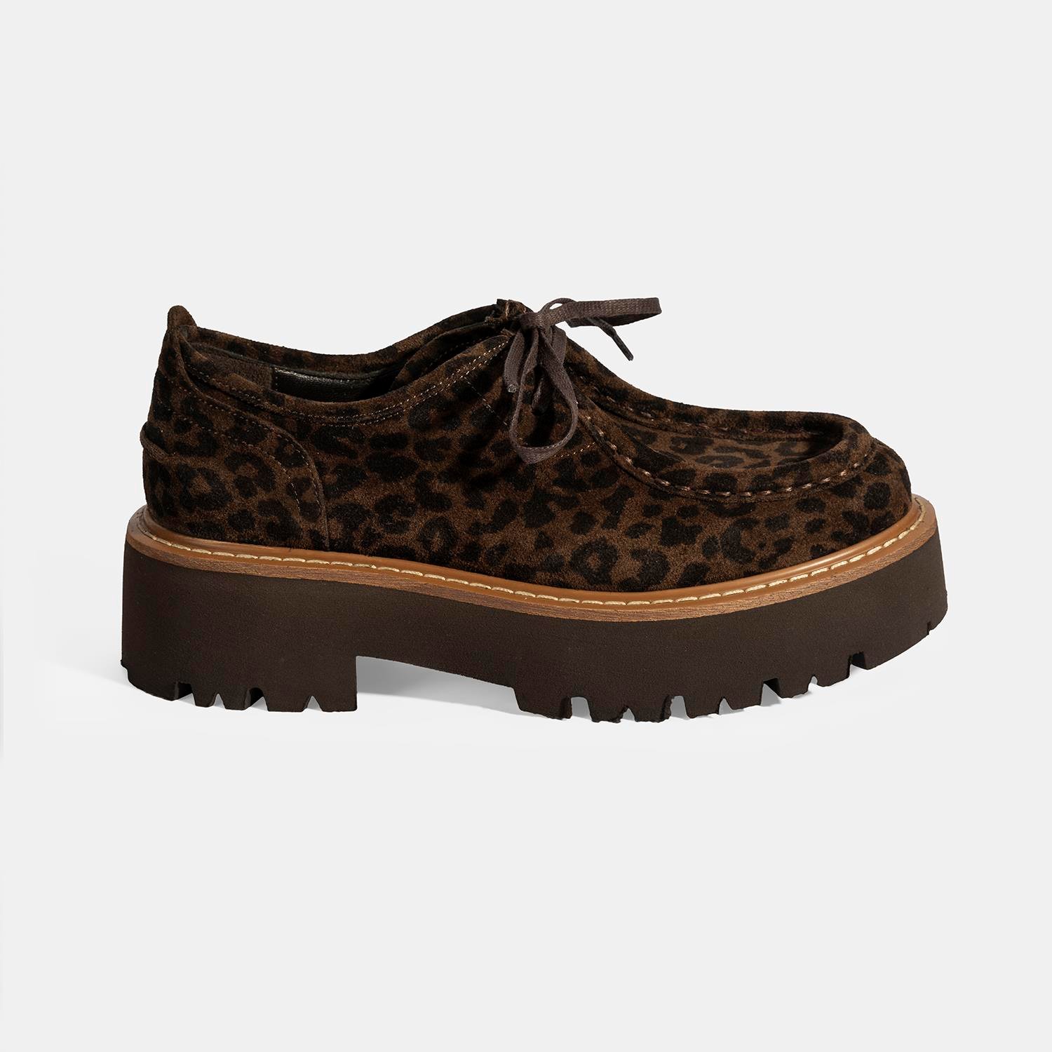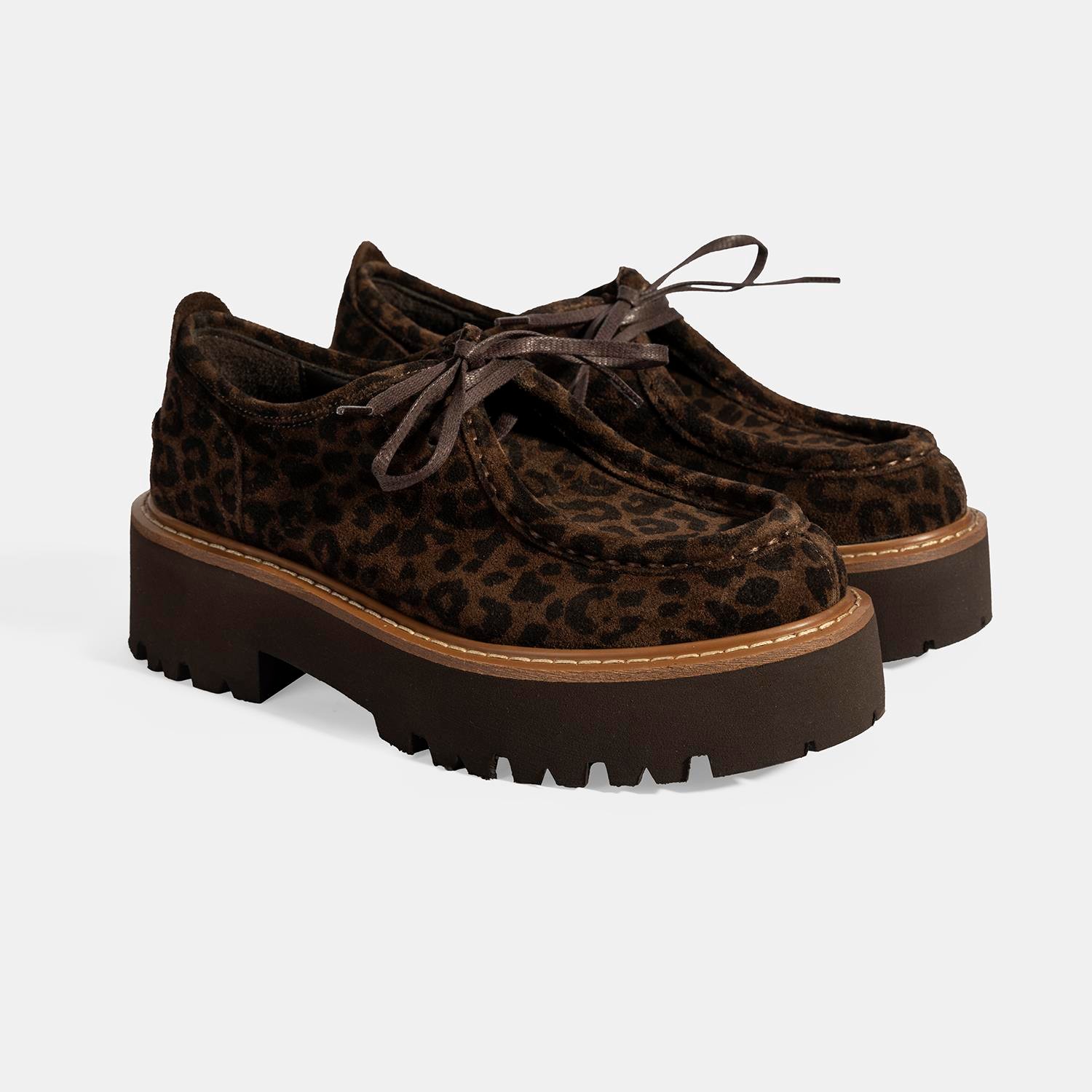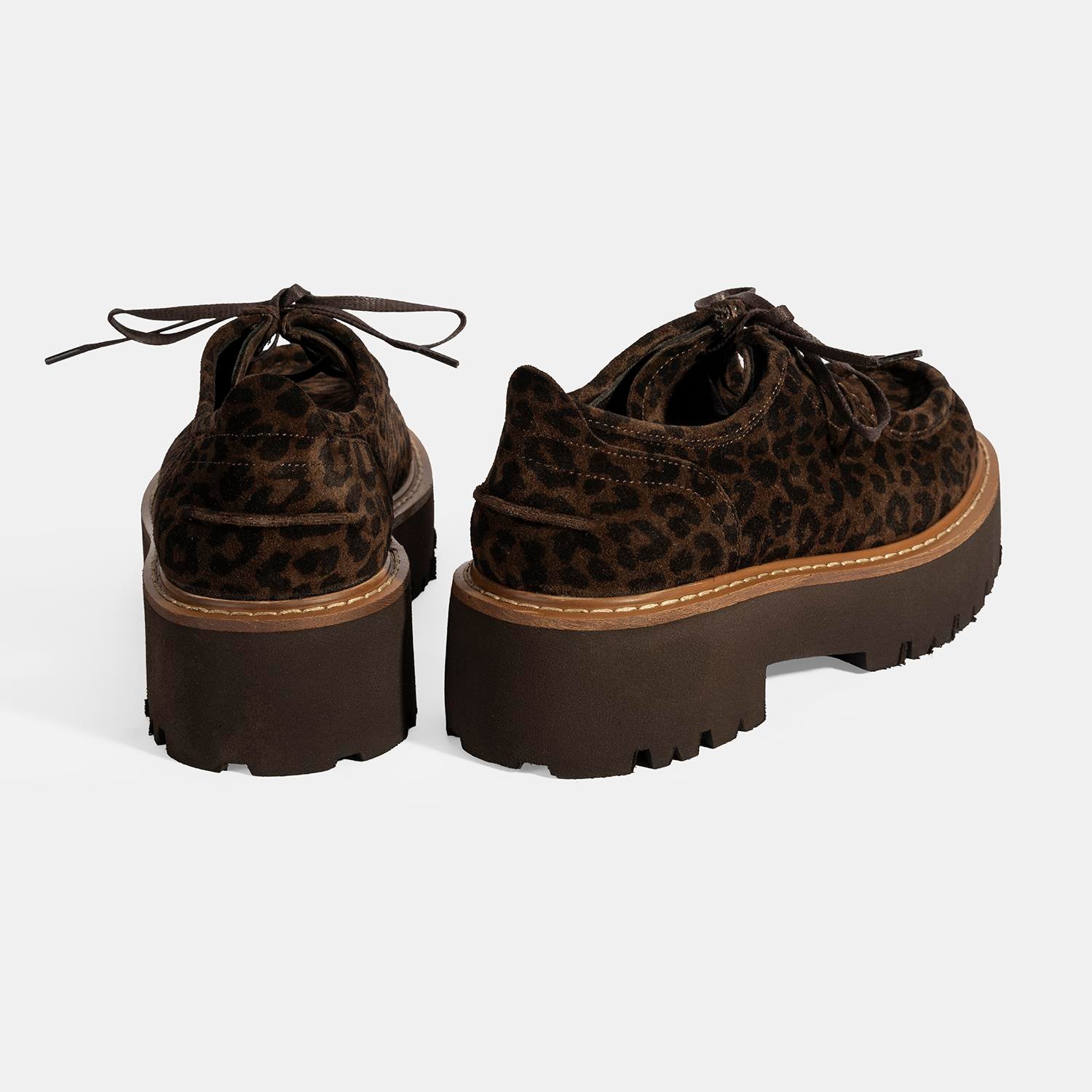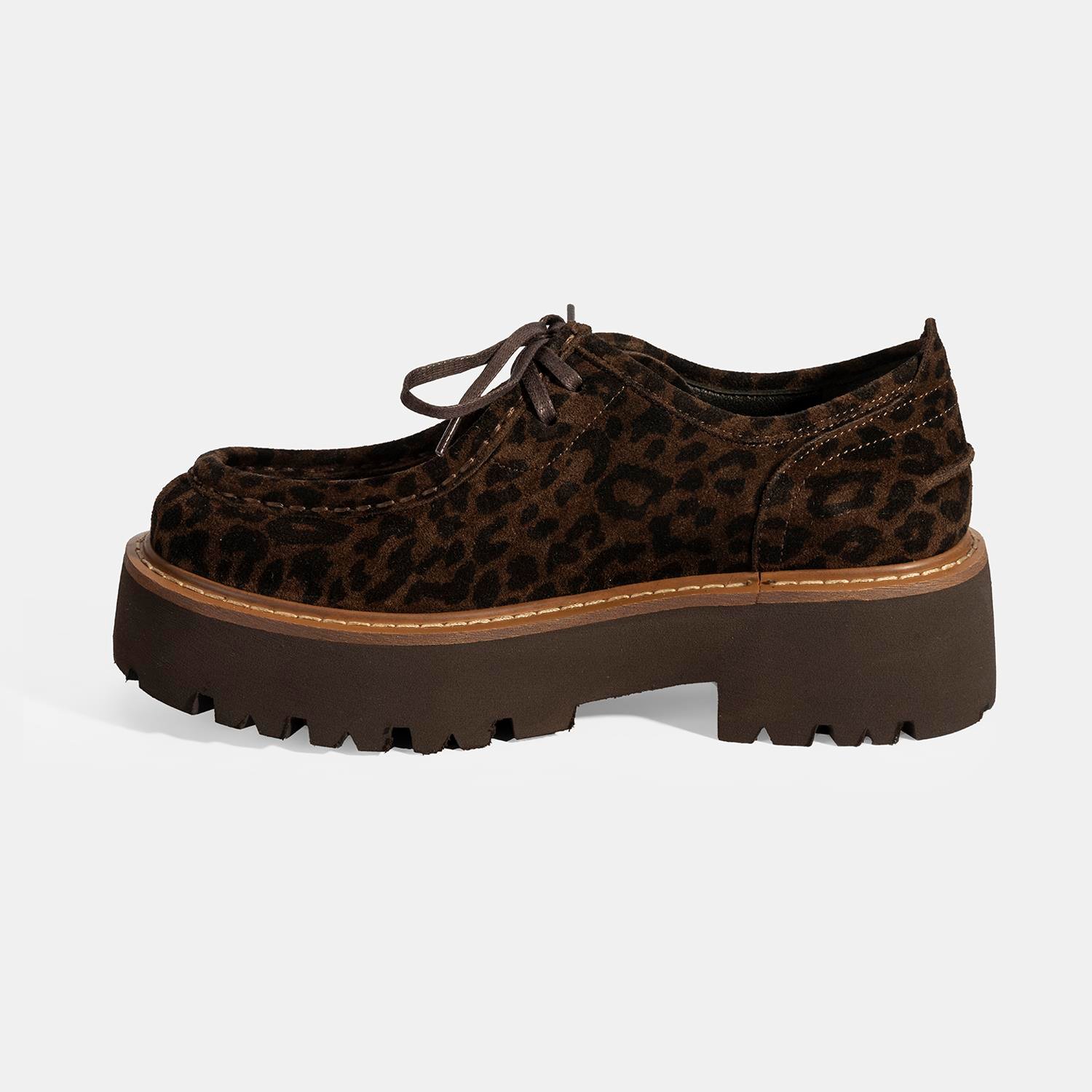 %100 leopar baskılı süet deri, deri iç tabanlı, termo tabanlı, bağcıklı kadın ayakkabı. Topuk yüksekliği: 5 cm.