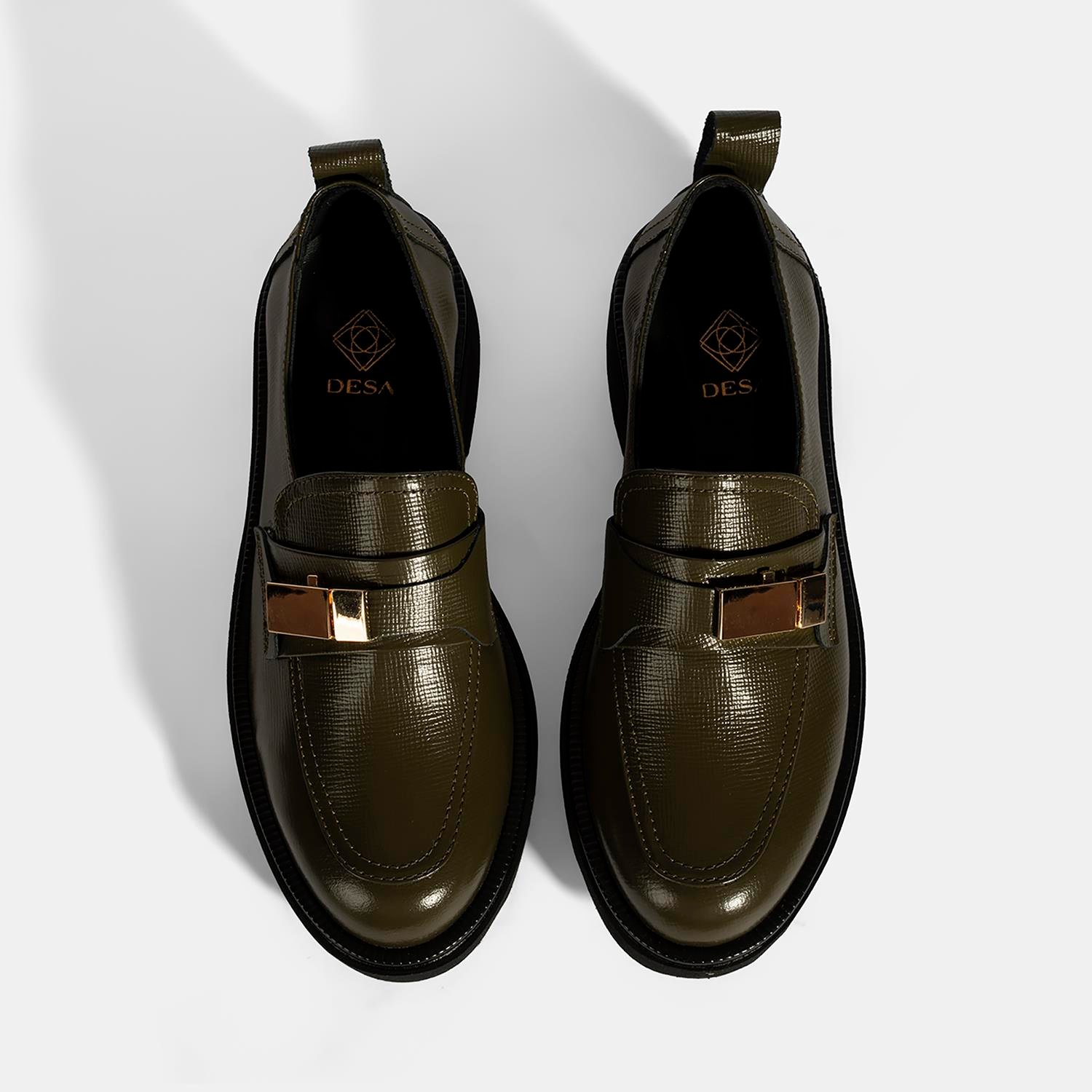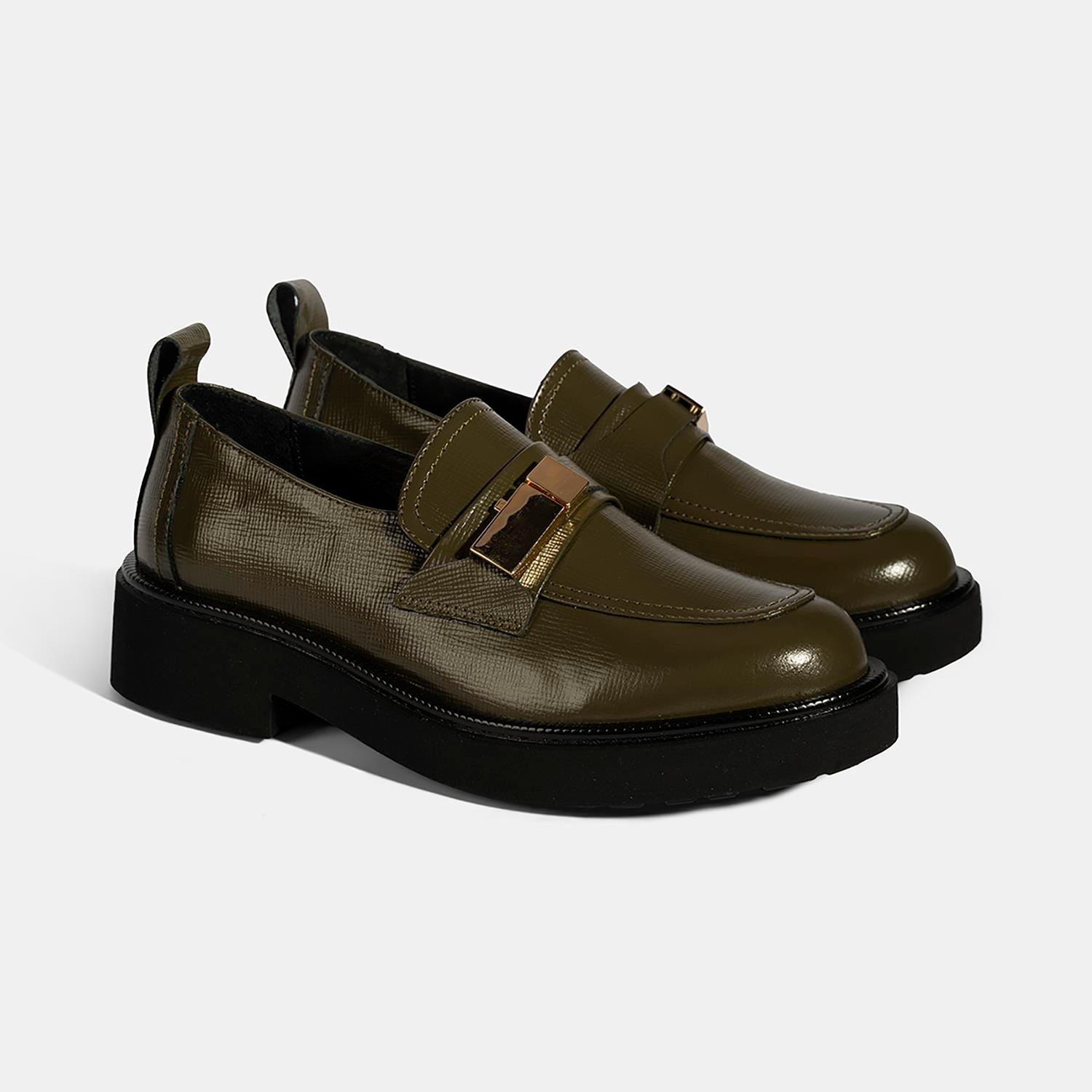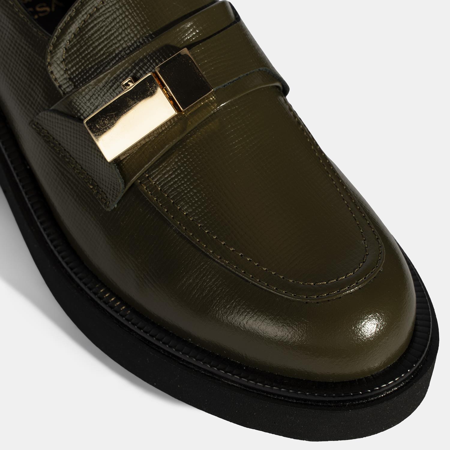 Kadın Yeşil Metal Toka Aksesuarlı Deri Loafer