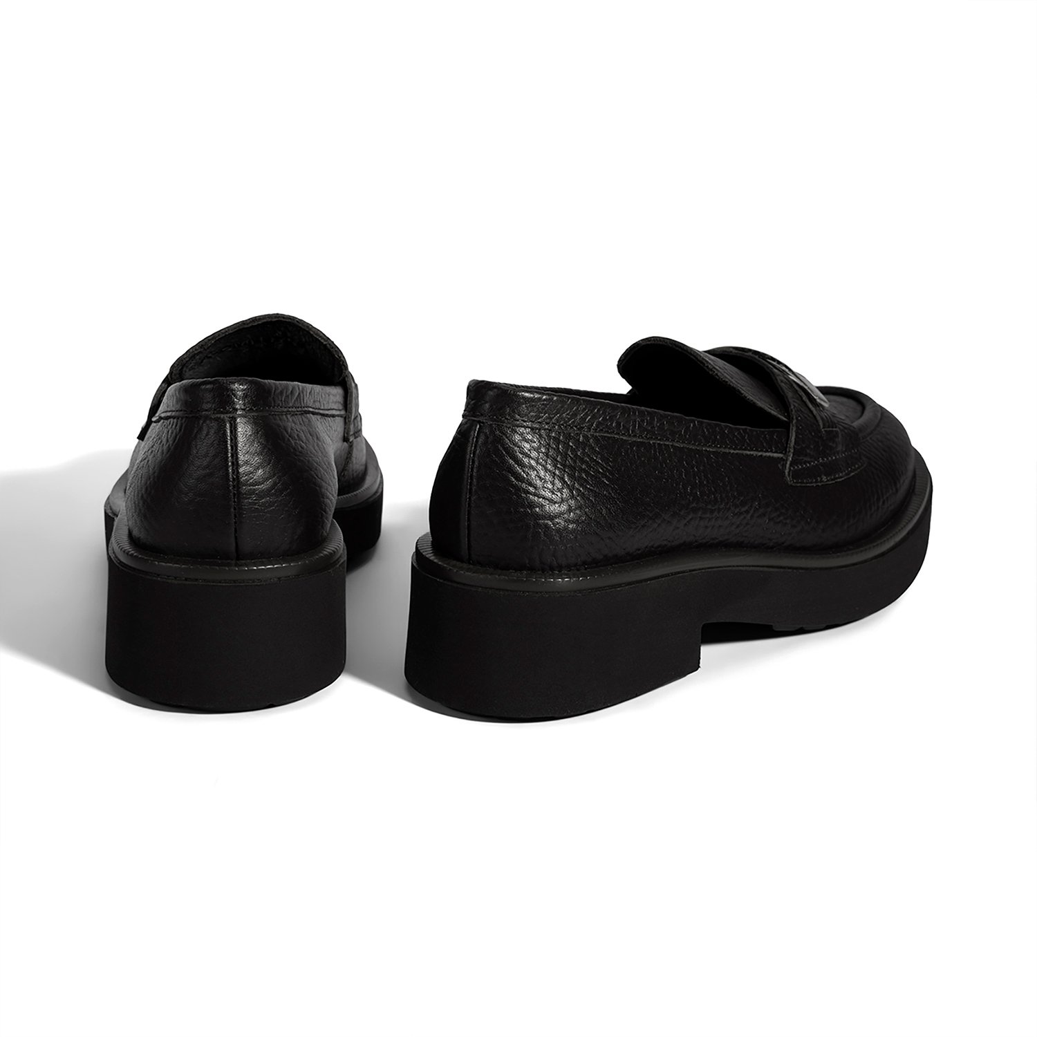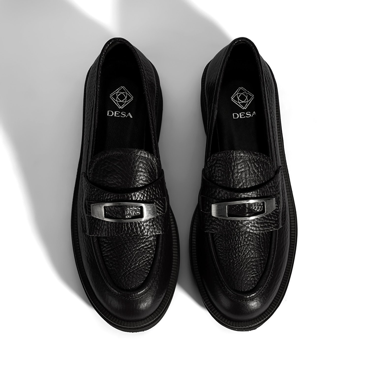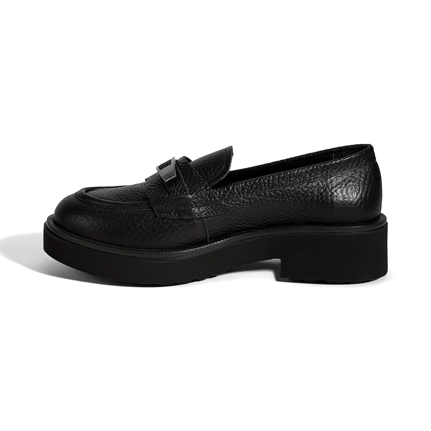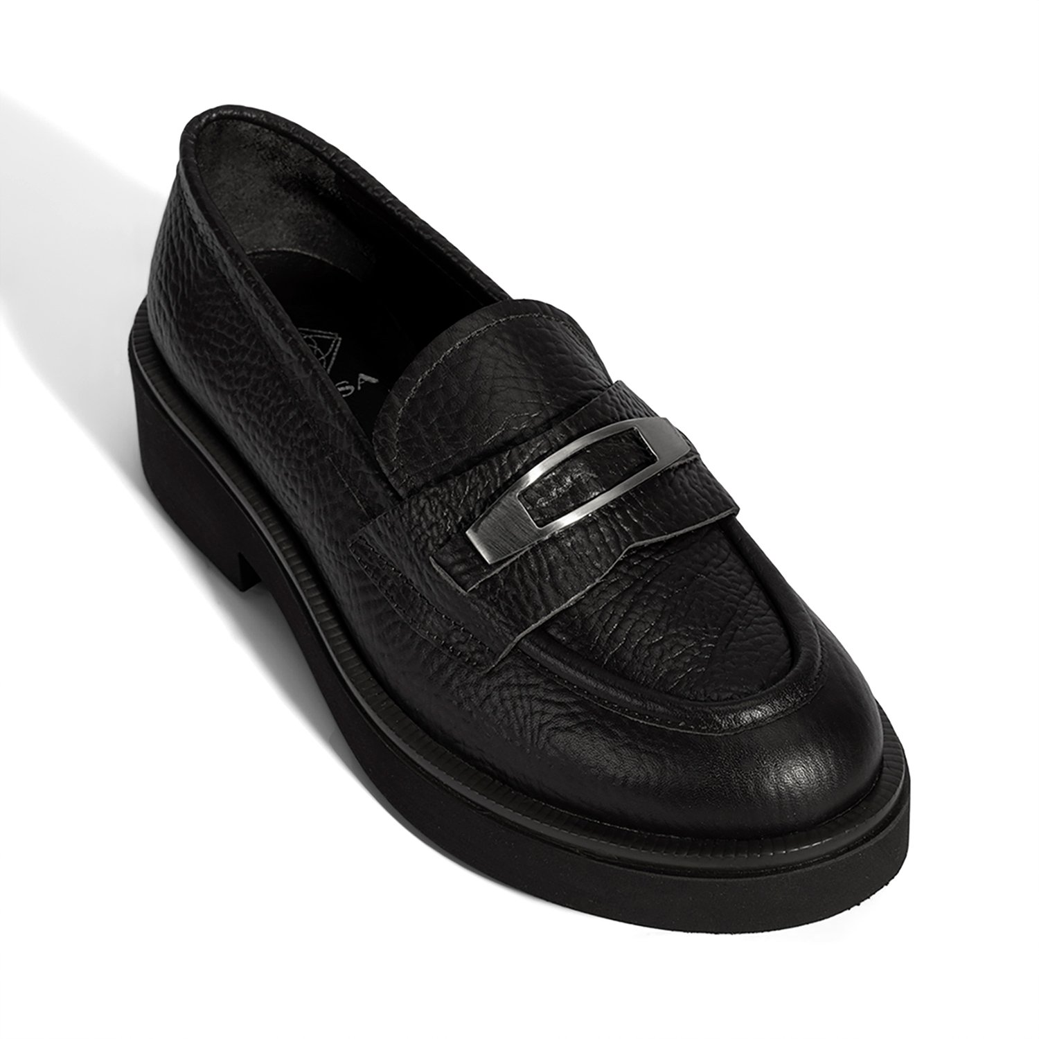 %100 deri, deri iç tabanlı, deri astarlı, metal toka detaylı, termo tabanlı kadın loafer. Topuk yüksekliği 4 cm.