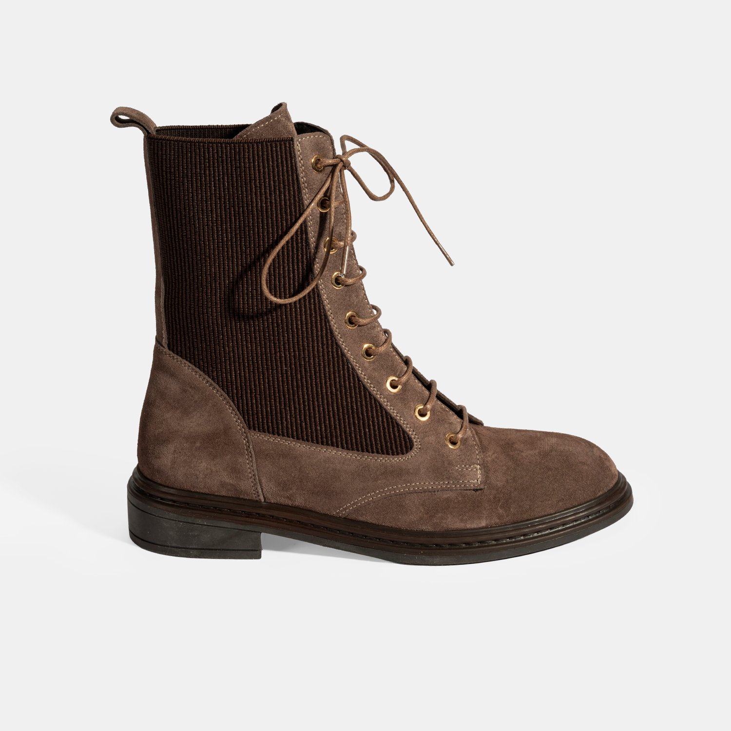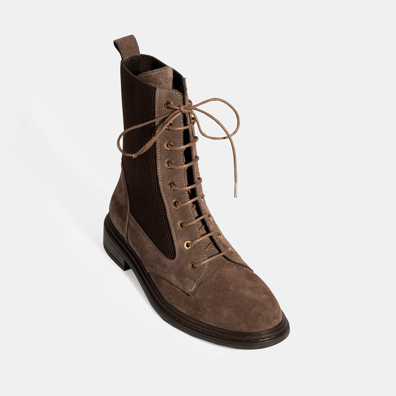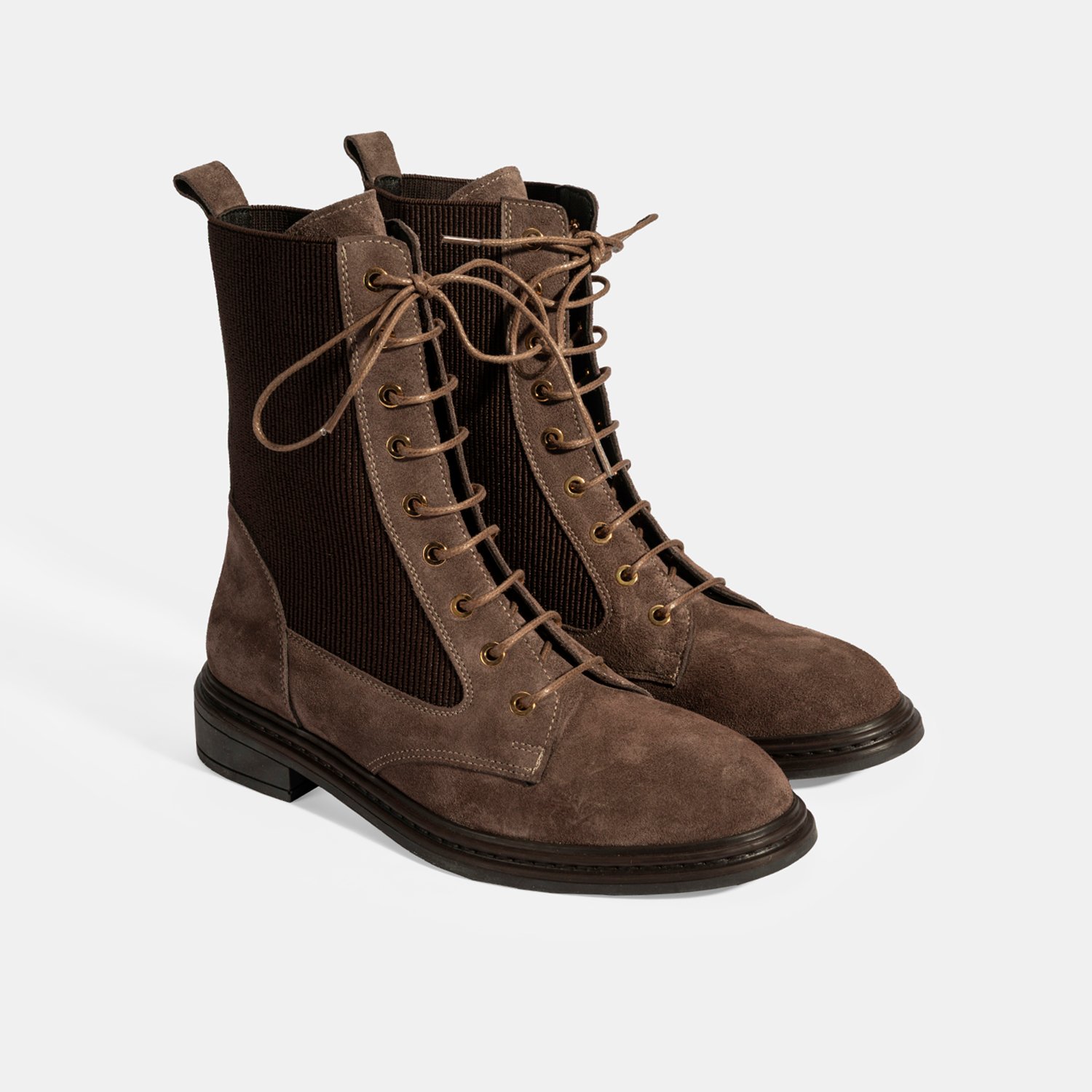 %100 süet deri, deri iç tabanlı, sıcak tekstil astarlı, lastik detaylı, termo tabanlı kadın bağcıklı bot. Topuk yüksekliği: 3 cm.