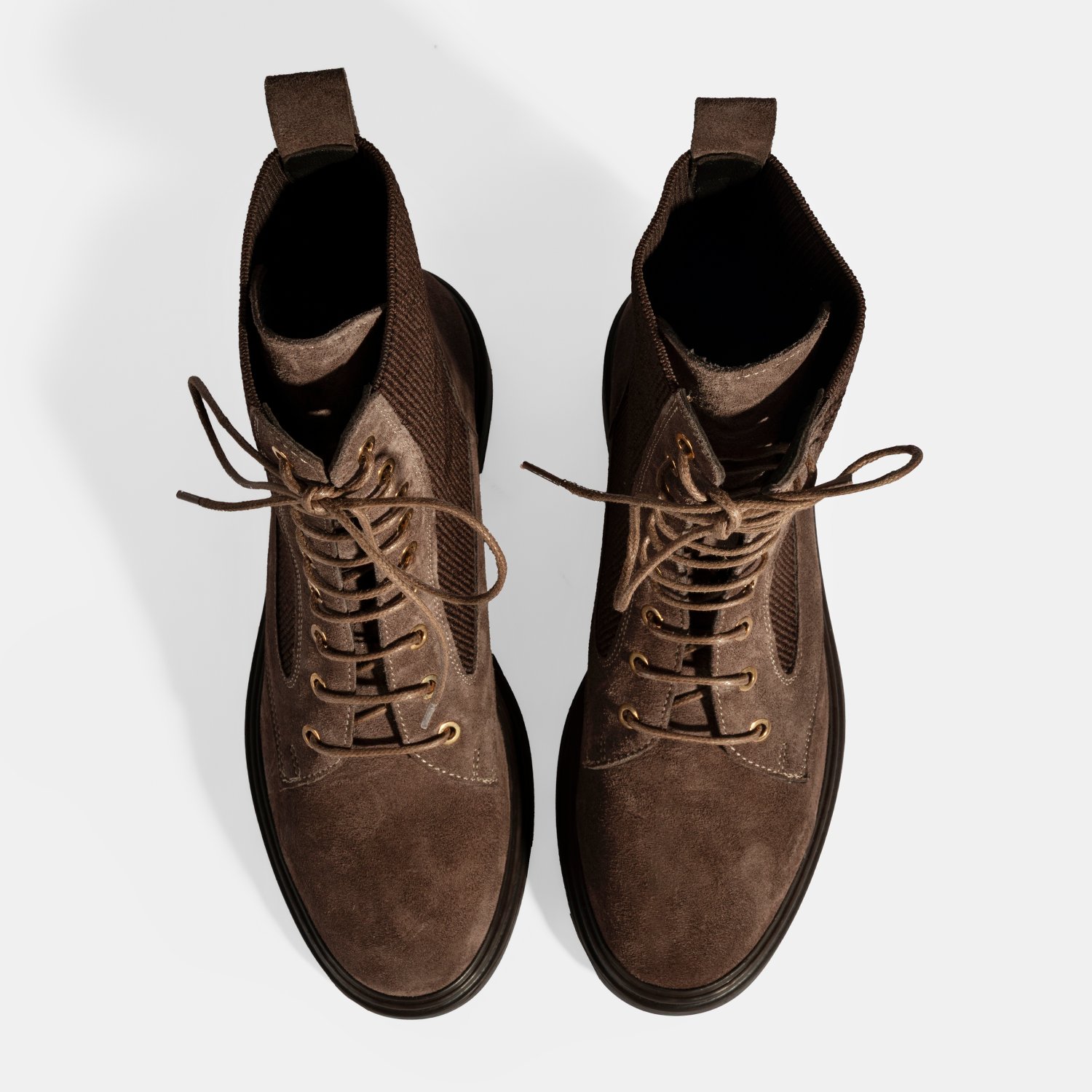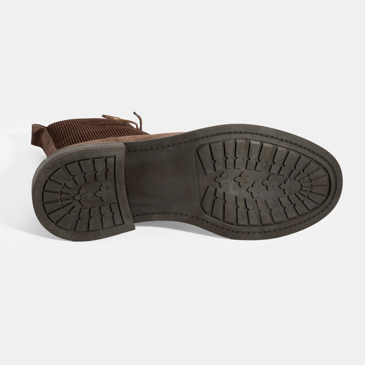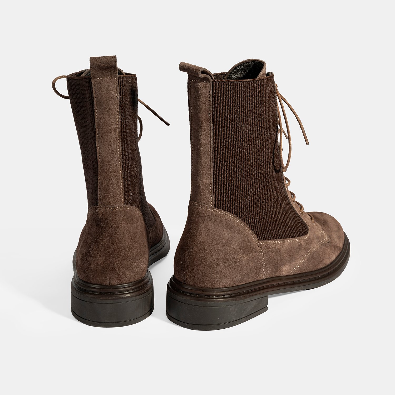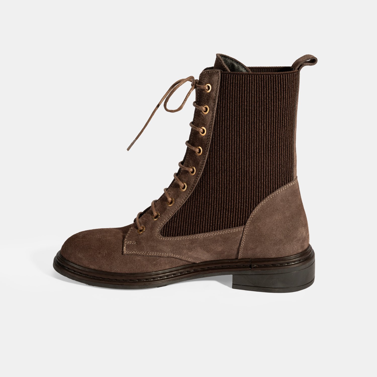%100 süet deri, deri iç tabanlı, sıcak tekstil astarlı, lastik detaylı, termo tabanlı kadın bağcıklı bot. Topuk yüksekliği: 3 cm.