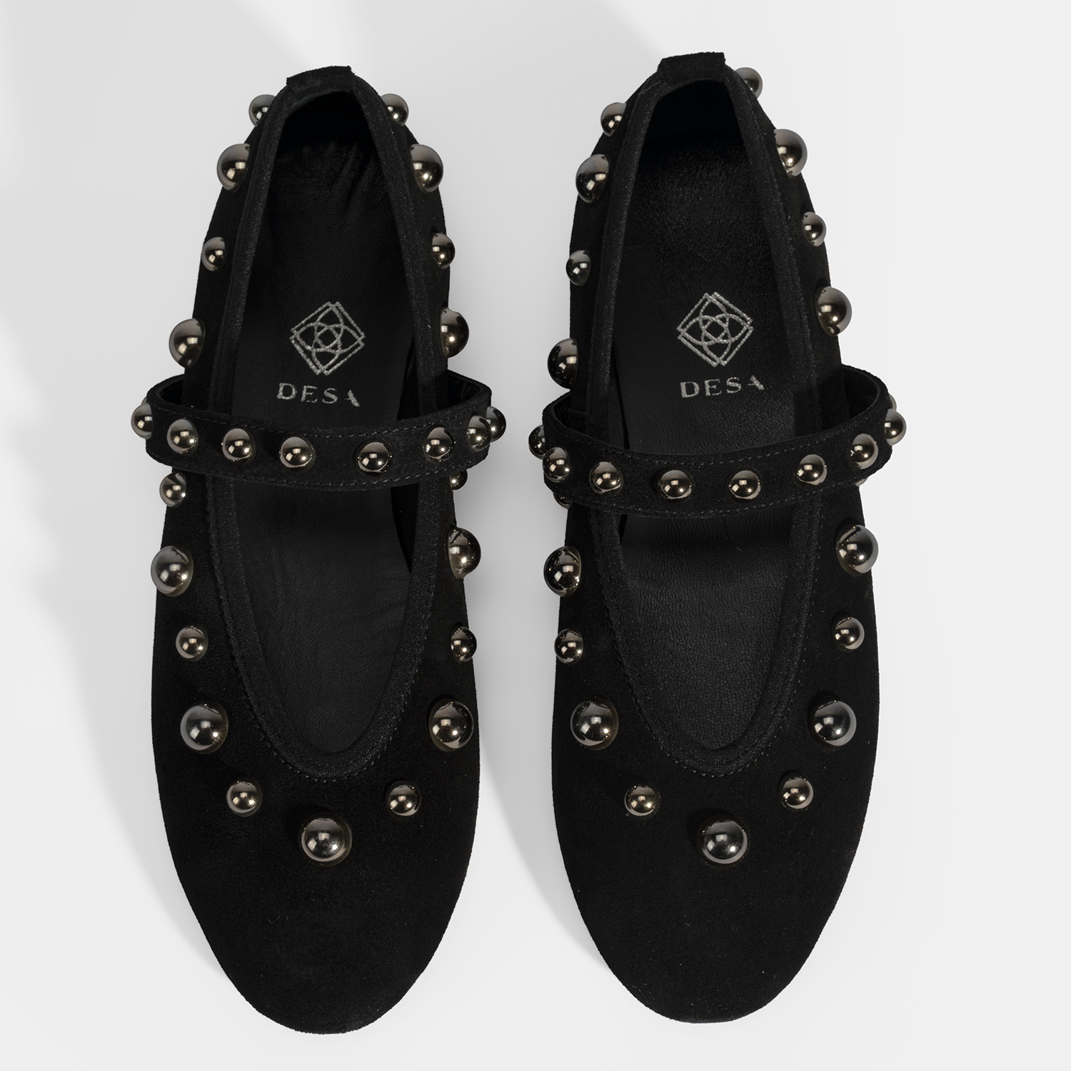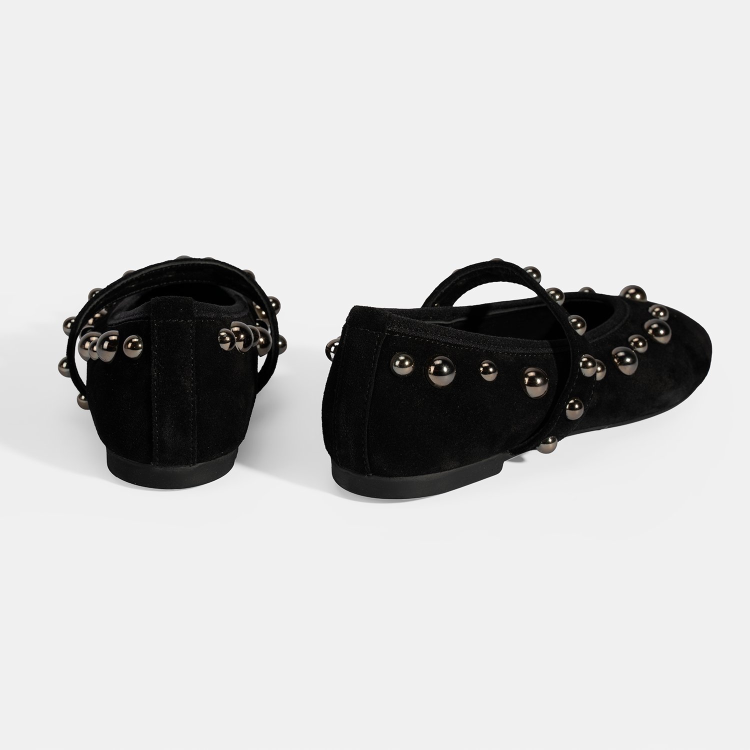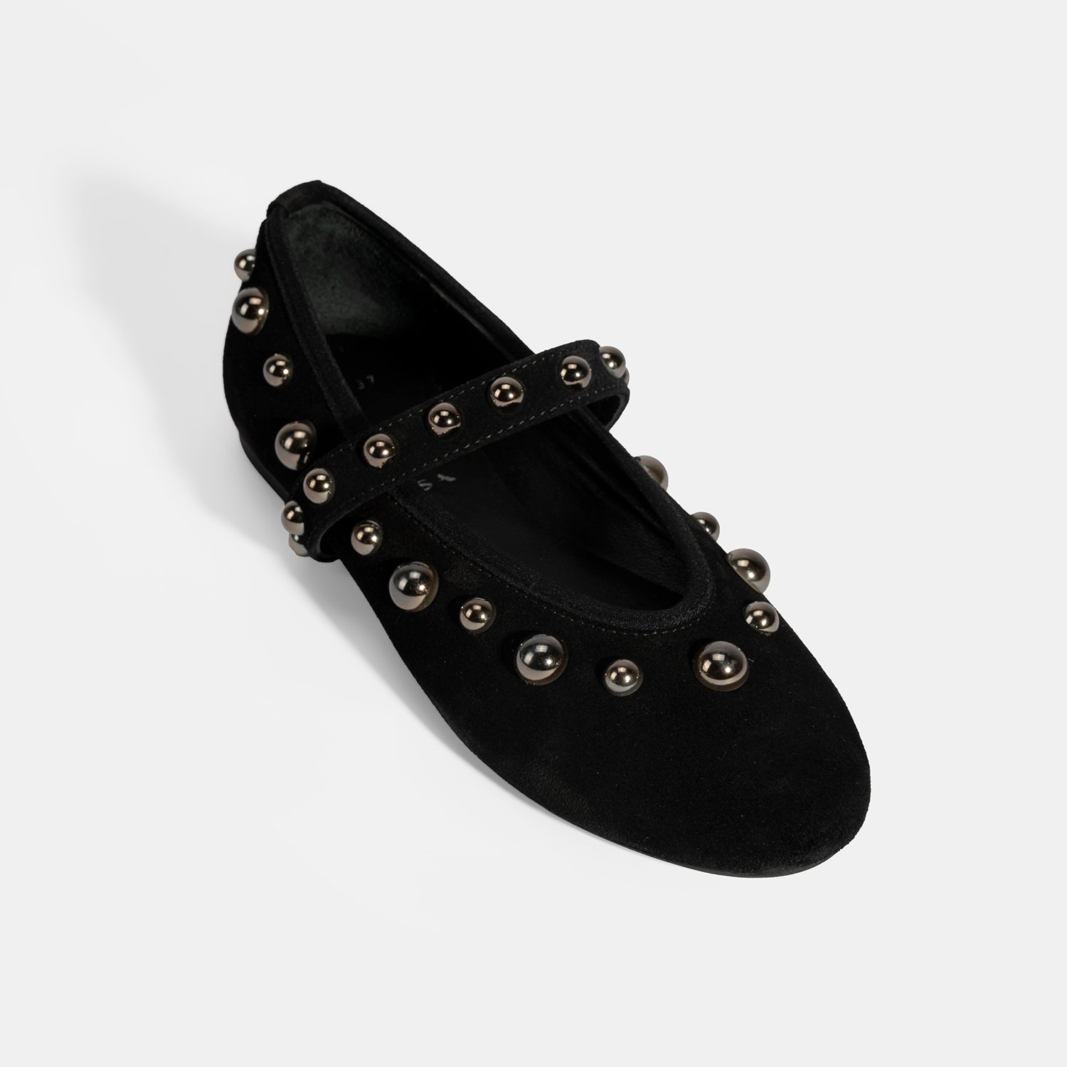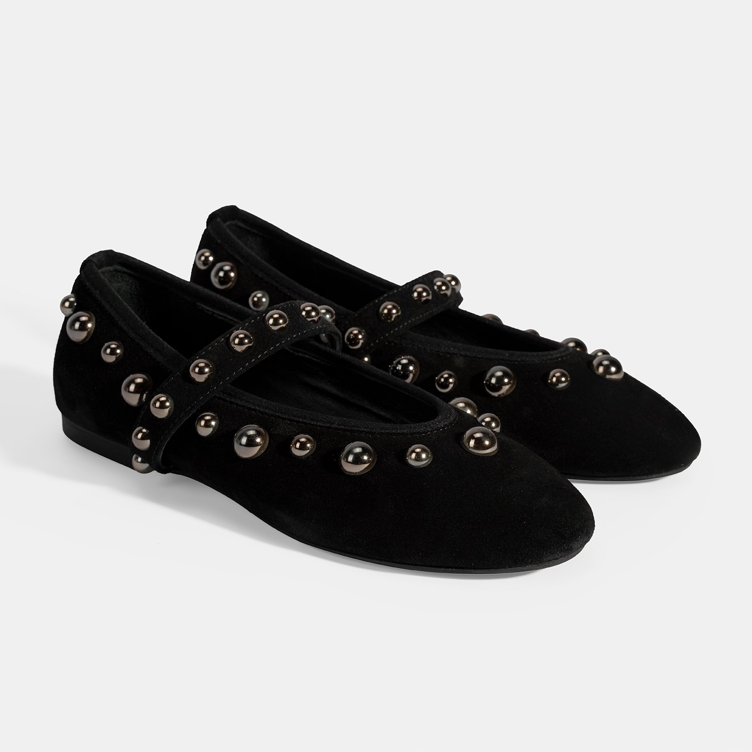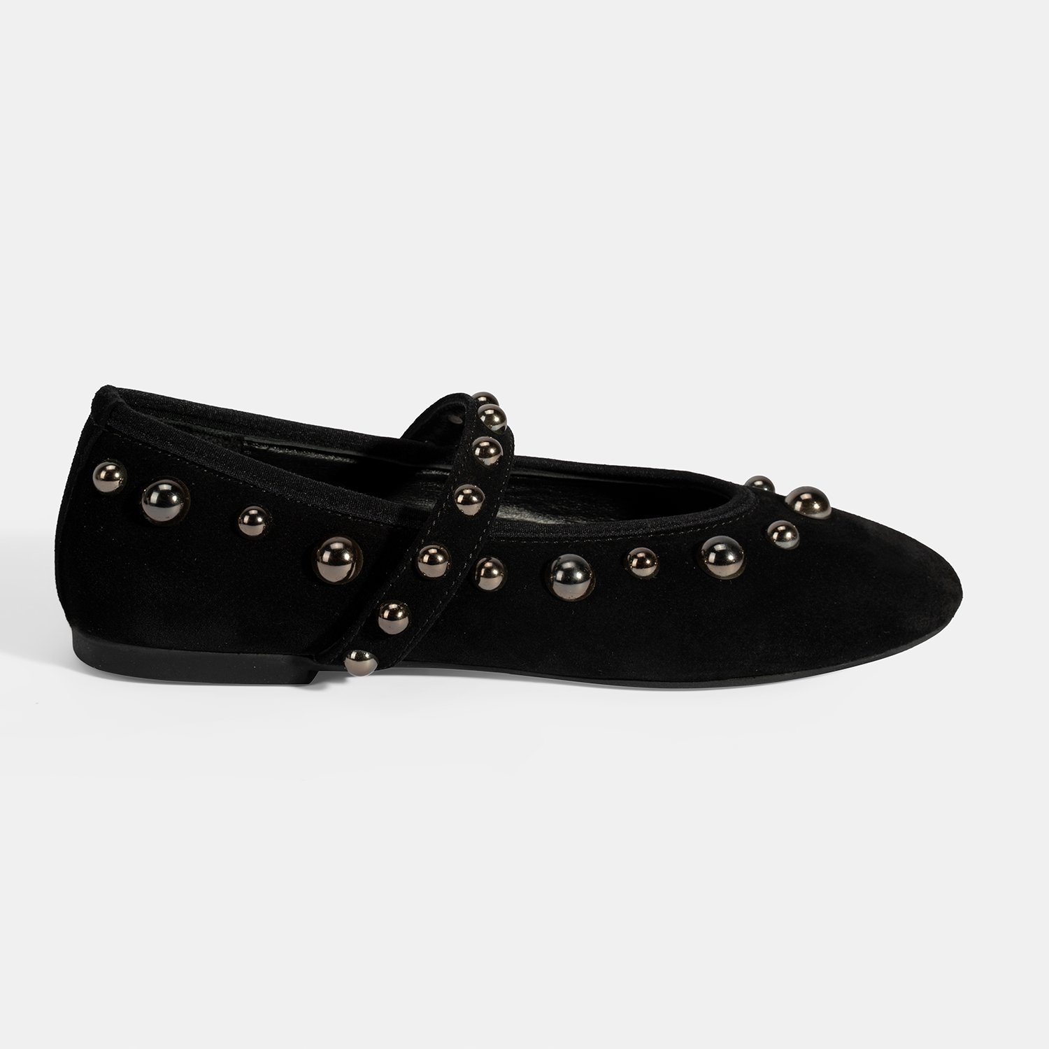 %100 süet deri, deri iç tabanlı, deri astarlı, metal trok detaylı, TPU tabanlı, yuvarlak burunlu, ayarlanabilir metal tokalı kadın Mary Jane babet. Topuk yüksekliği: 1 cm.