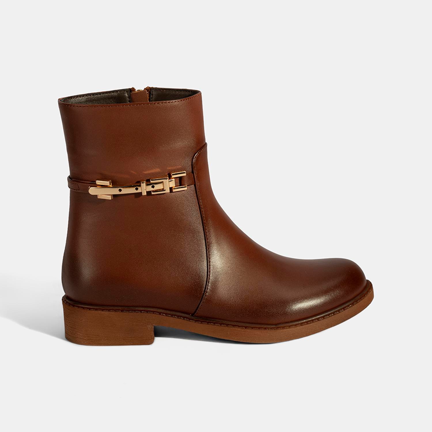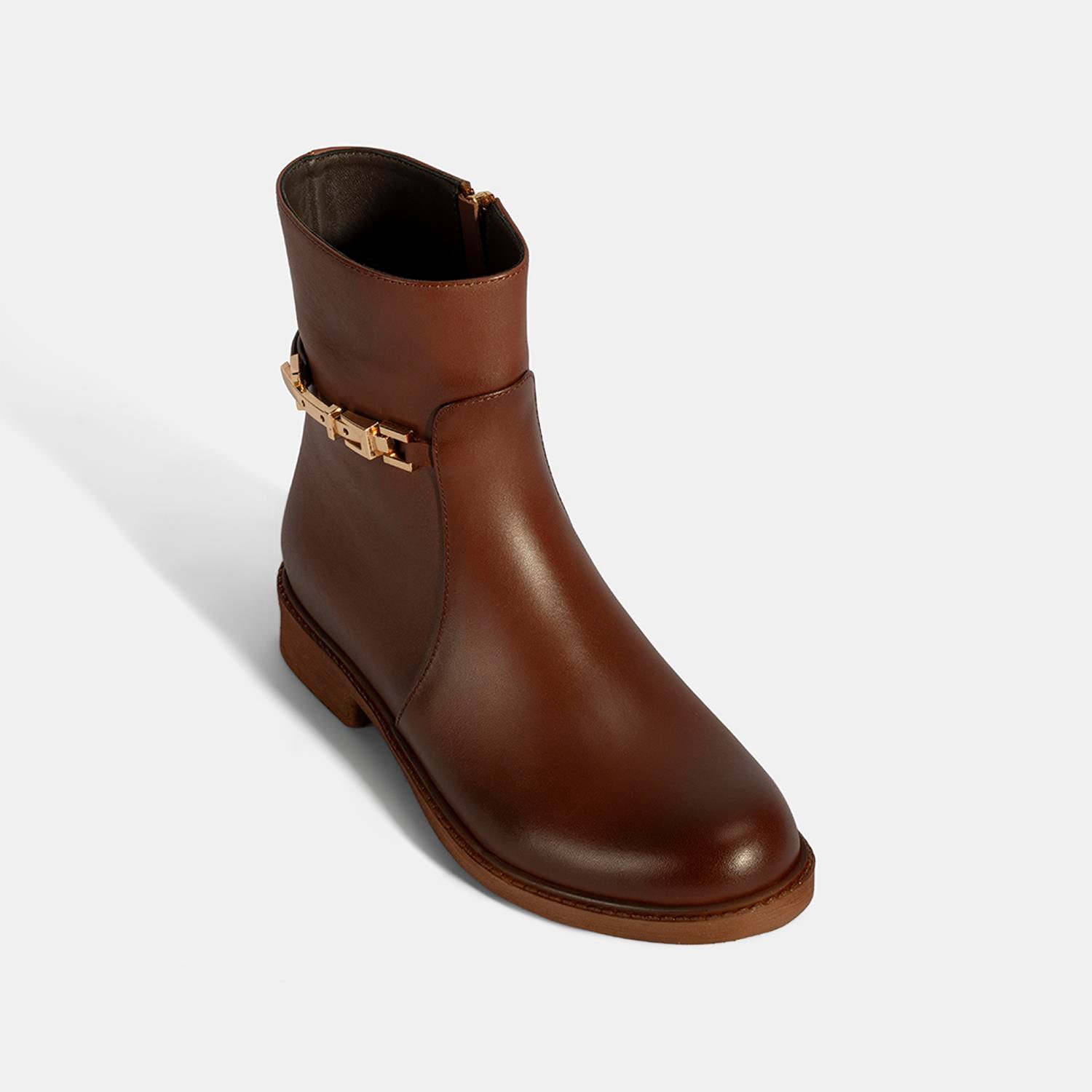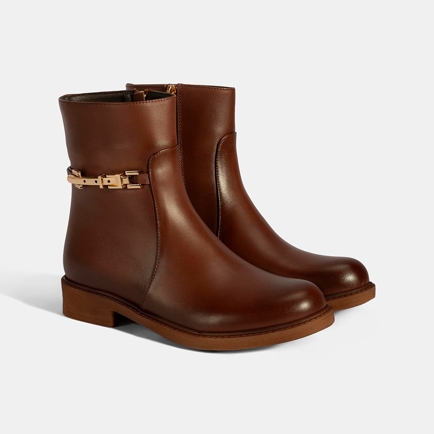 %100 deri, deri iç tabanlı, tekstil sıcak astarlı, metal kemer aksesuar detaylı, termo tabanlı, içten fermuarlı kadın bot. Topuk yüksekliği 4 cm’dir.