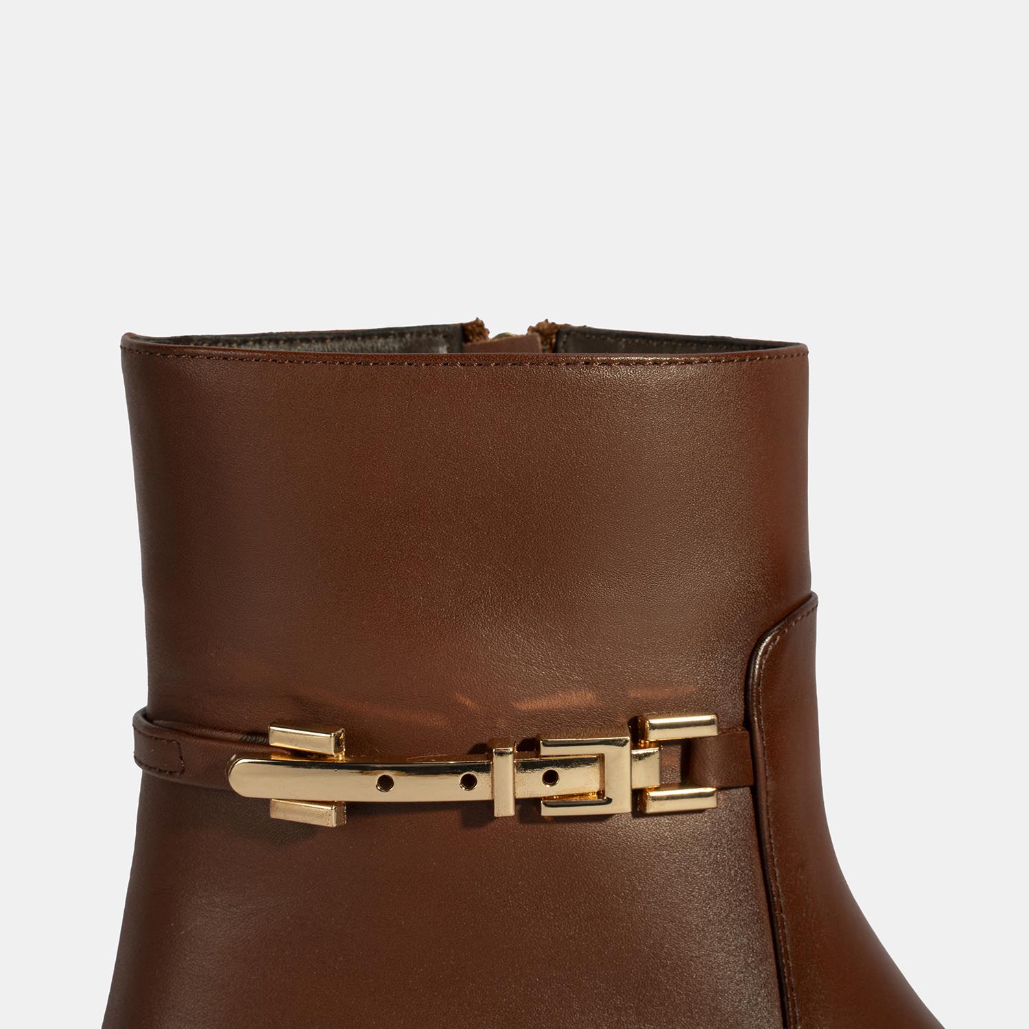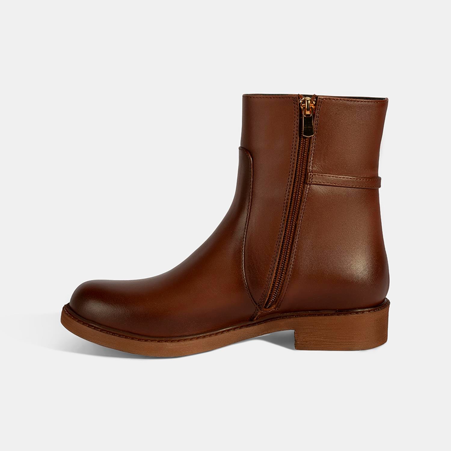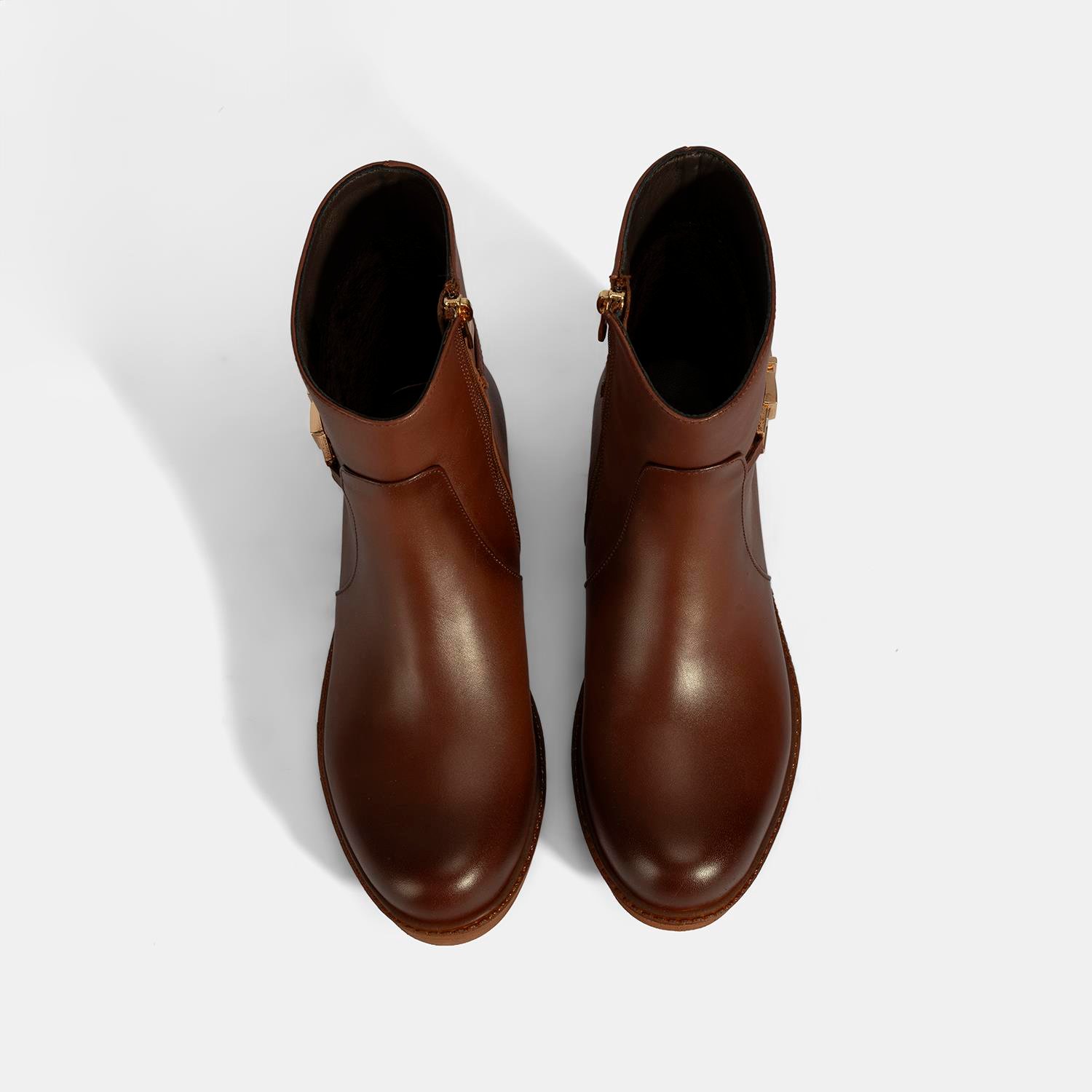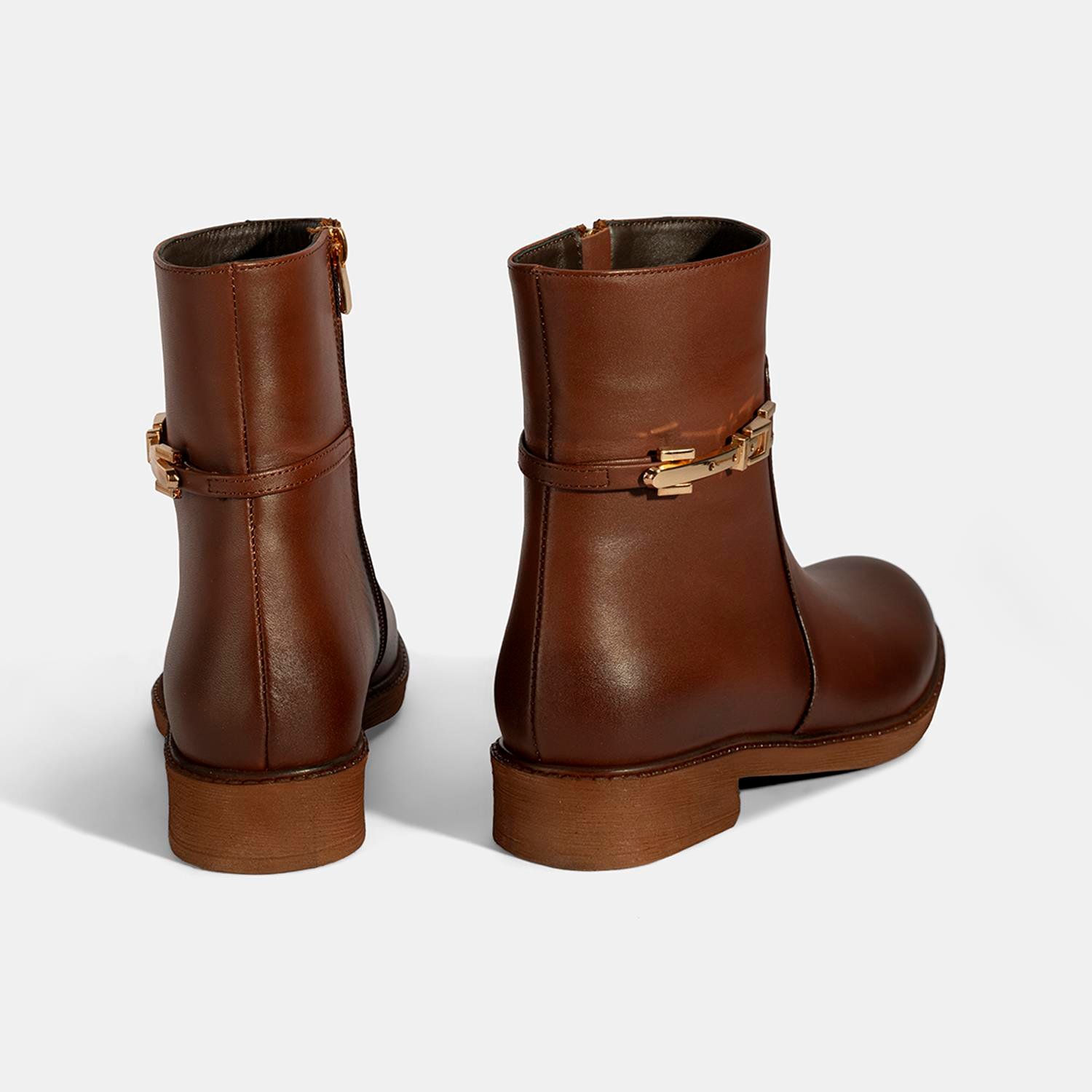 %100 deri, deri iç tabanlı, tekstil sıcak astarlı, metal kemer aksesuar detaylı, termo tabanlı, içten fermuarlı kadın bot. Topuk yüksekliği 4 cm’dir.