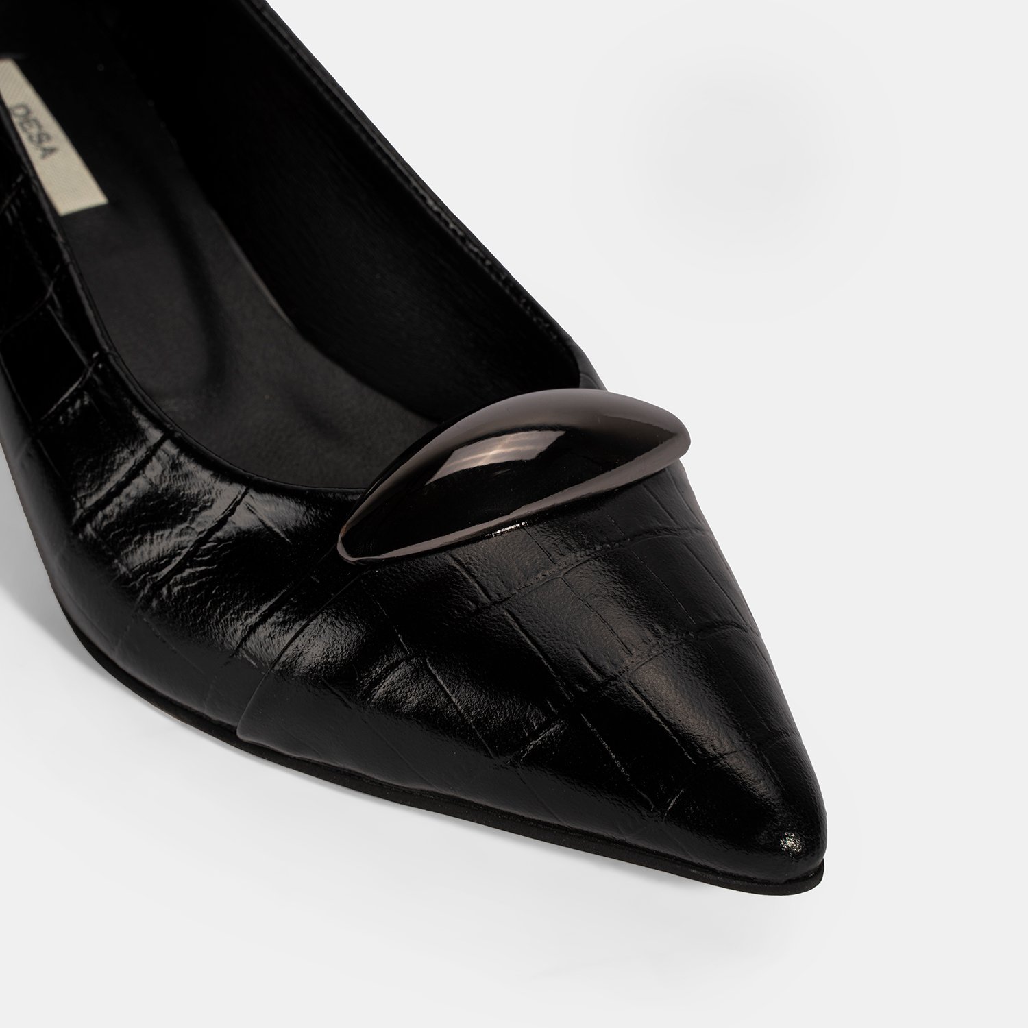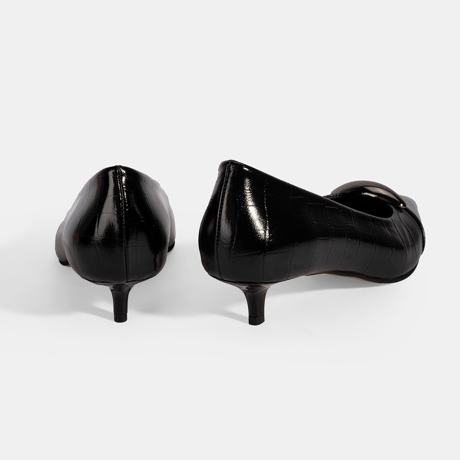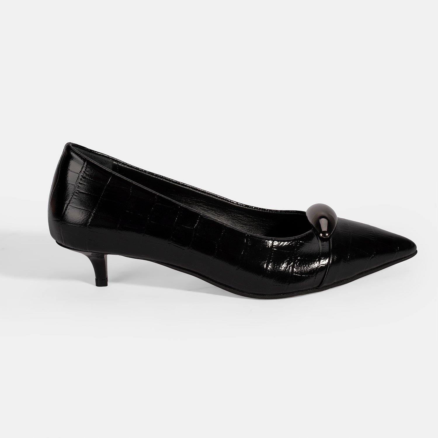 %100 kroko baskılı deri, deri iç tabanlı, deri astarlı, metal aksesuar detaylı, neolit tabanlı, kitten topuklu kadın klasik ayakkabı. Topuk yüksekliği 4,5 cm.