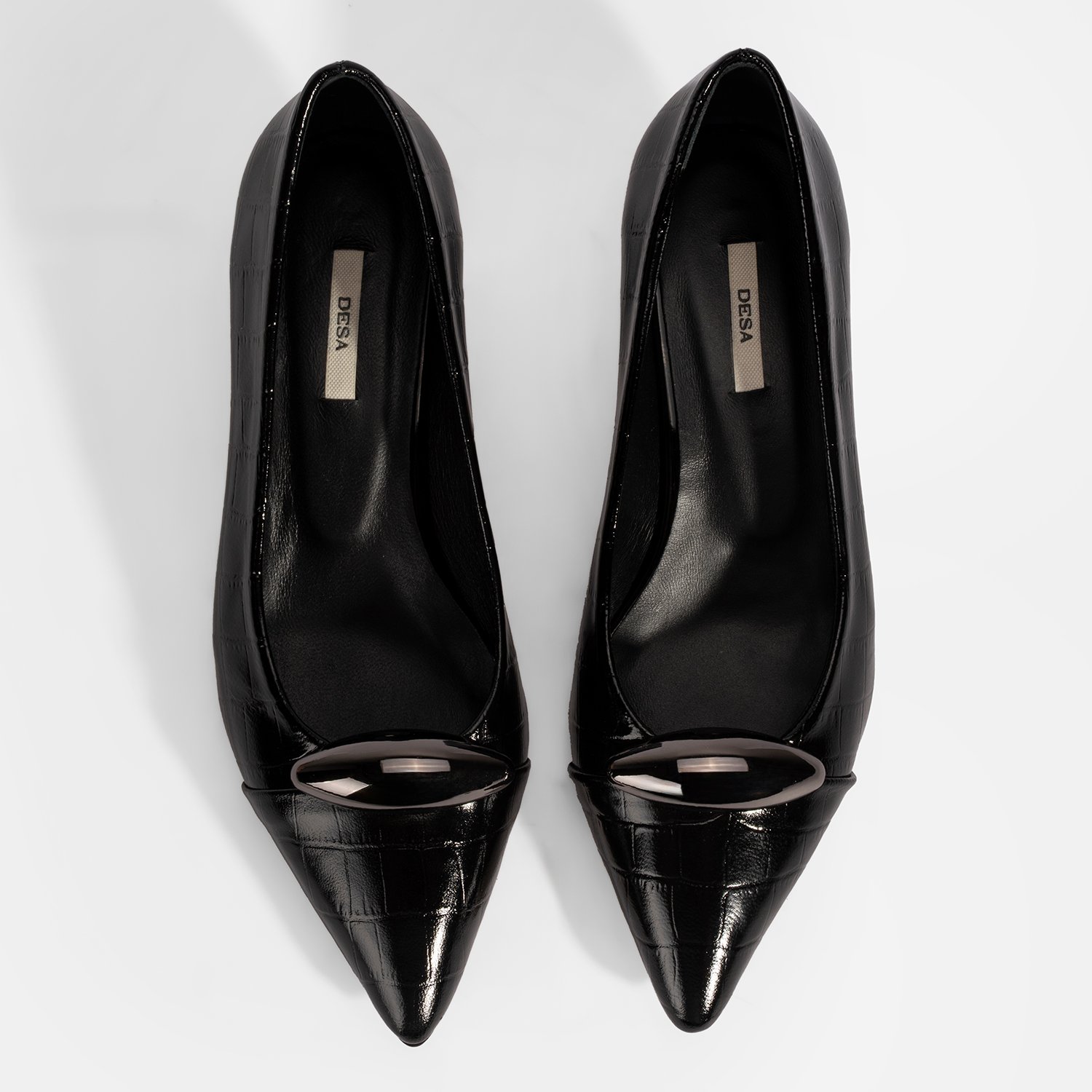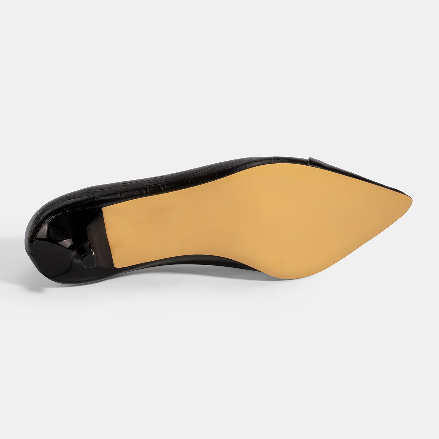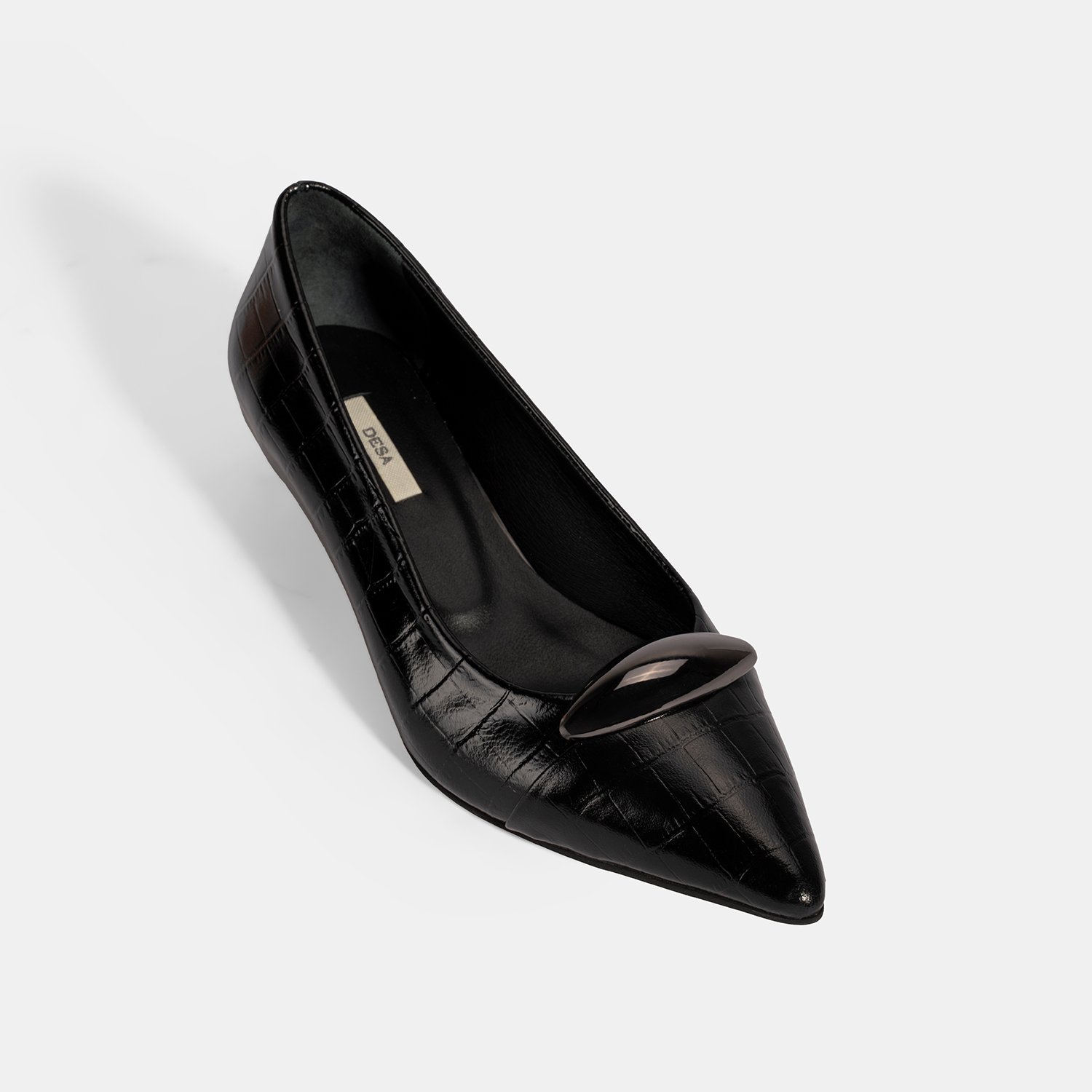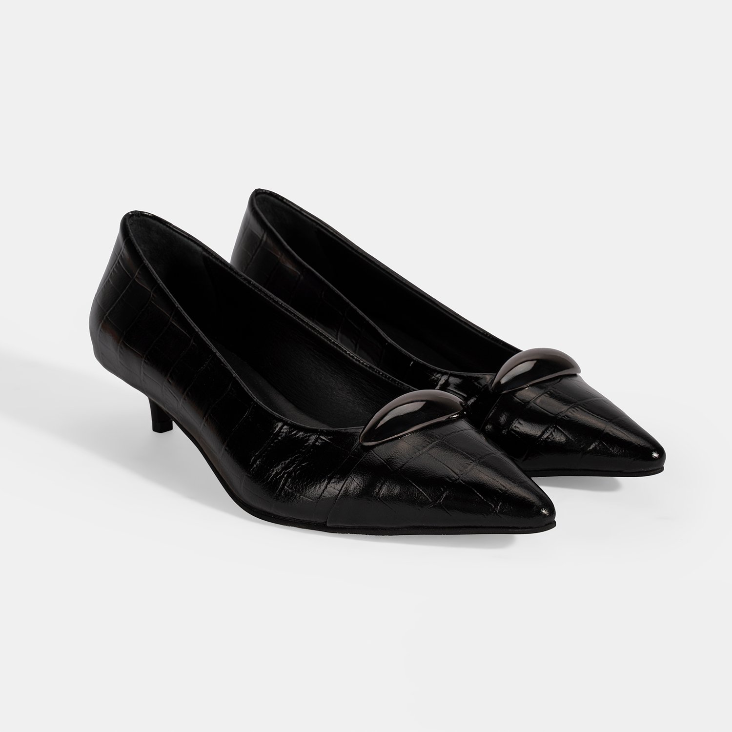 %100 kroko baskılı deri, deri iç tabanlı, deri astarlı, metal aksesuar detaylı, neolit tabanlı, kitten topuklu kadın klasik ayakkabı. Topuk yüksekliği 4,5 cm.
