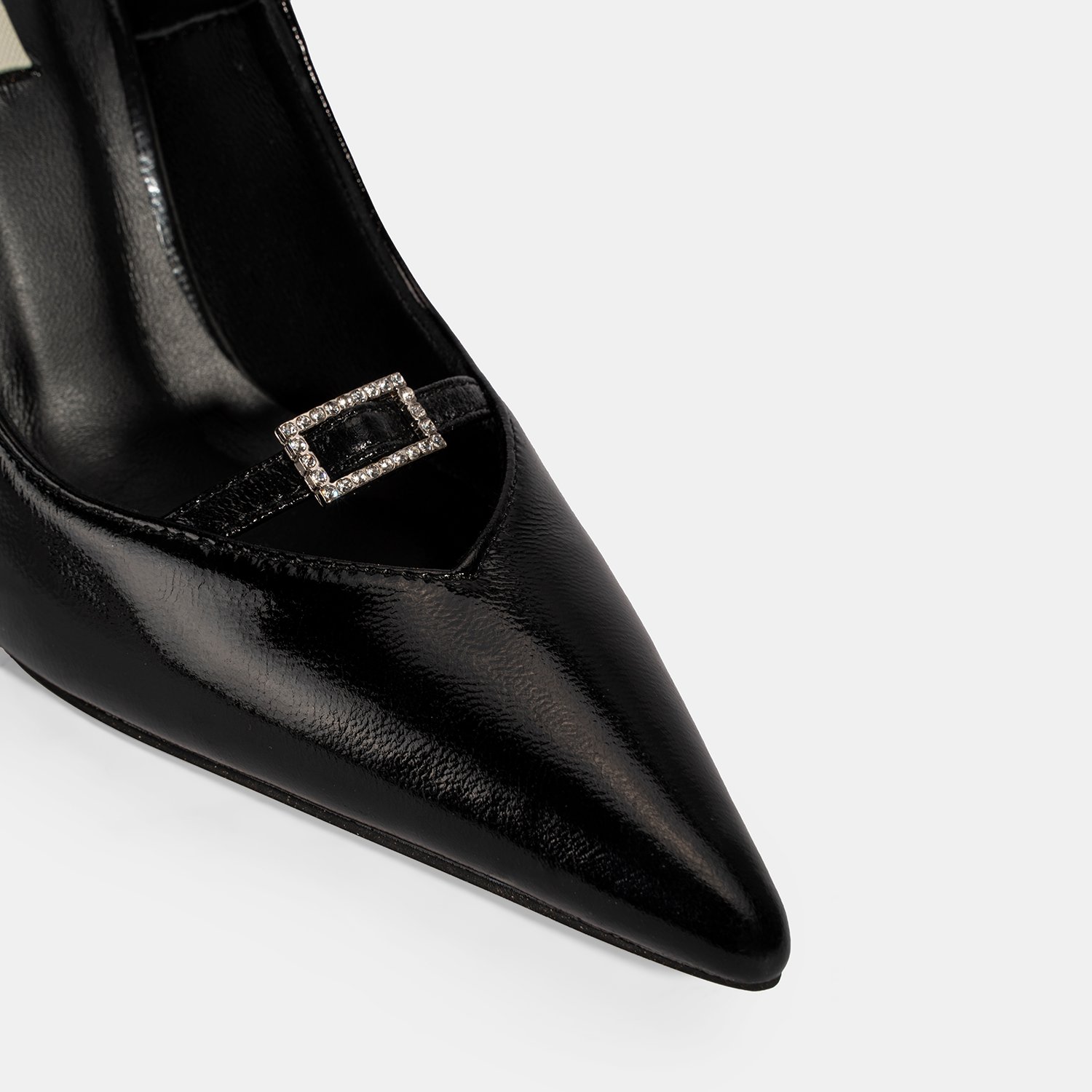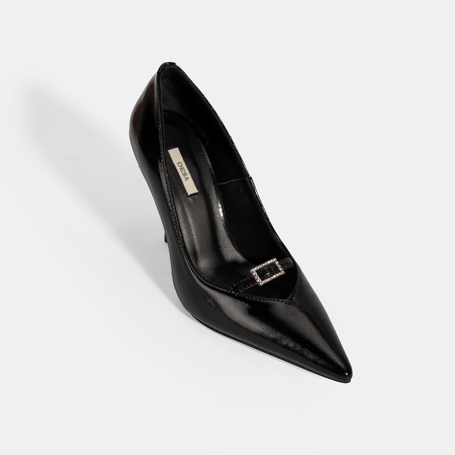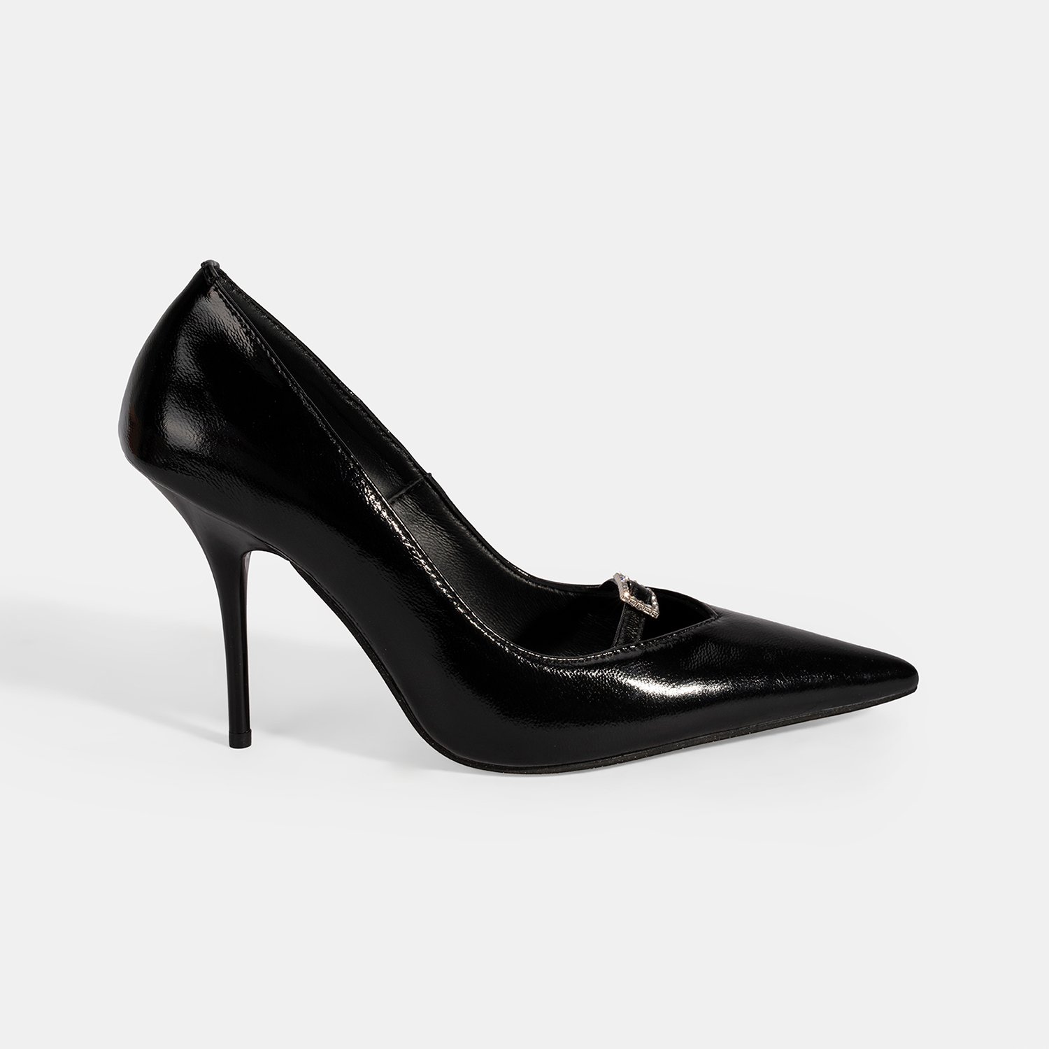 Kadın Siyah Taşlı Toka Detaylı Rugan Topuklu Abiye Ayakkabı