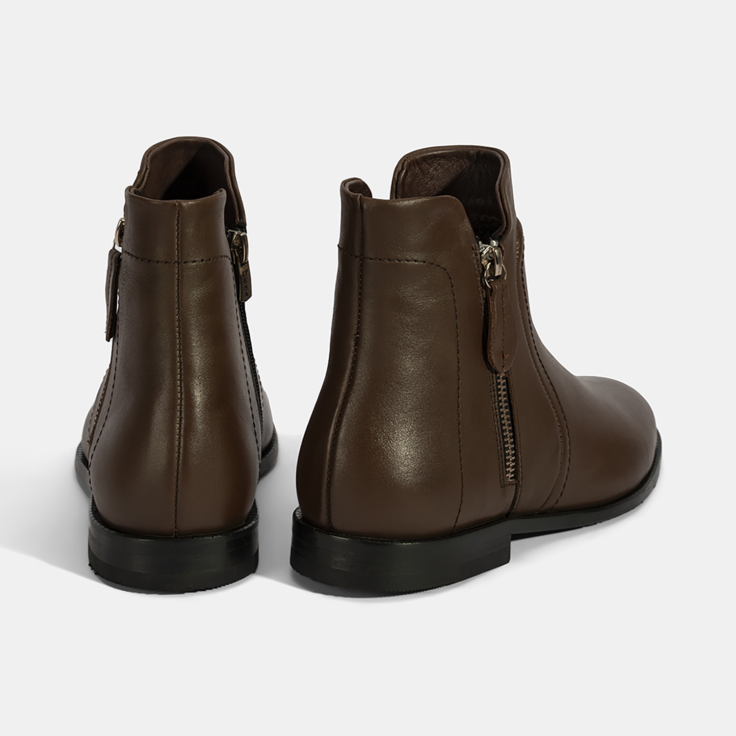 %100 deri, deri iç tabanlı, deri astarlı, çift fermuar detaylı, TPU tabanlı kadın bot. Topuk yüksekliği: 2 cm.