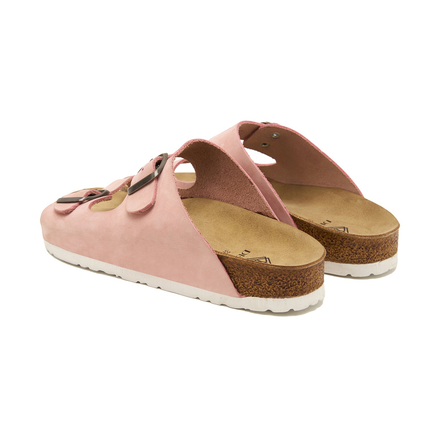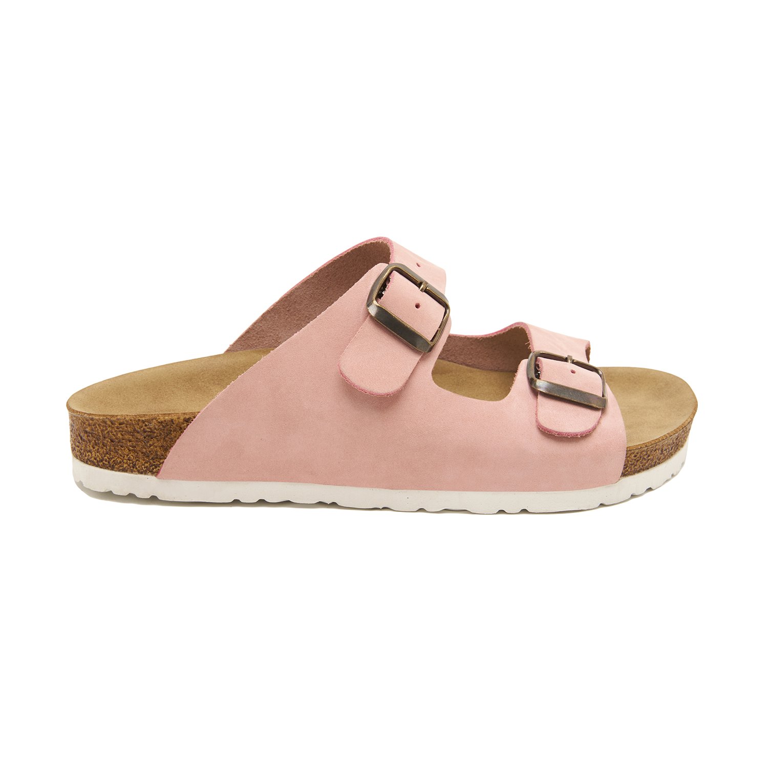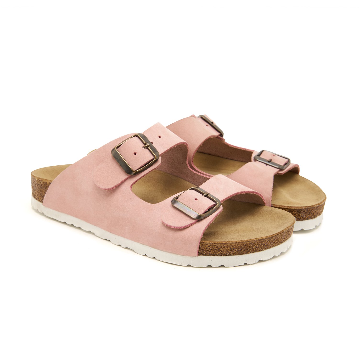 Astarsız, ayarlanabilir metal aksesuarlı, hafif eva tabanlı kadın terlik.