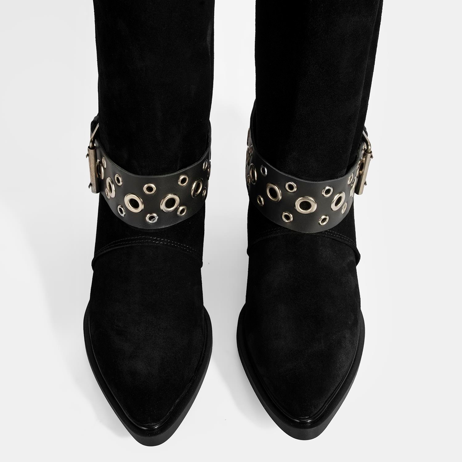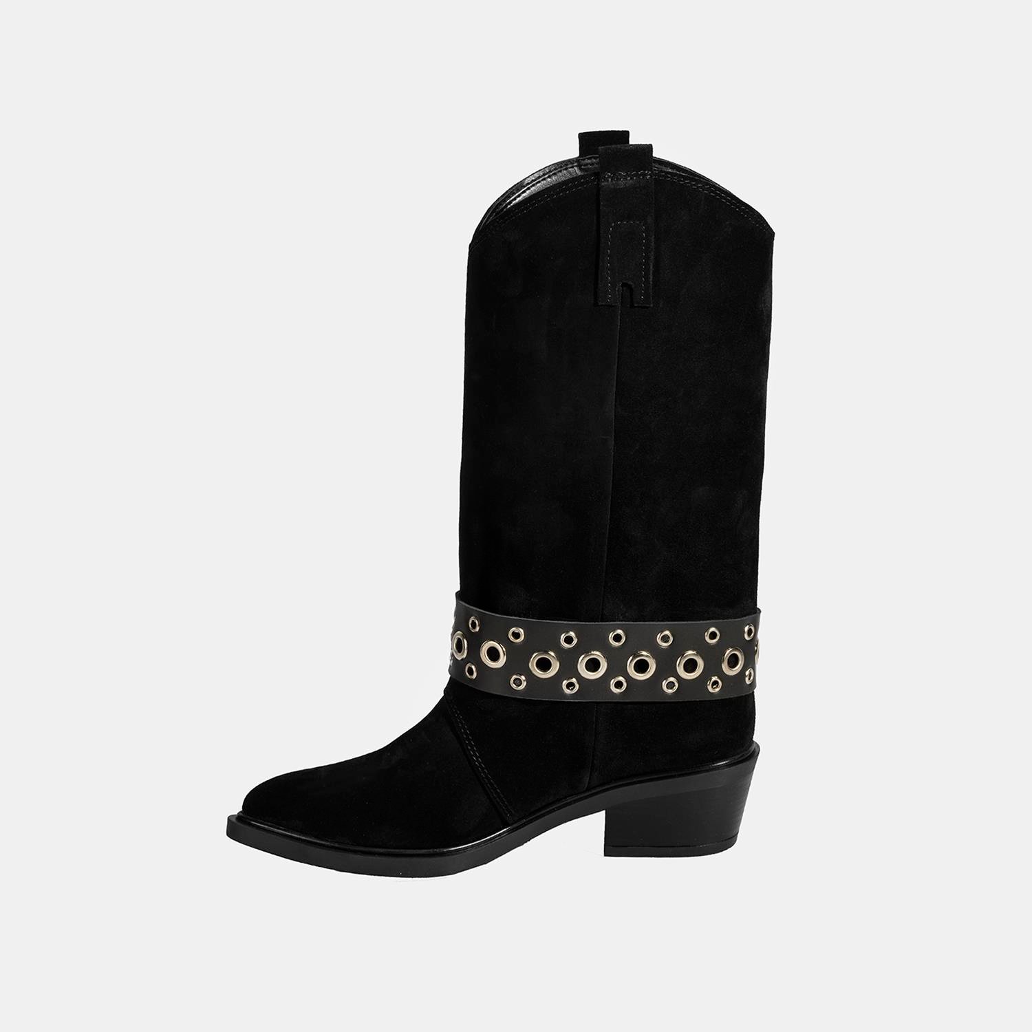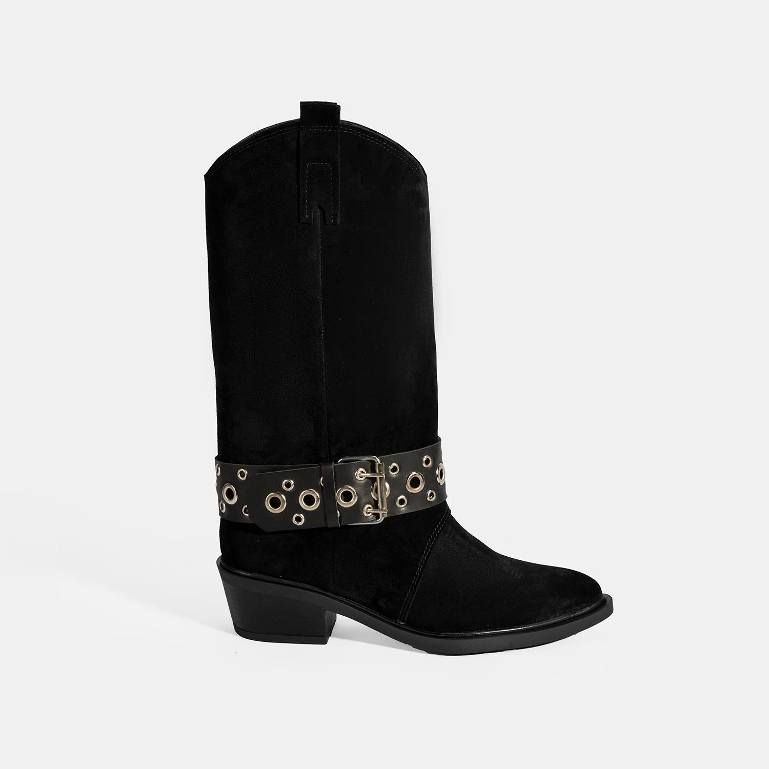 %100 süet deri, deri iç tabanlı, tekstil astarlı, metal aksesuar detaylı kemerli, termo tabanlı kadın western bot. Topuk yüksekliği 5 cm.