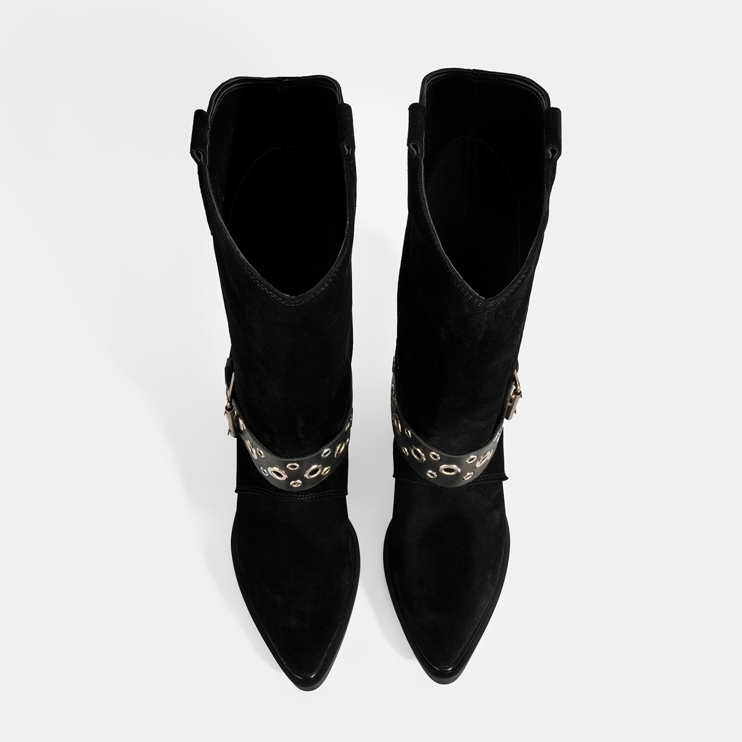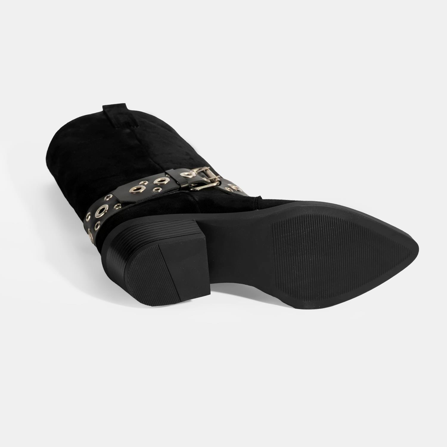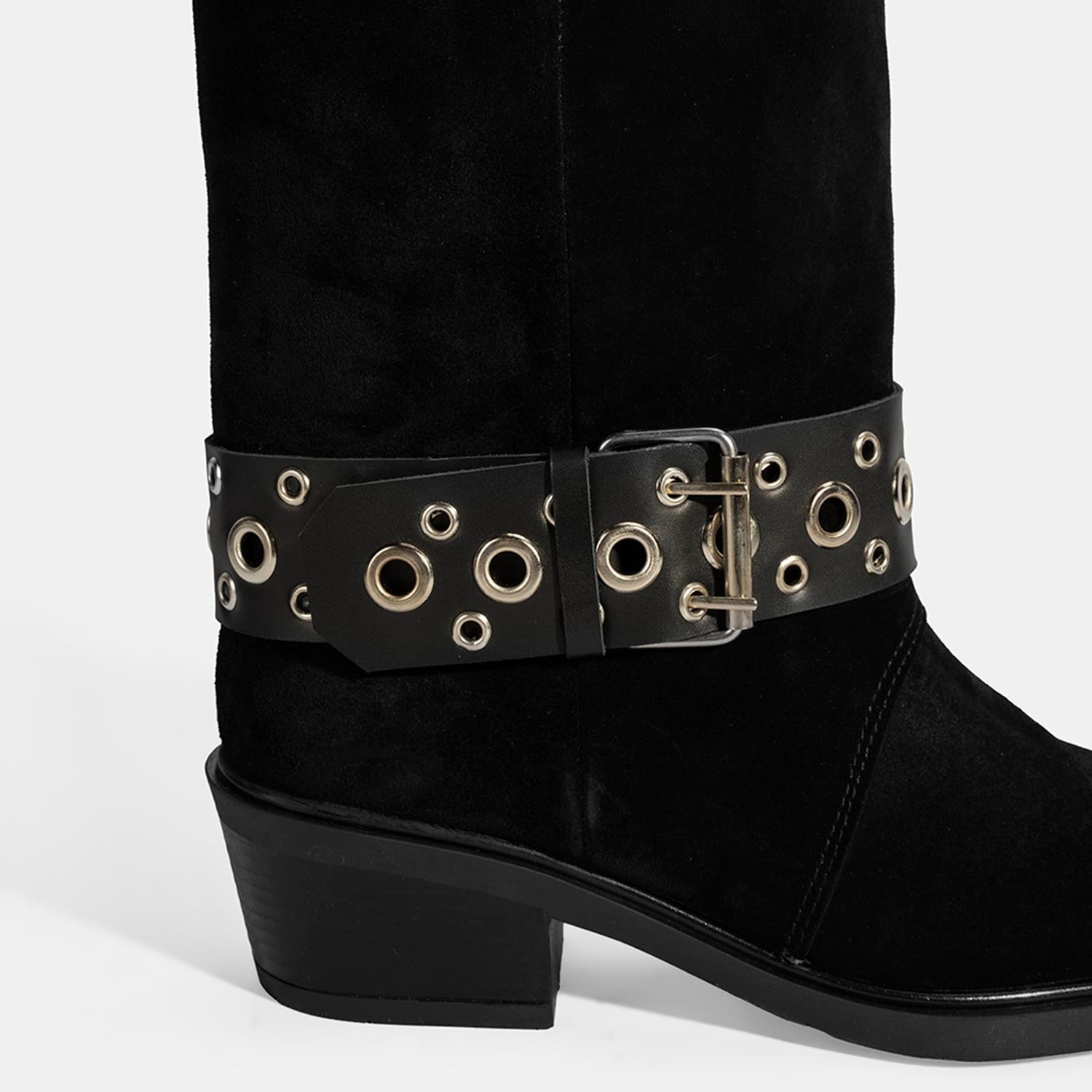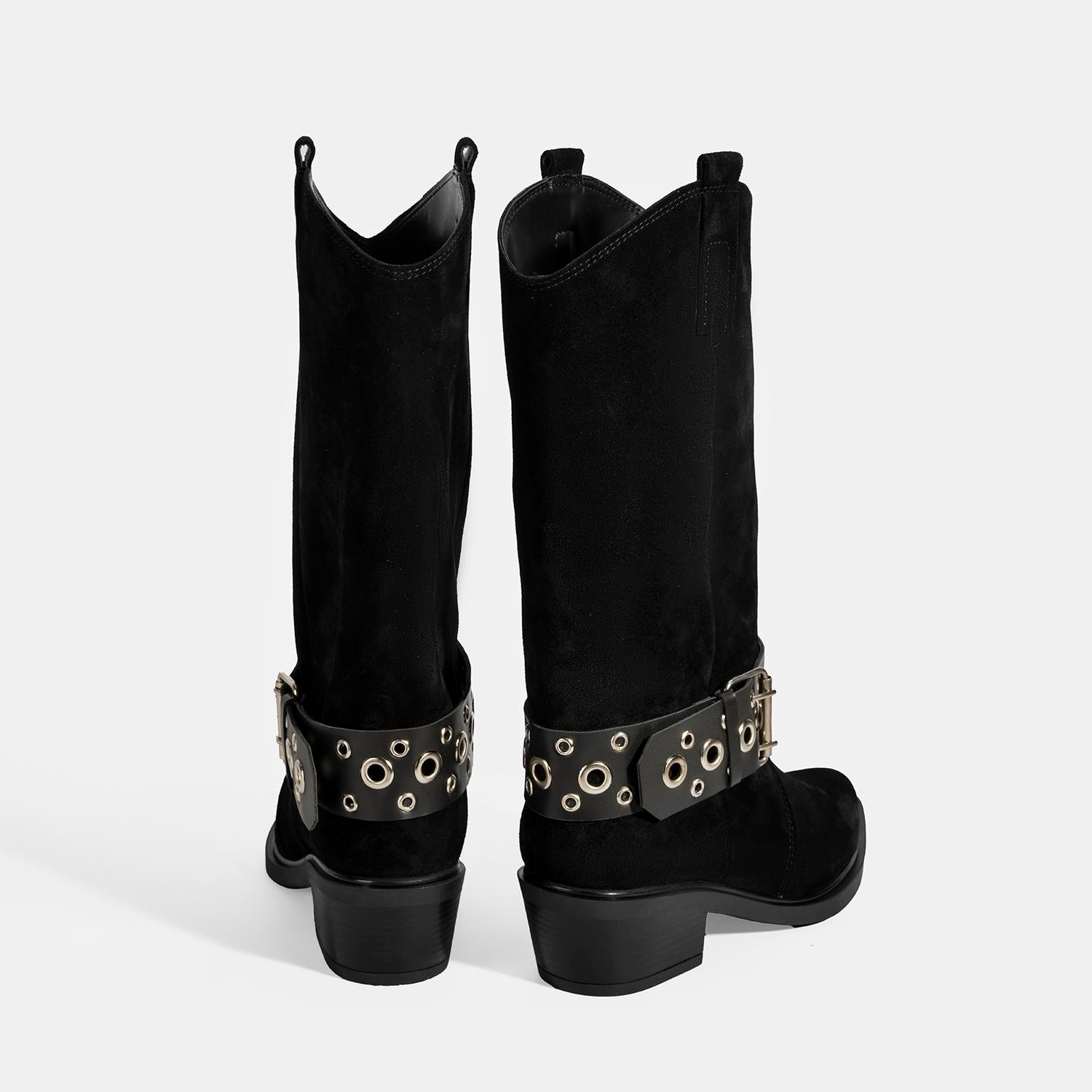 %100 süet deri, deri iç tabanlı, tekstil astarlı, metal aksesuar detaylı kemerli, termo tabanlı kadın western bot. Topuk yüksekliği 5 cm.