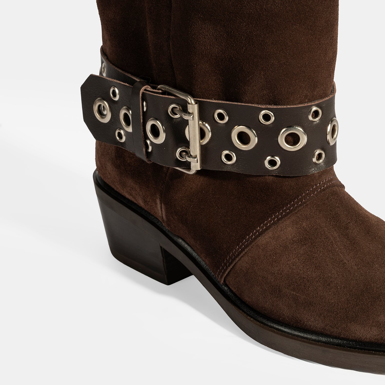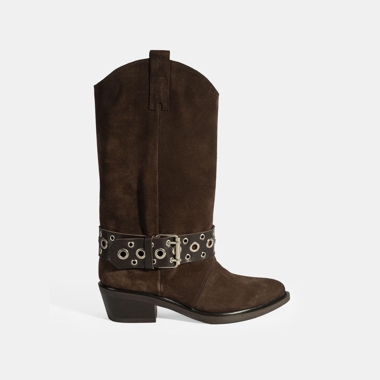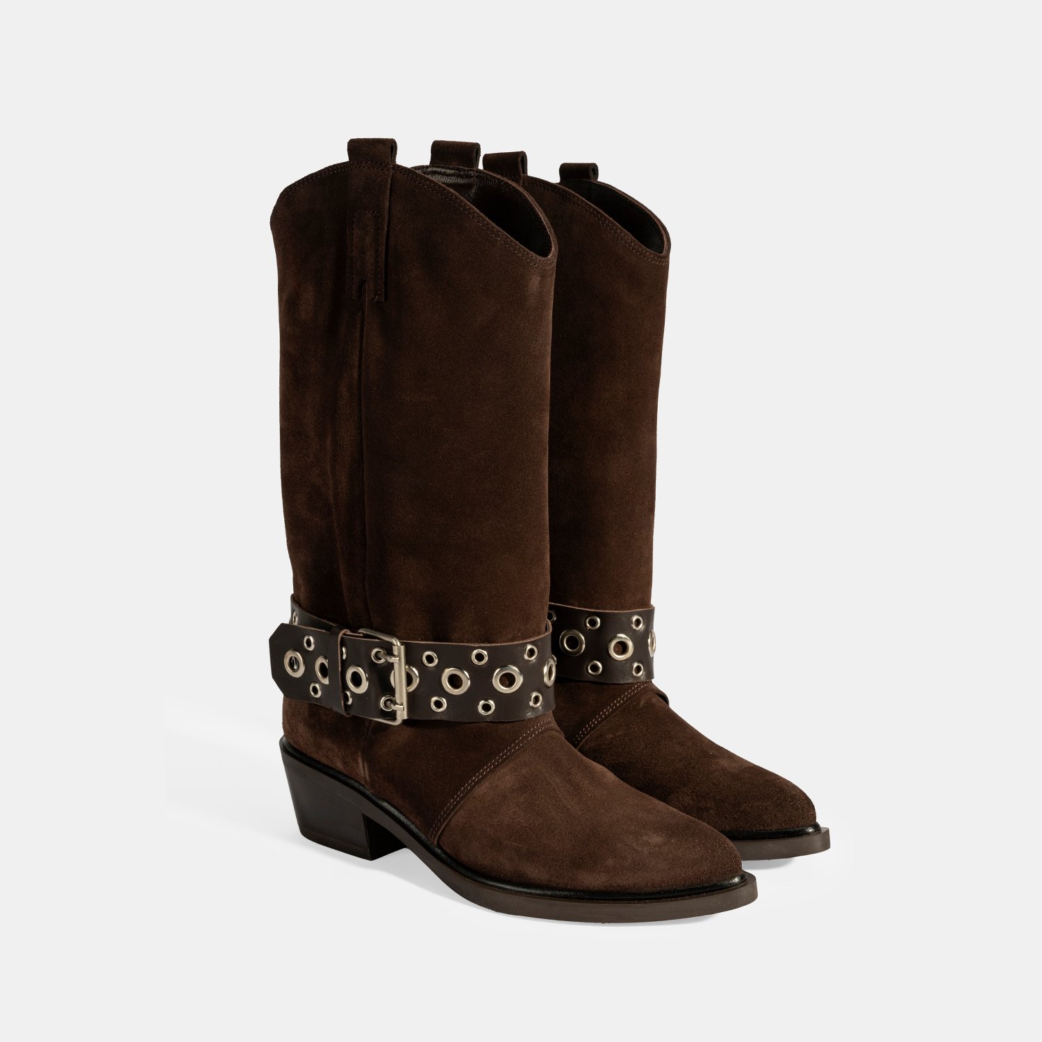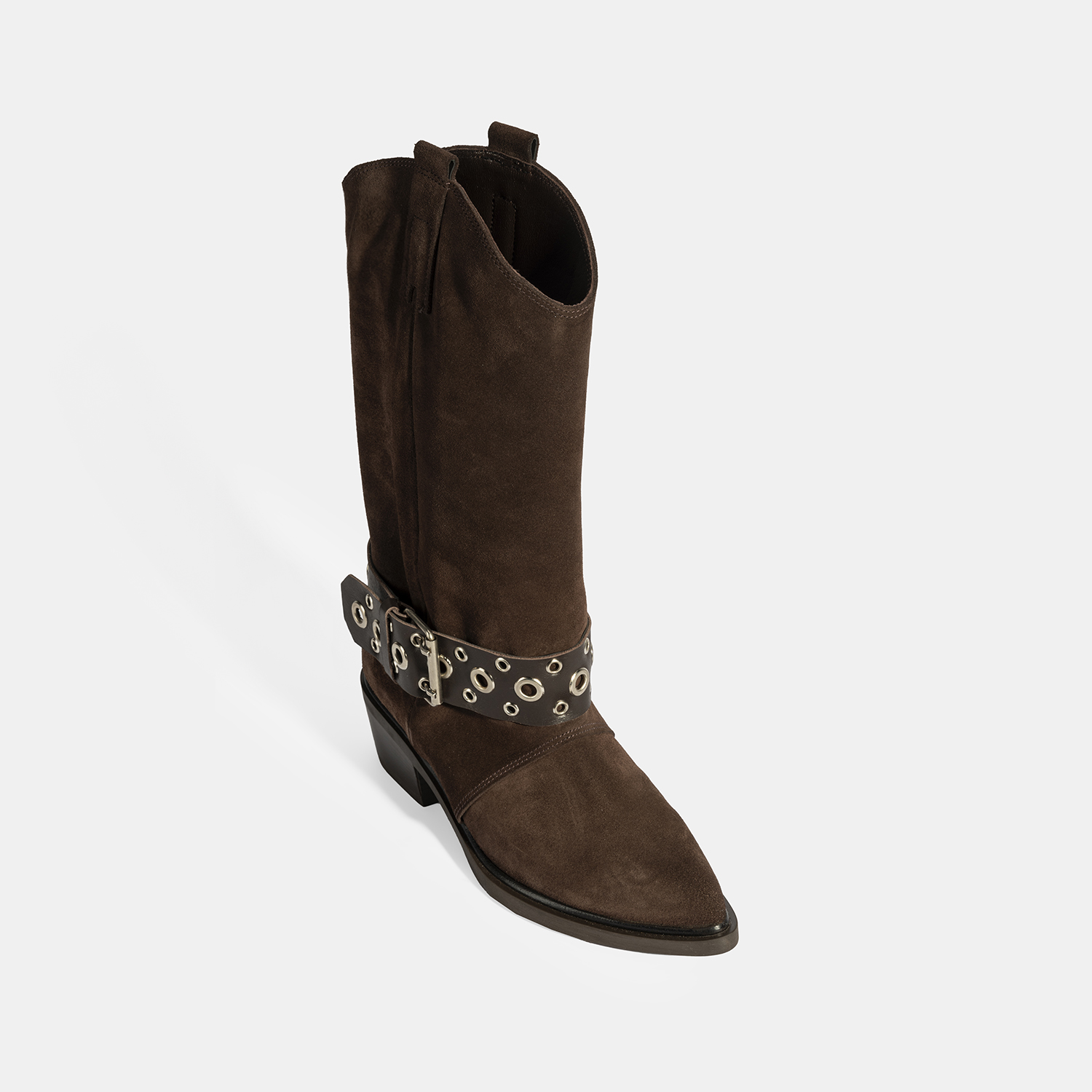 %100 süet deri, deri iç tabanlı, tekstil astarlı, metal aksesuar detaylı kemerli, termo tabanlı kadın western bot. Topuk yüksekliği 5 cm.