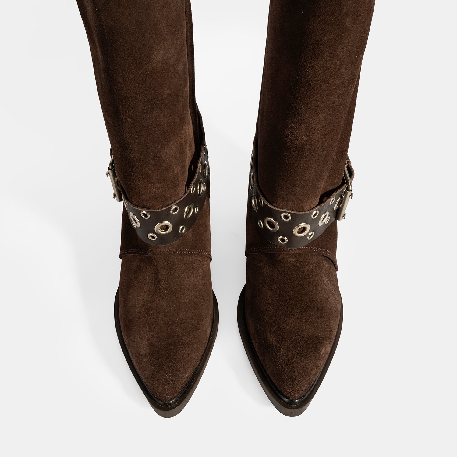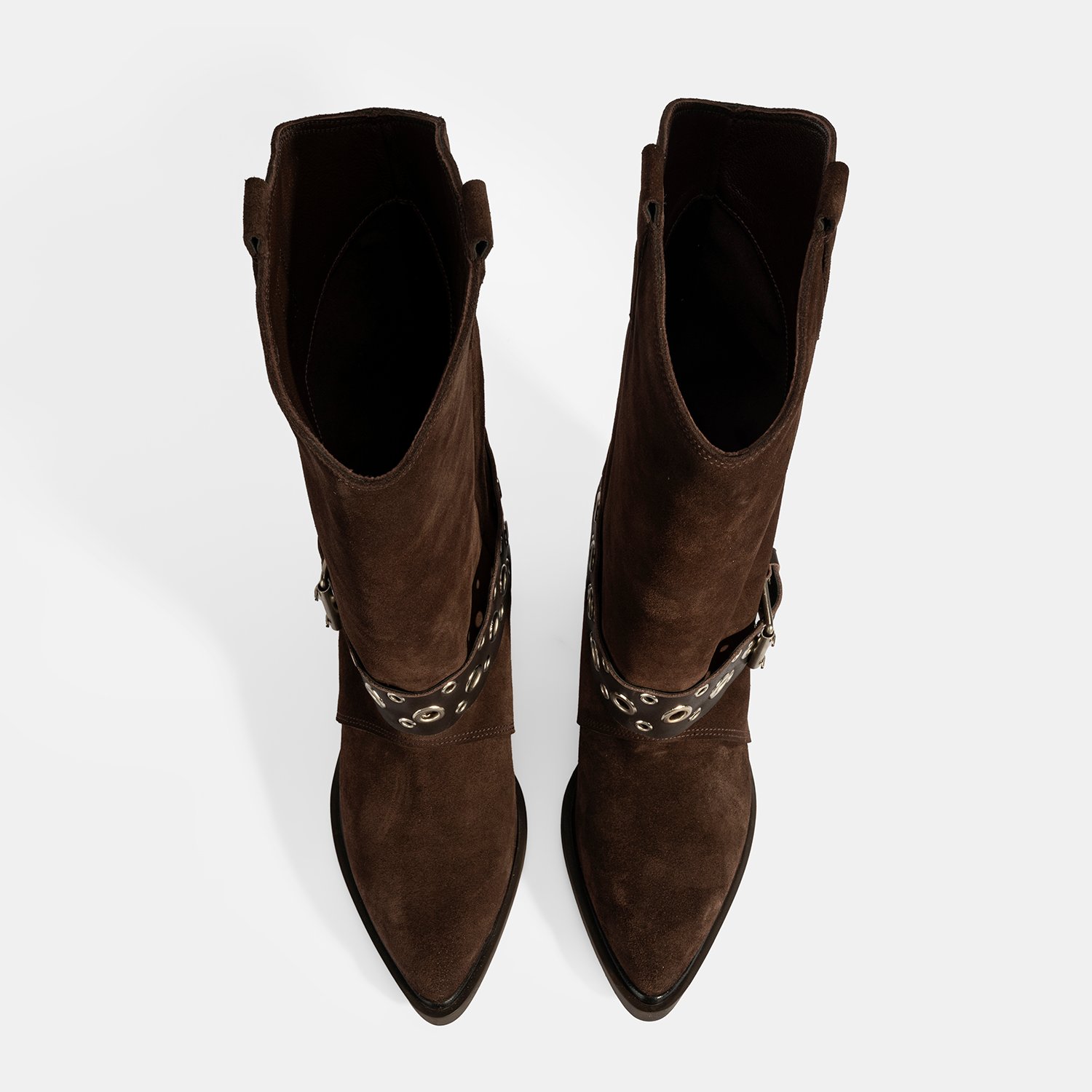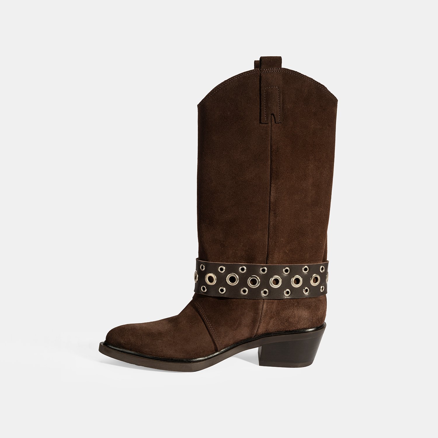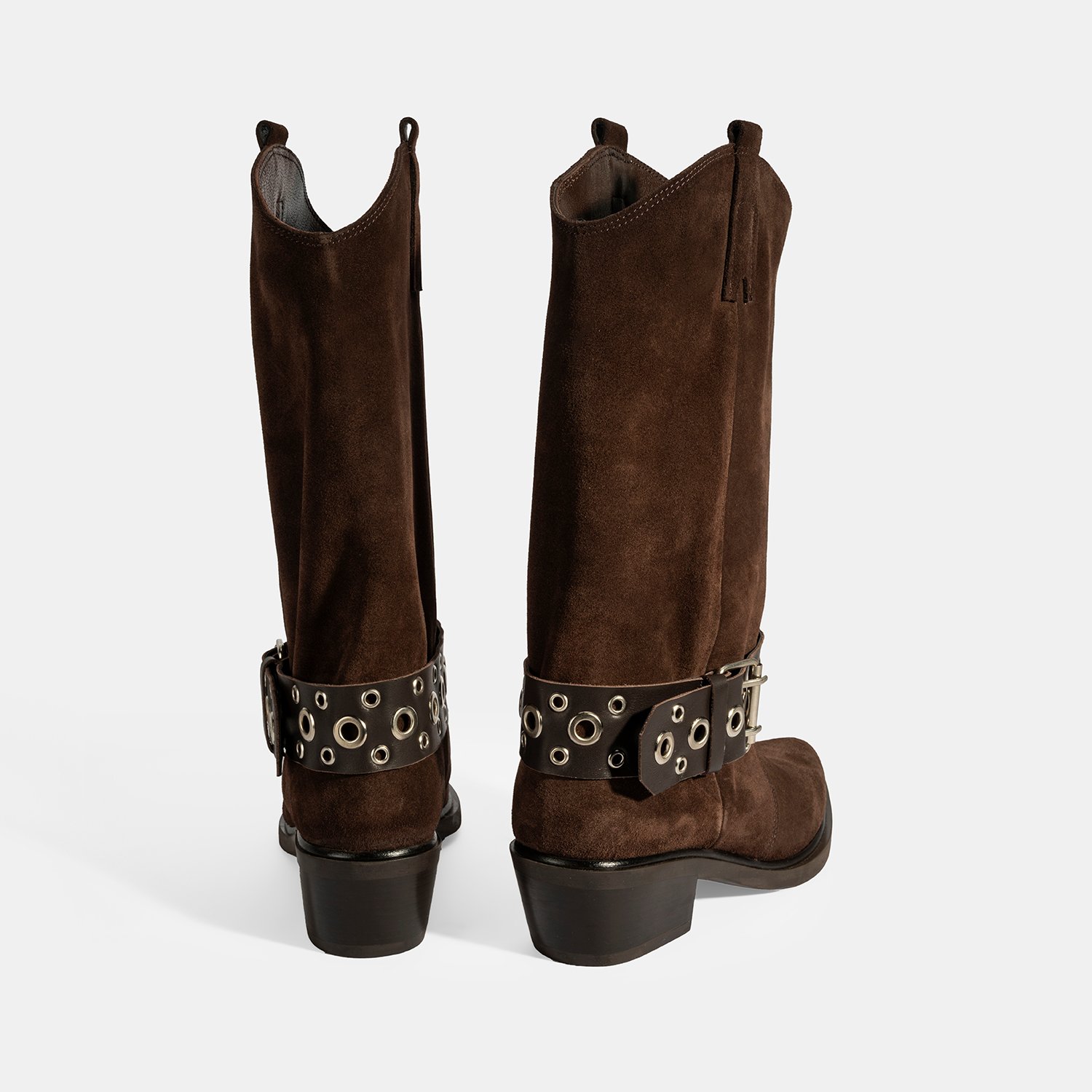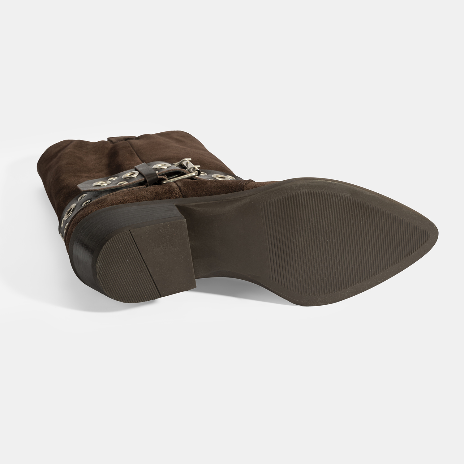 %100 süet deri, deri iç tabanlı, tekstil astarlı, metal aksesuar detaylı kemerli, termo tabanlı kadın western bot. Topuk yüksekliği 5 cm.
