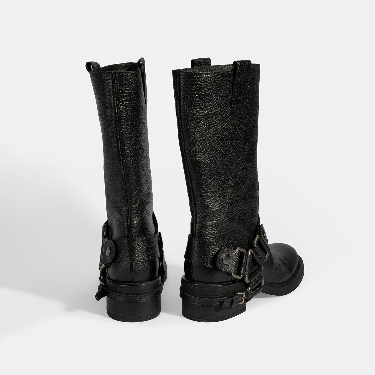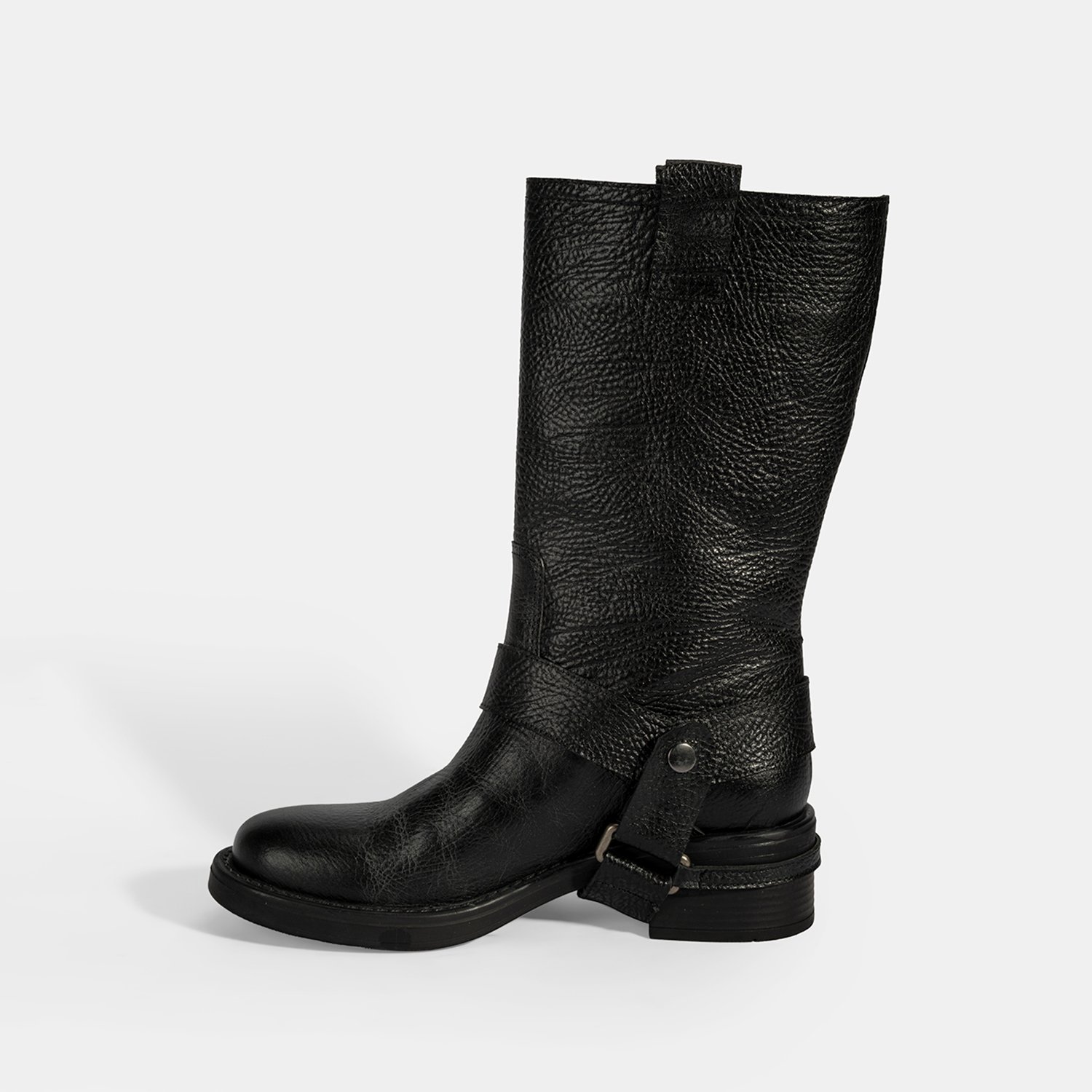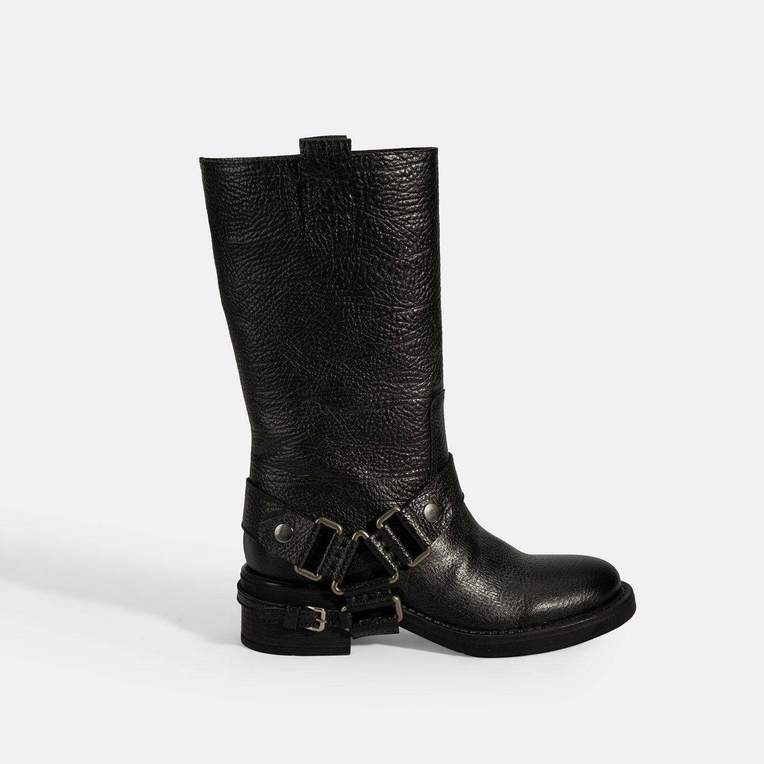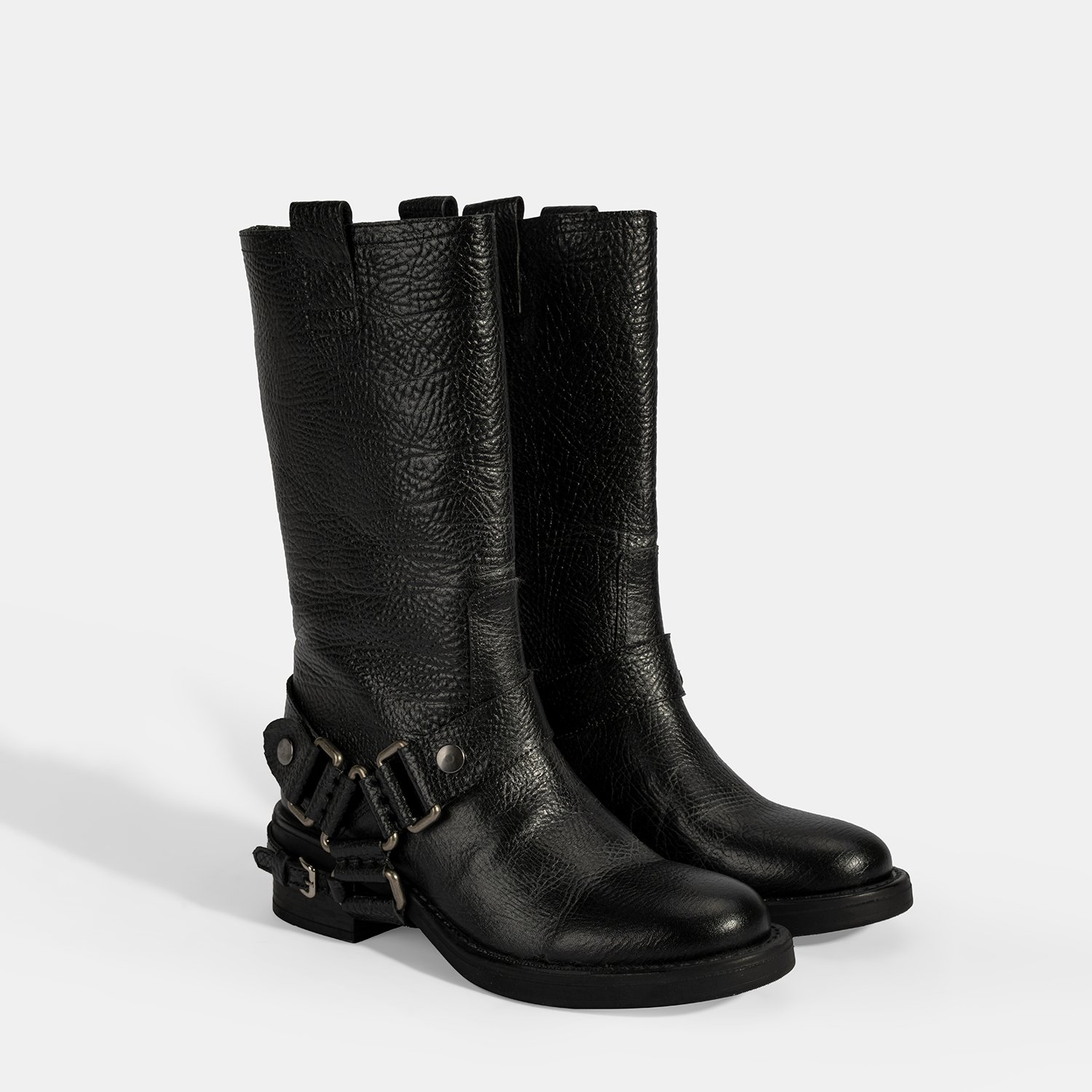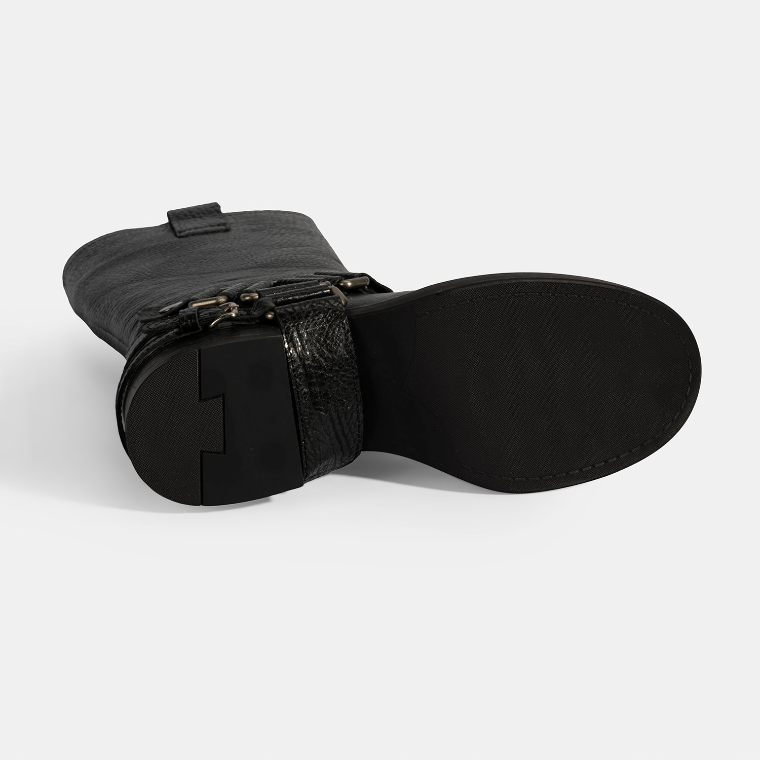 Kadın Siyah Metal Aksesuarlı Deri Biker Bot
