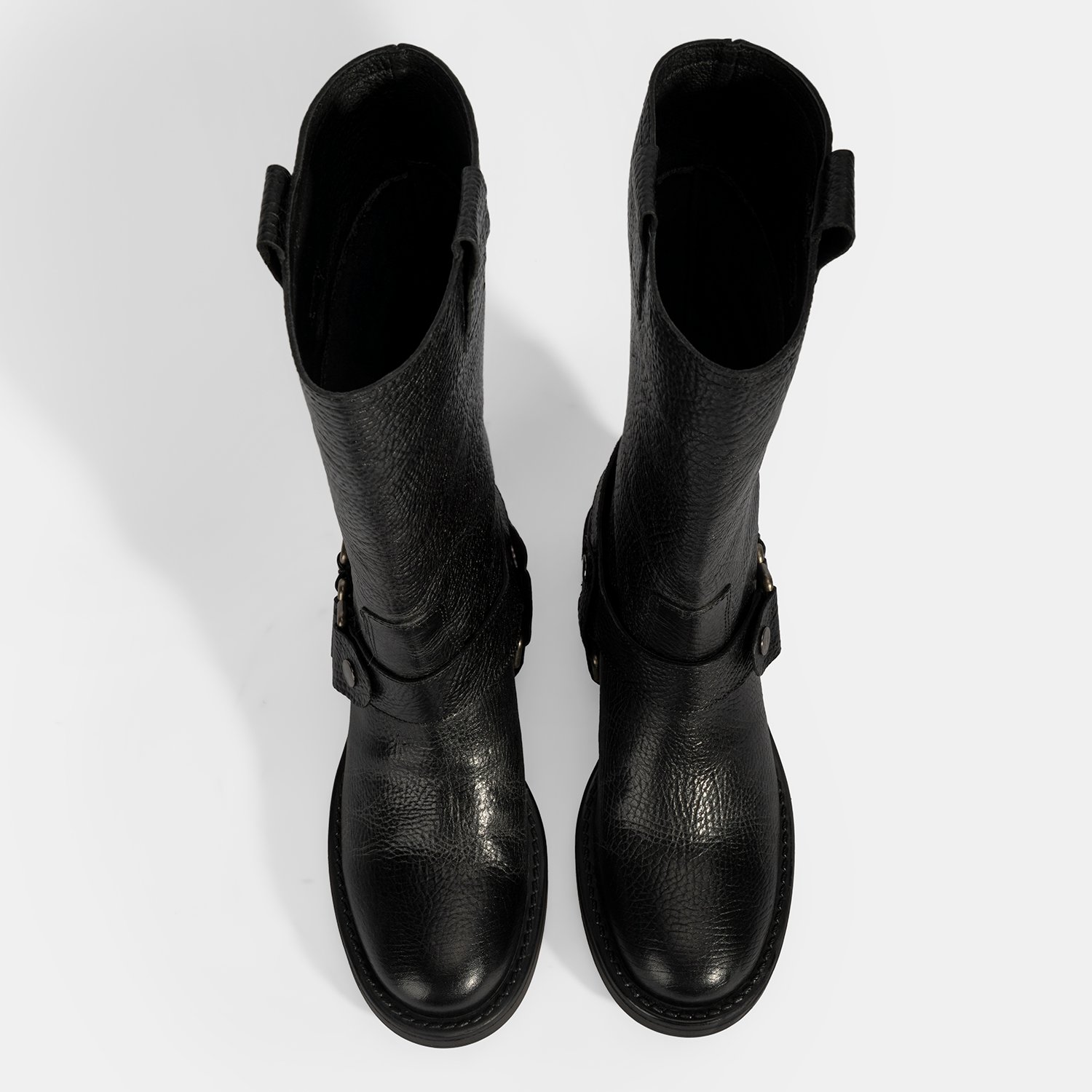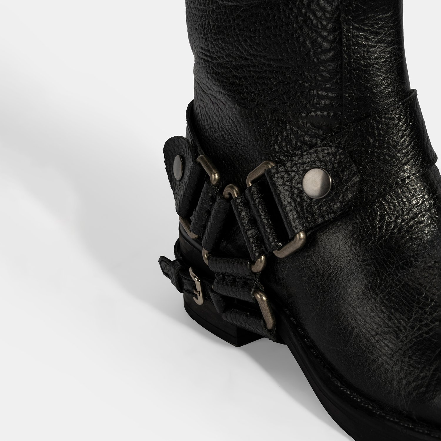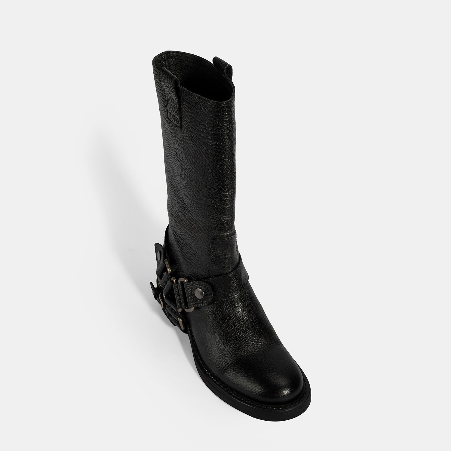 %100 deri, deri iç tabanlı, tekstil astarlı, metal aksesuar detaylı, kadın biker bot. Topuk yüksekliği: 4,5 cm.