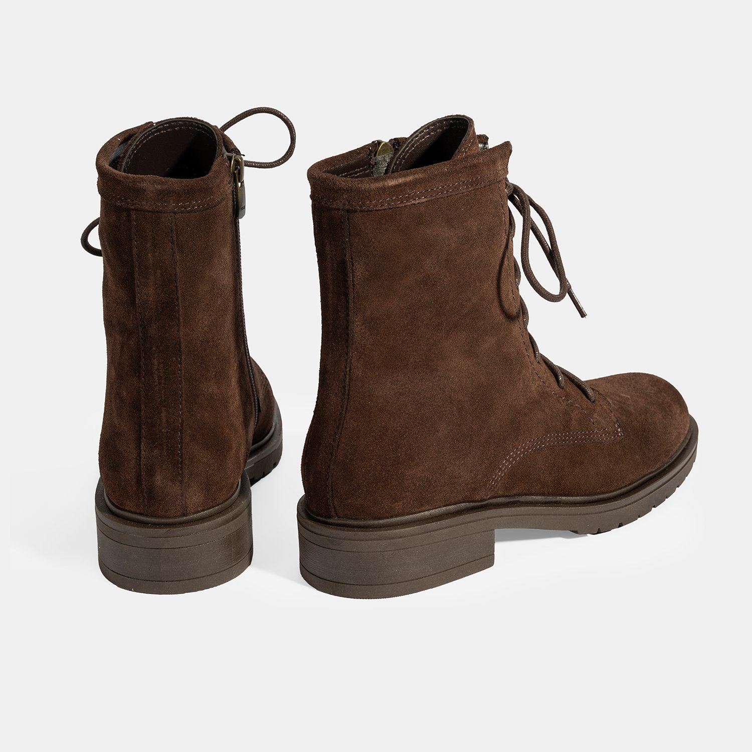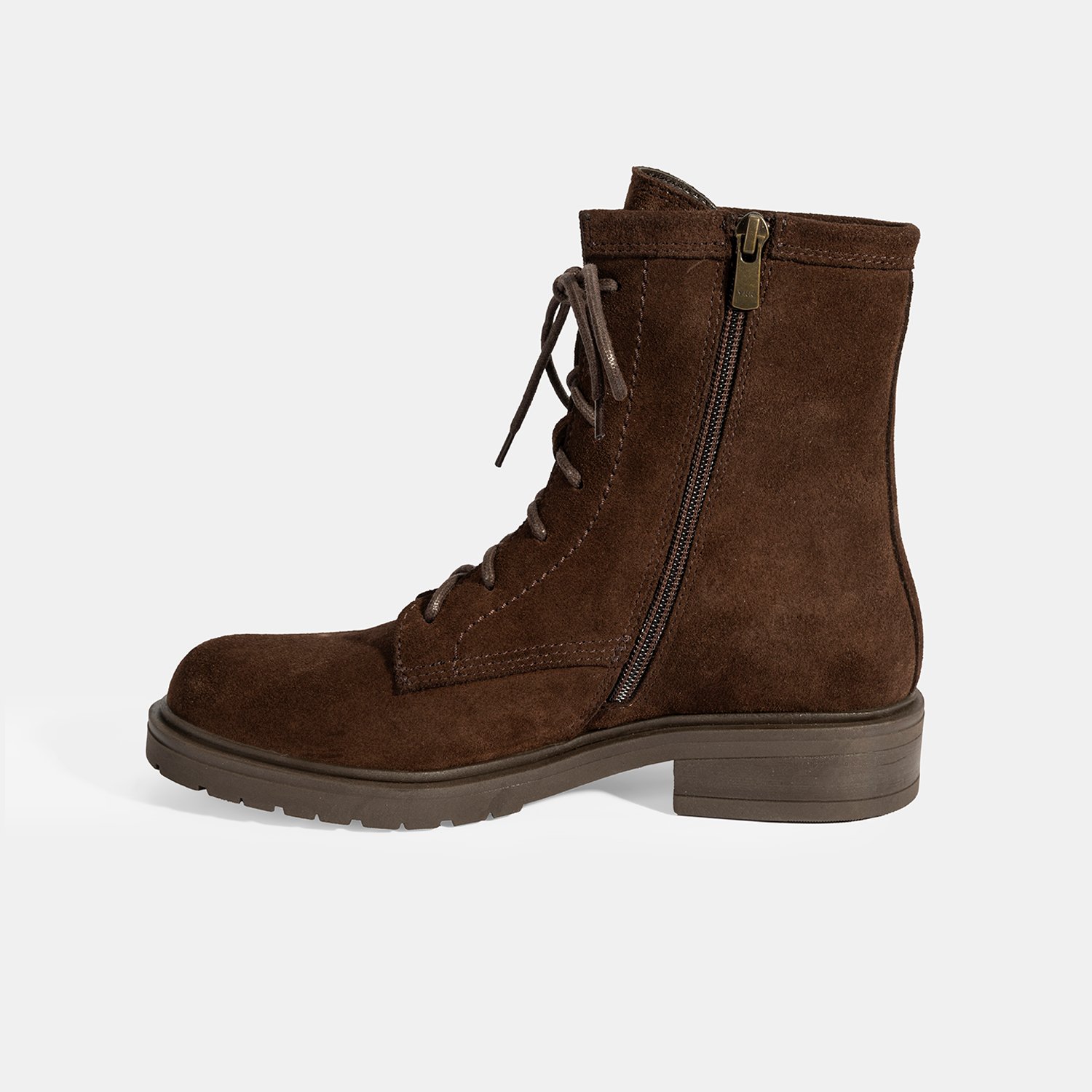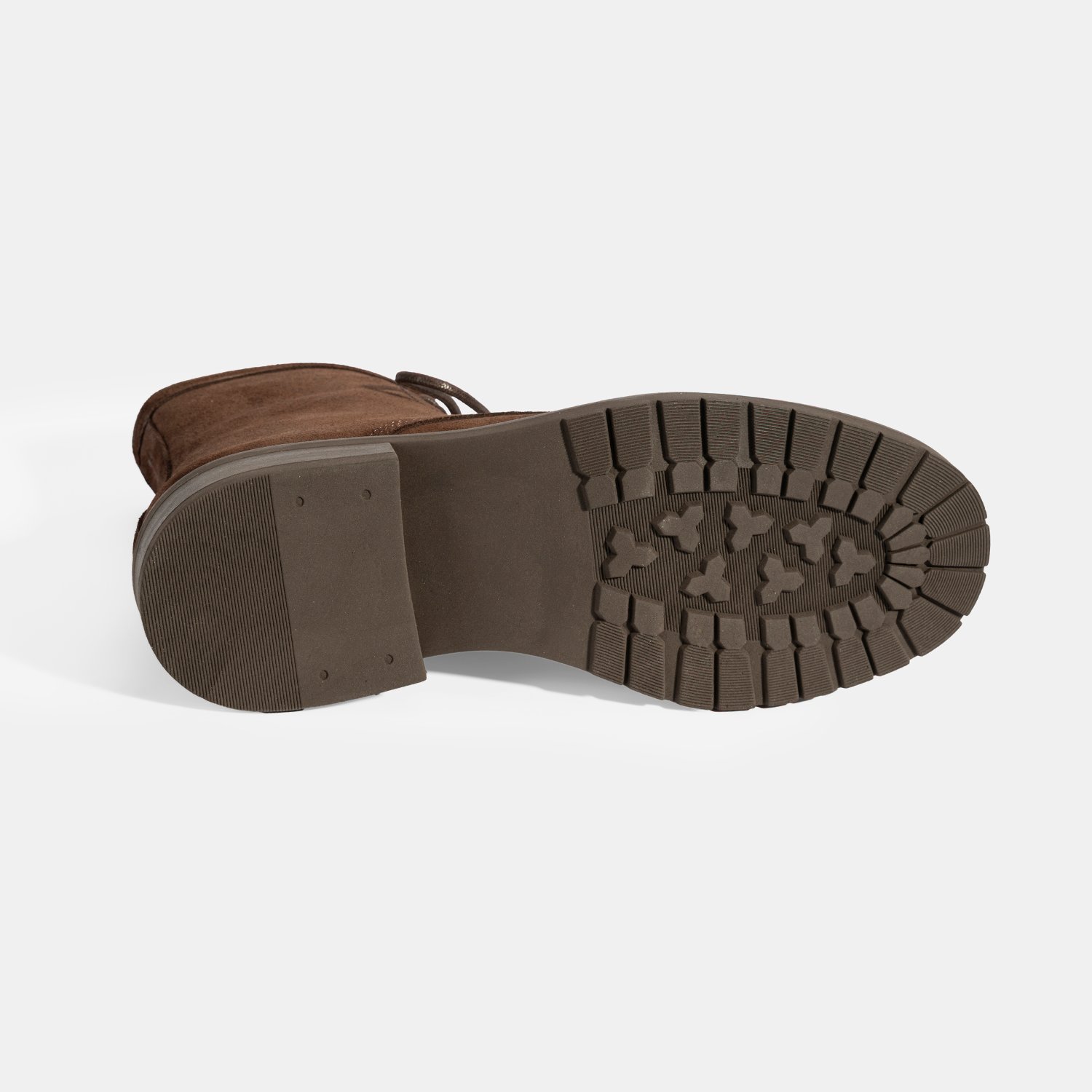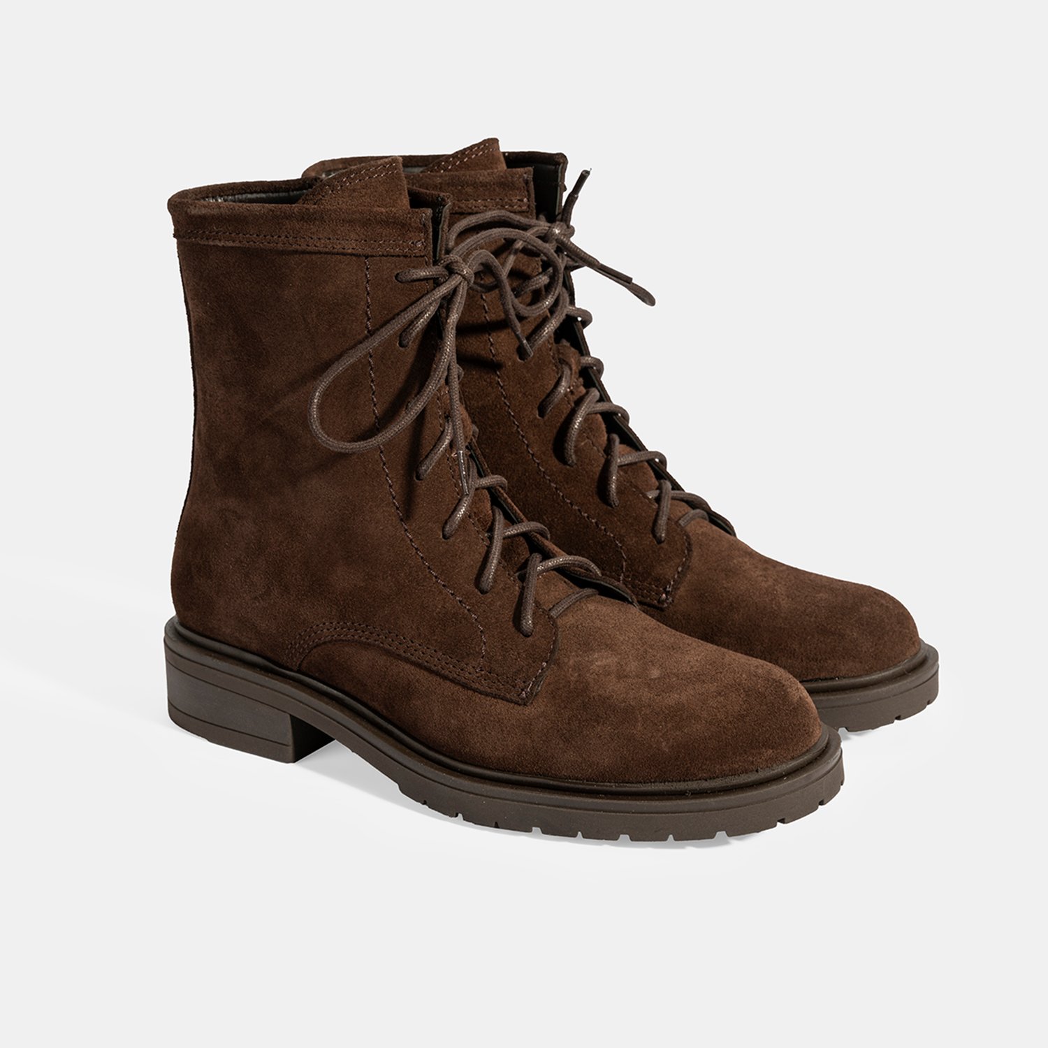 %100 süet deri, deri iç tabanlı, tekstil astarlı, termo tabanlı, bağcık detaylı, içten fermuarlı kadın bot. Topuk yüksekliği 3 cm