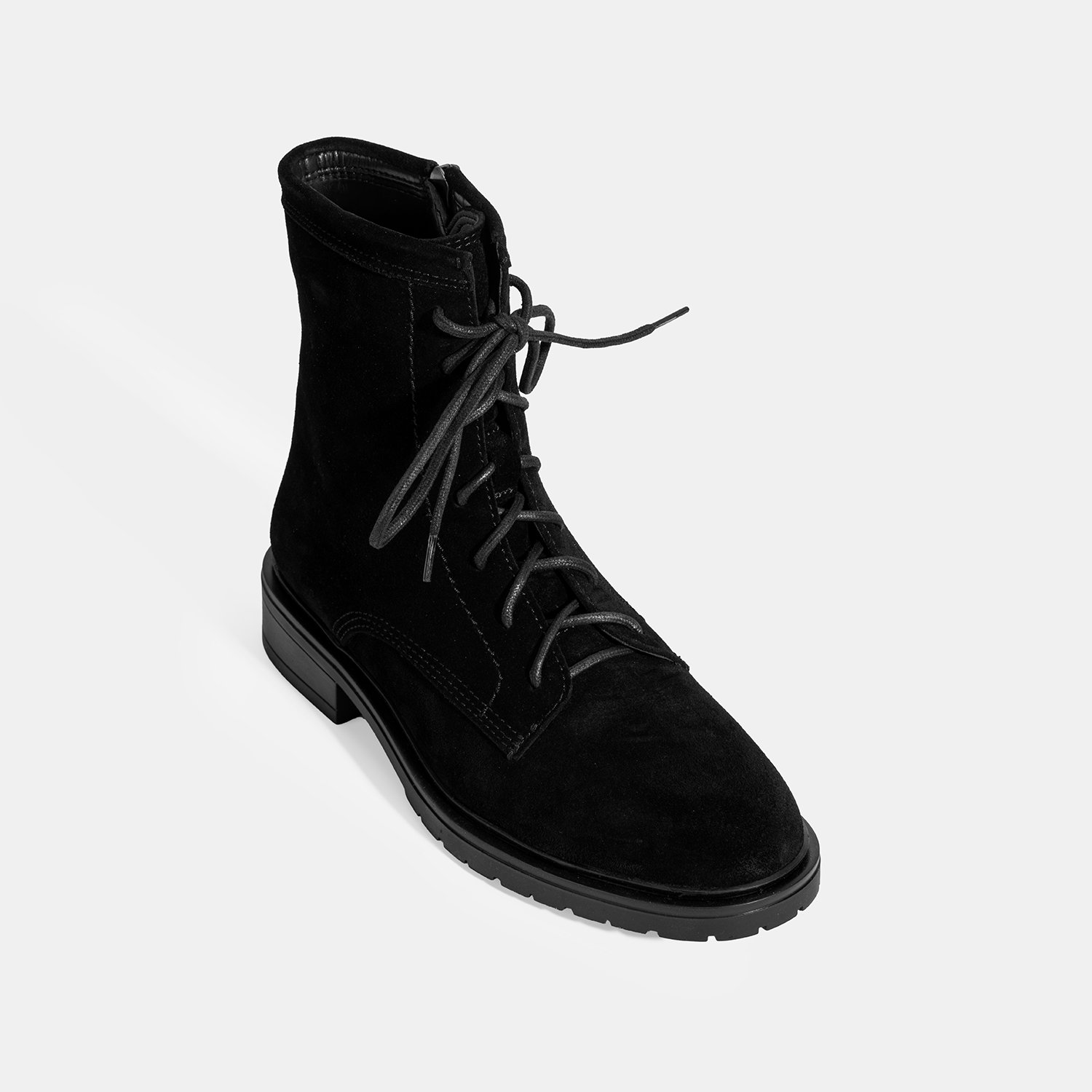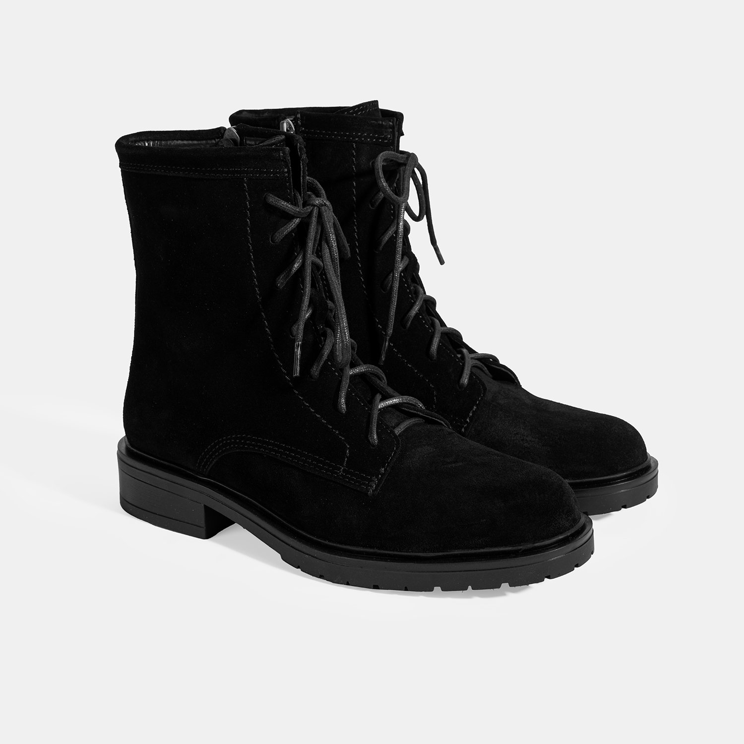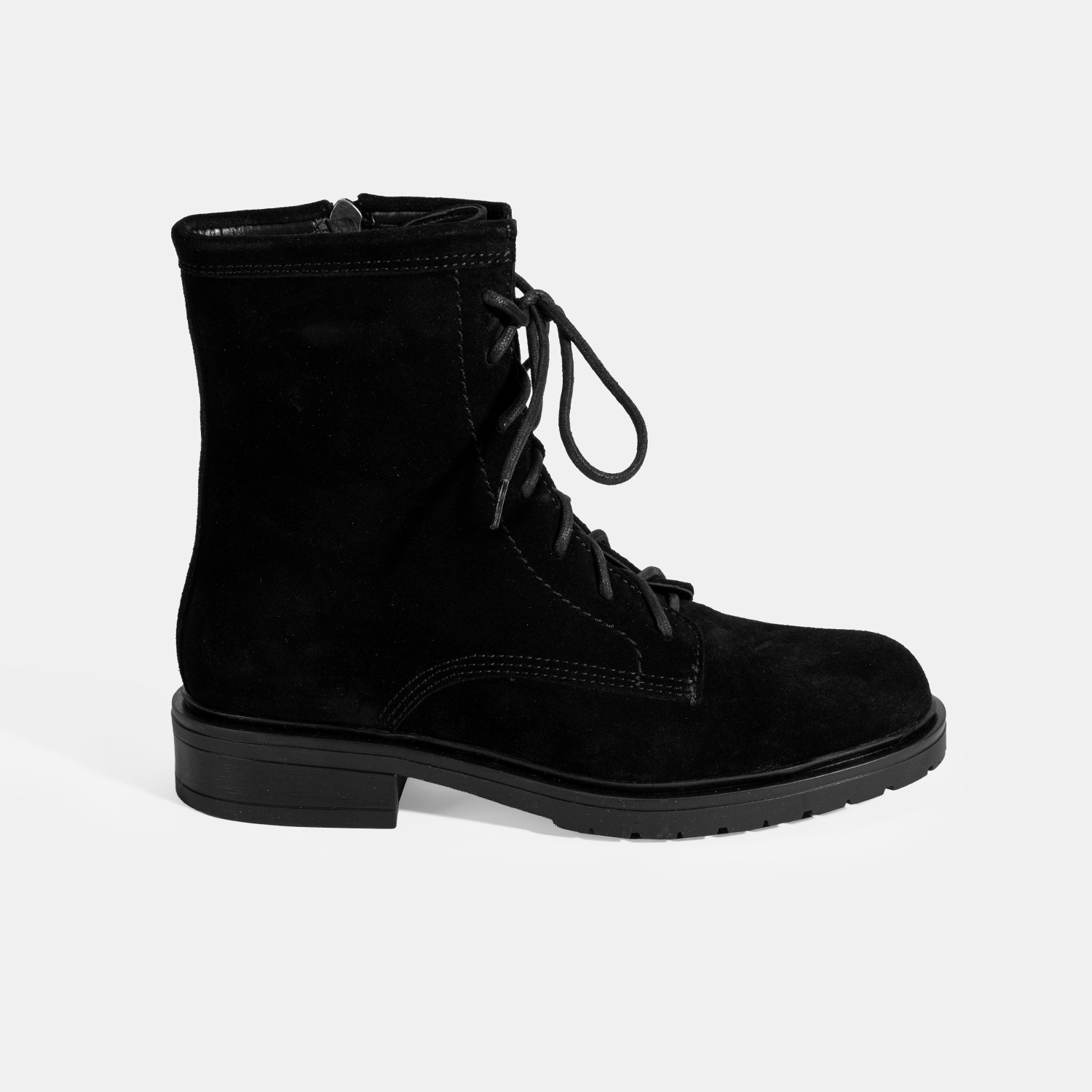 %100 süet deri, deri iç tabanlı, tekstil astarlı, termo tabanlı, bağcık detaylı, içten fermuarlı kadın bot. Topuk yüksekliği 3 cm