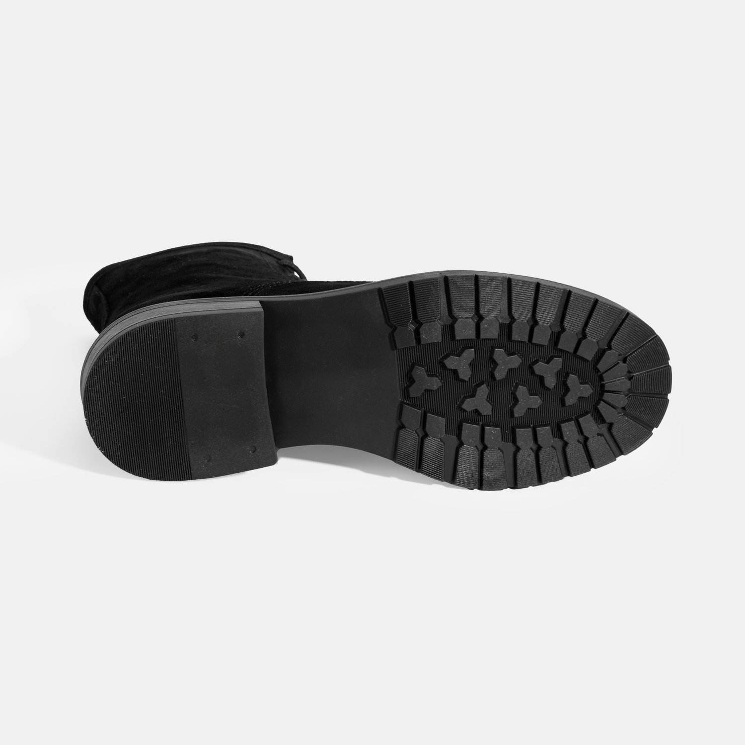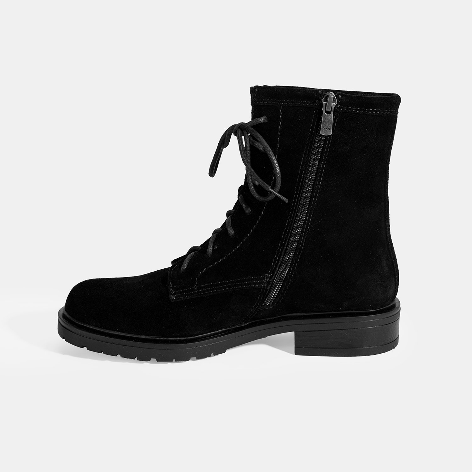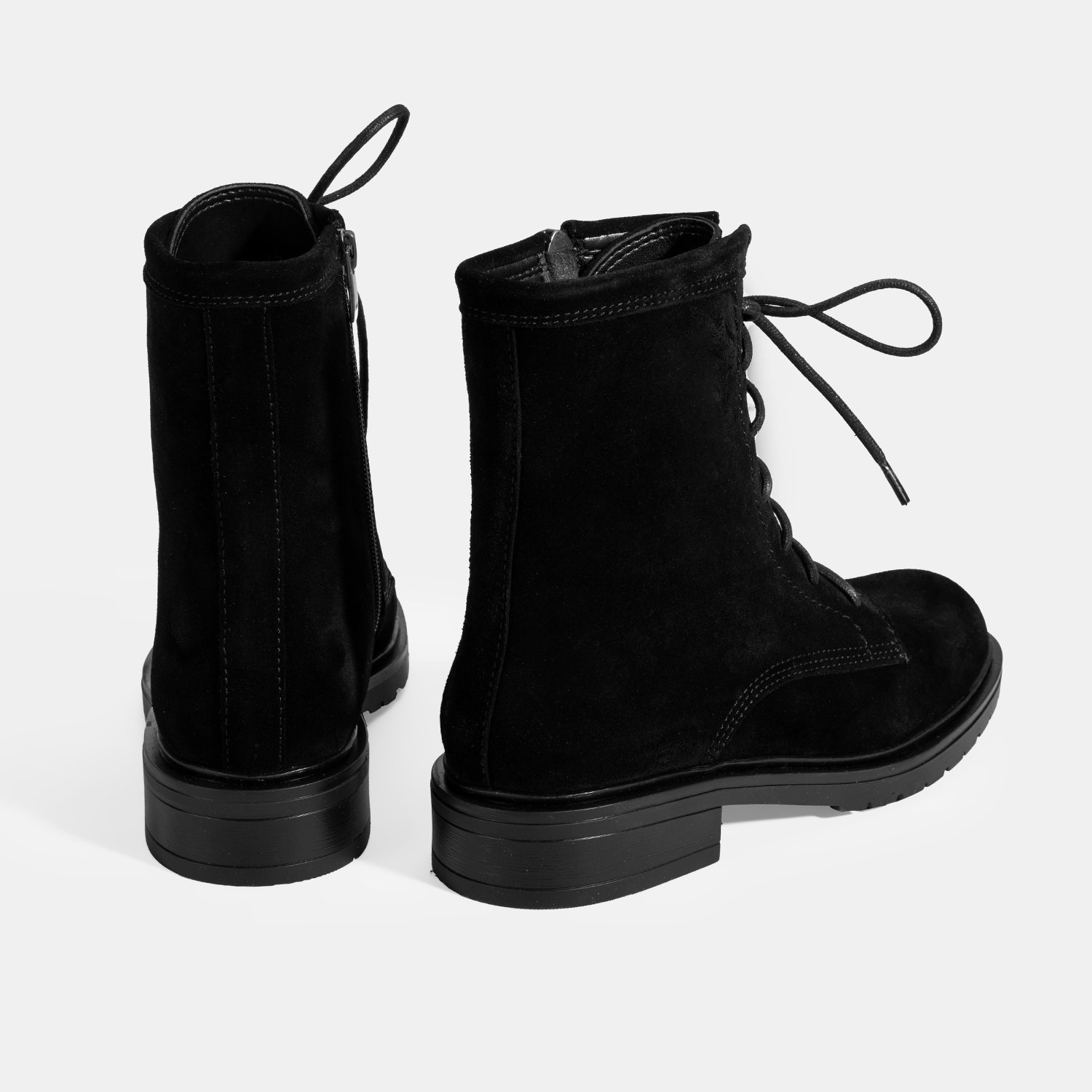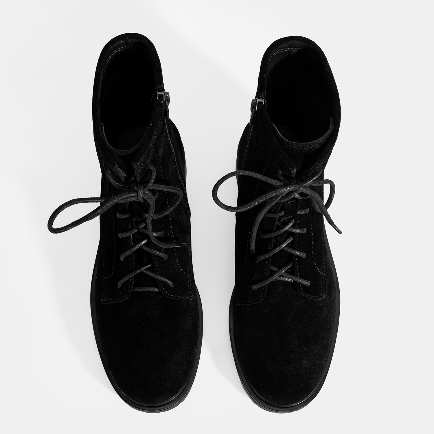 %100 süet deri, deri iç tabanlı, tekstil astarlı, termo tabanlı, bağcık detaylı, içten fermuarlı kadın bot. Topuk yüksekliği 3 cm