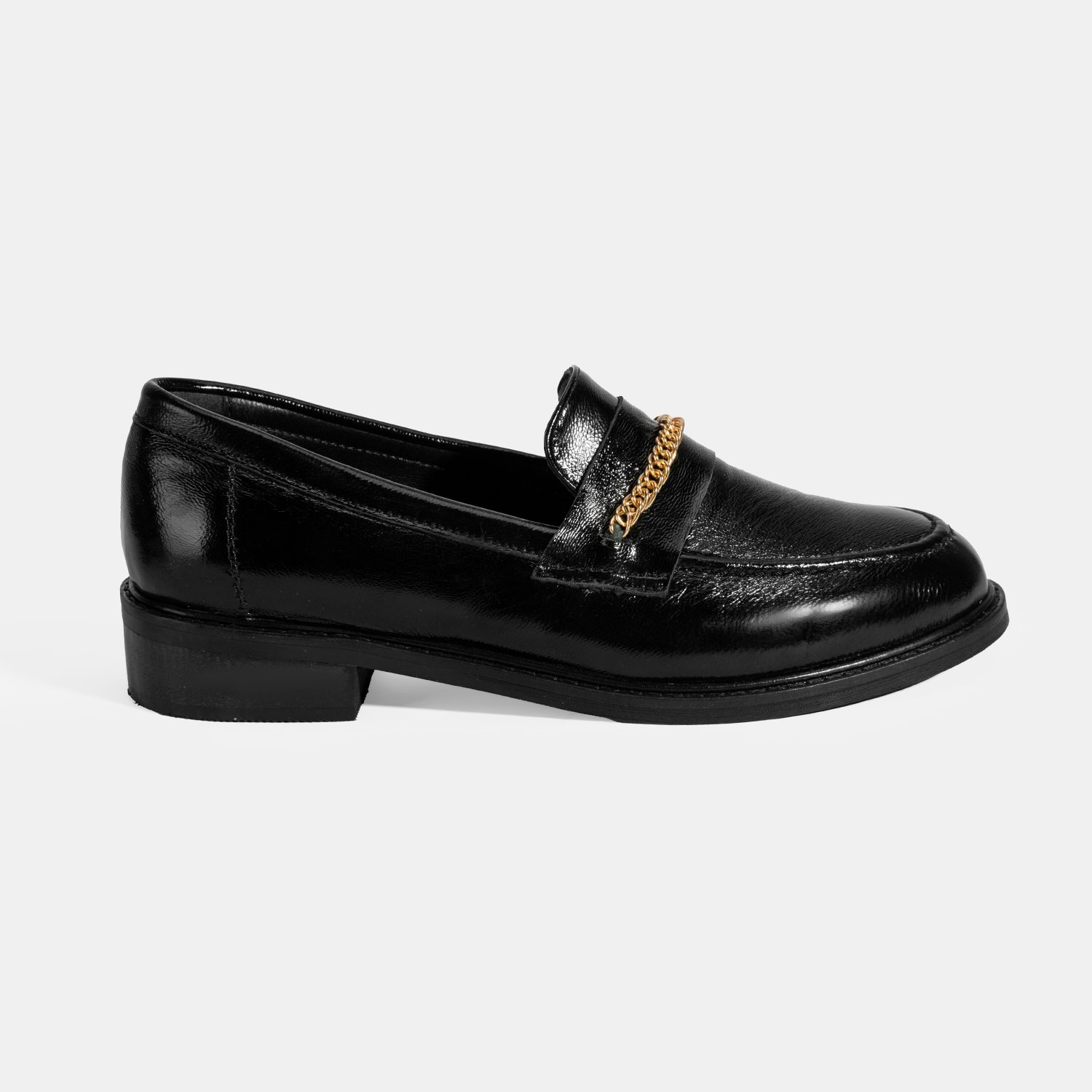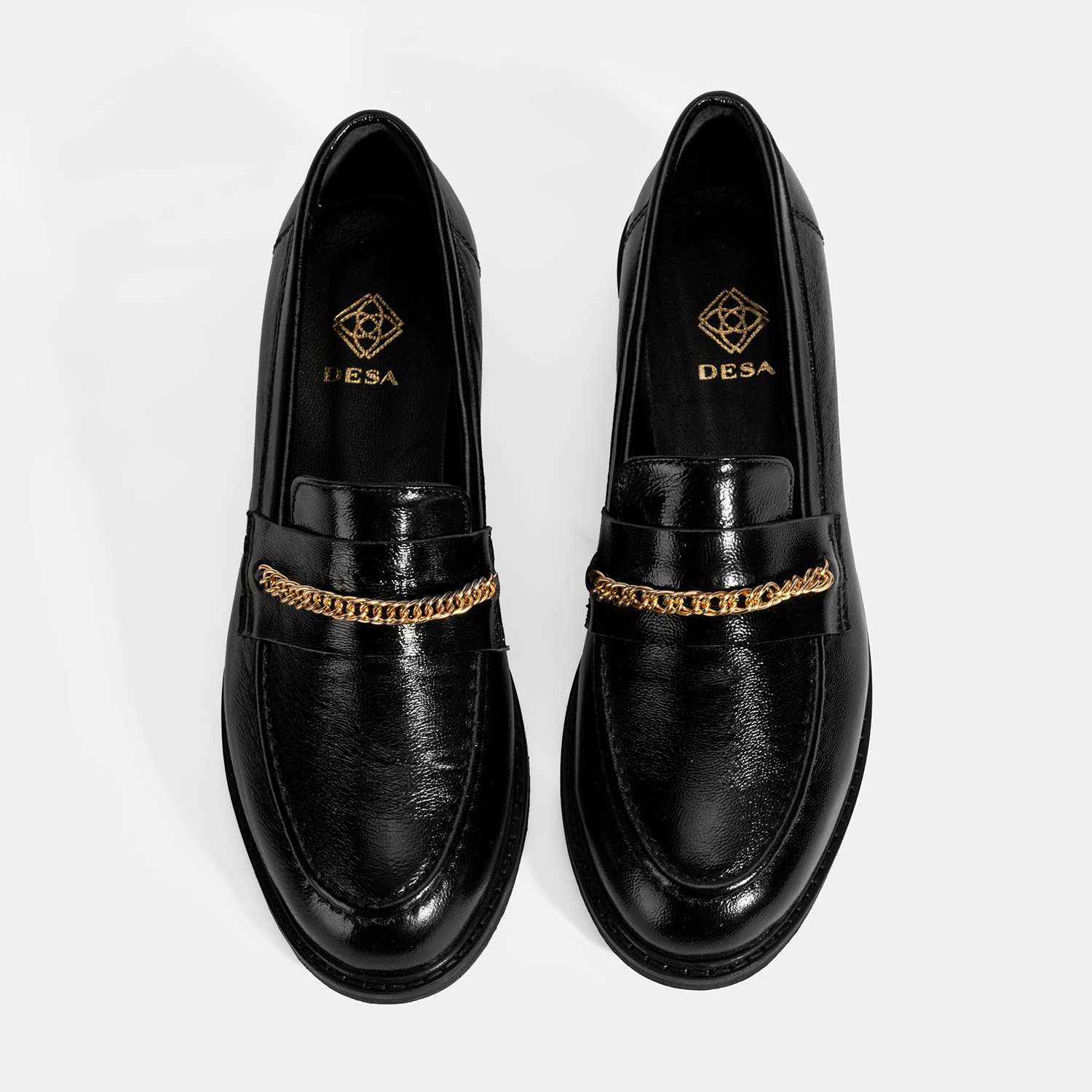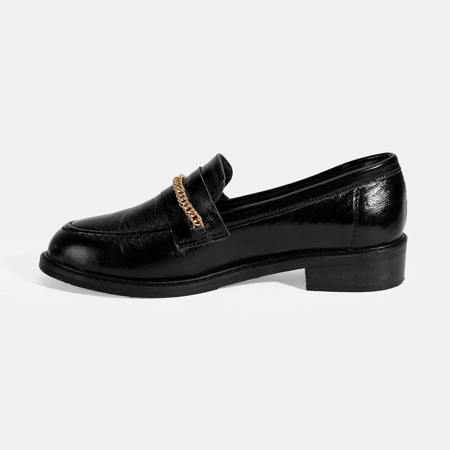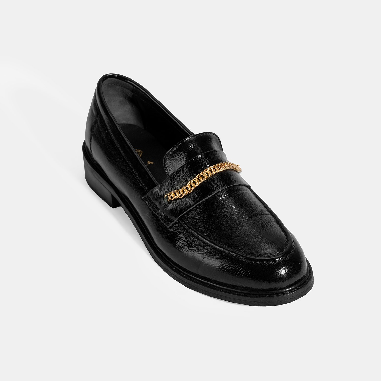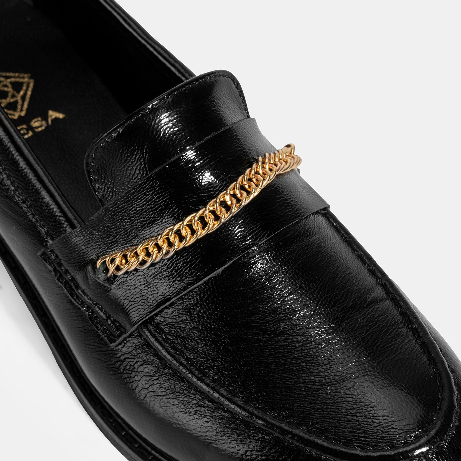 %100 rugan deri, deri iç tabanlı, deri astarlı, metal zincir aksesuar detaylı, neolit tabanlı kadın loafer. Topuk yüksekliği: 3 cm.
