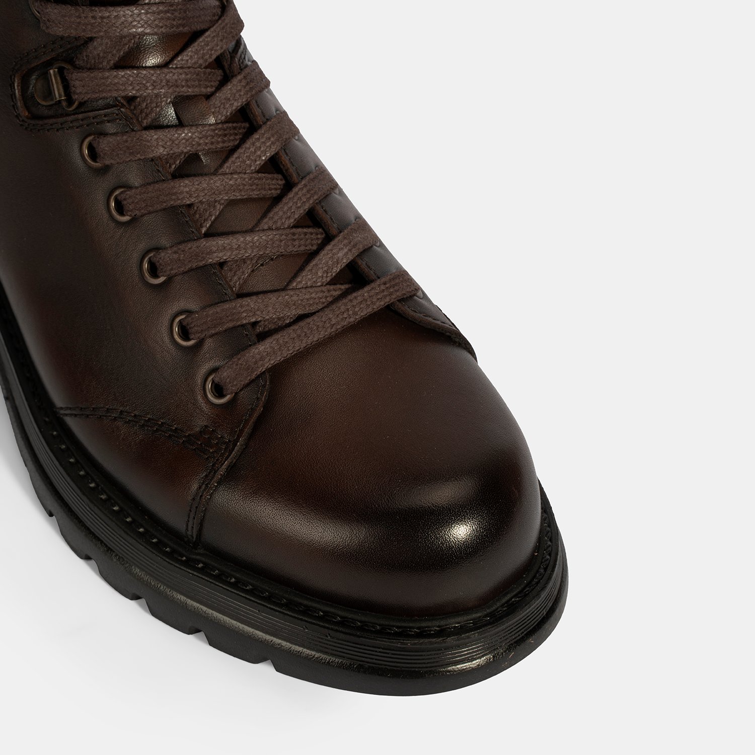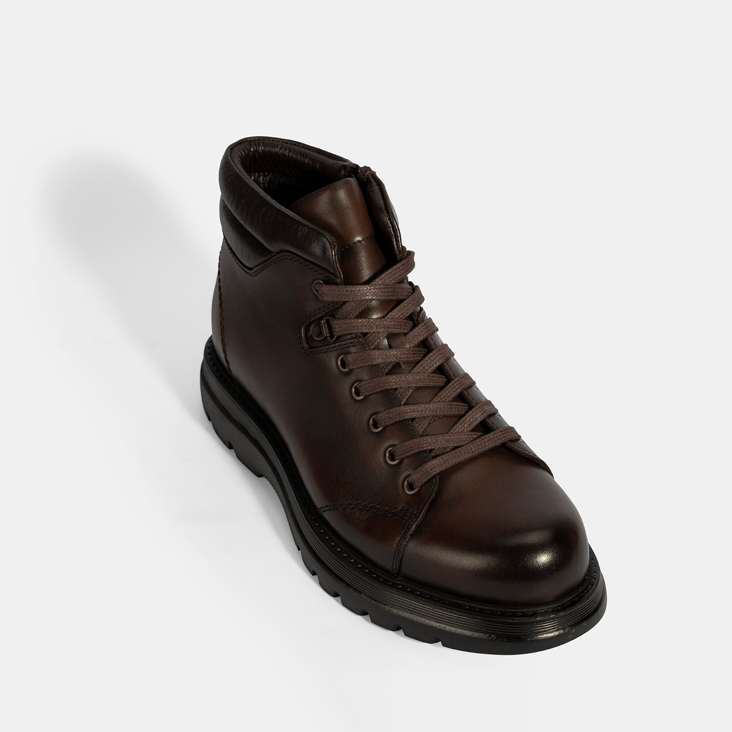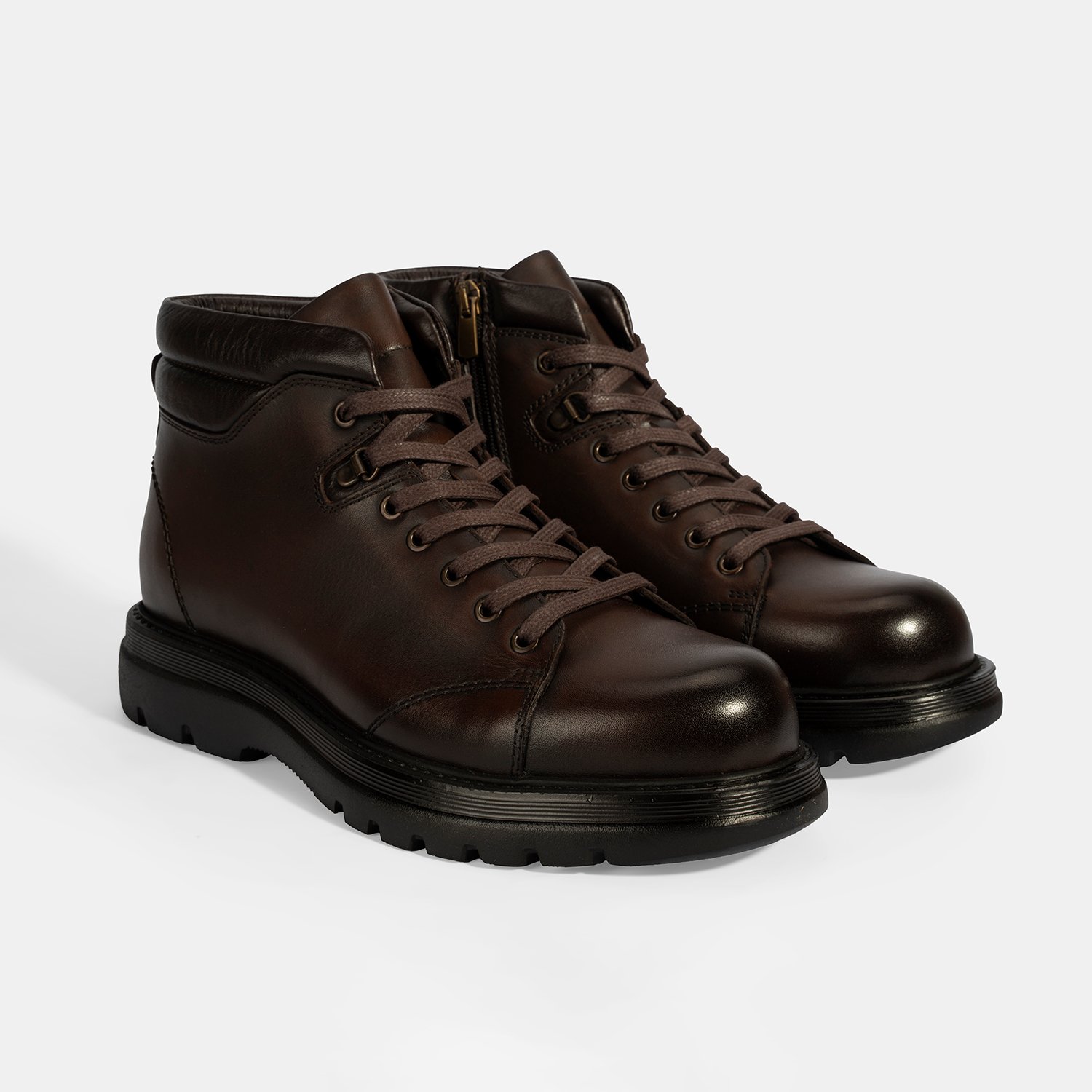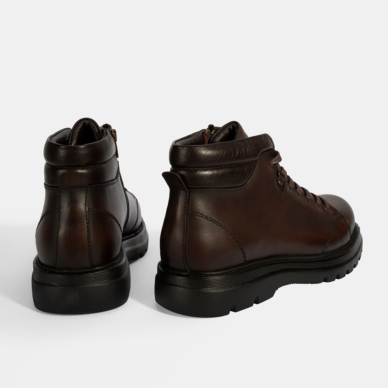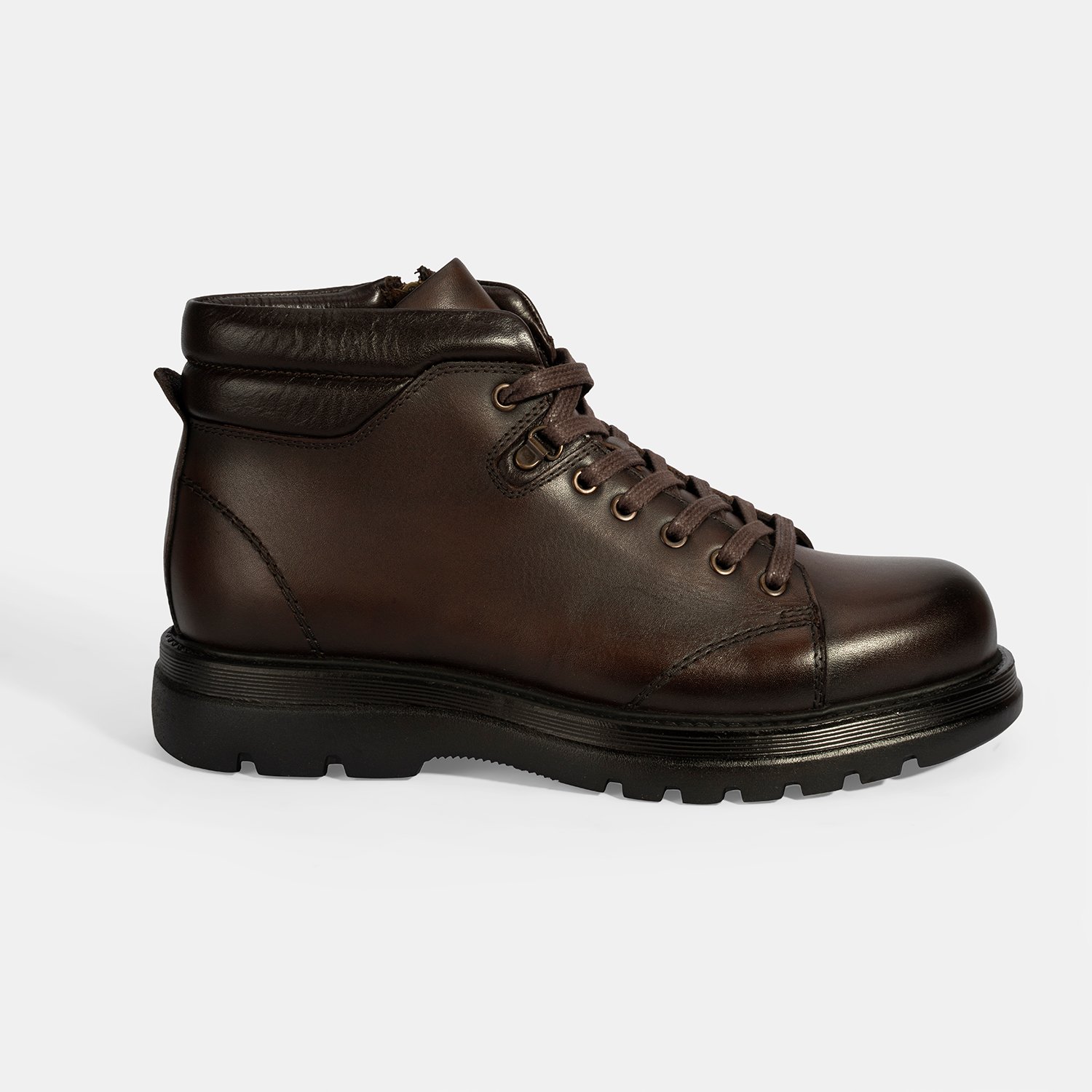 %100 deri, %100 deri mostrali, tekstil astarlı, bağcıklı, içten fermuarlı, EVA tabanlı erkek bot.