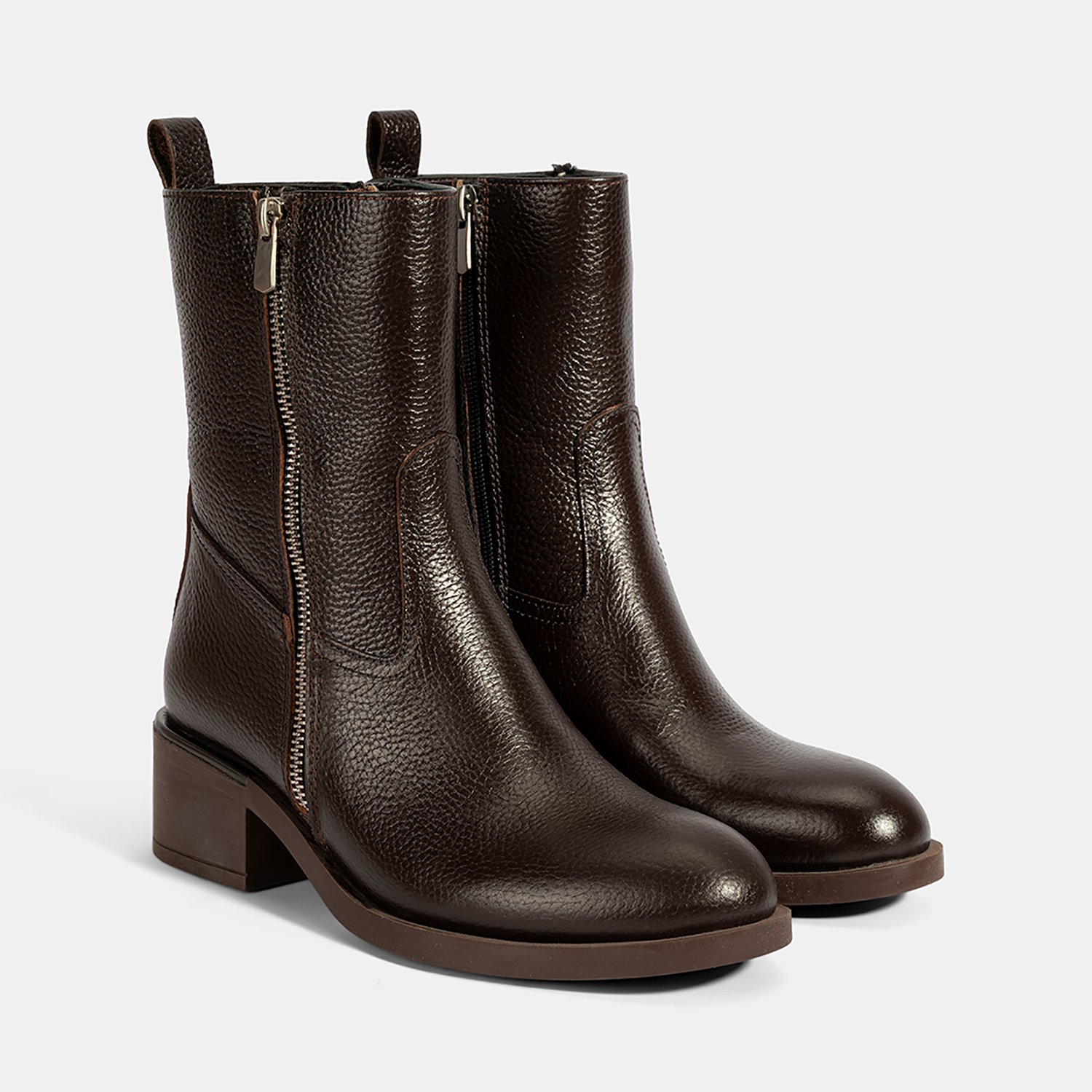 Kadın Kahve Fermuarlı Deri Topuklu Bot