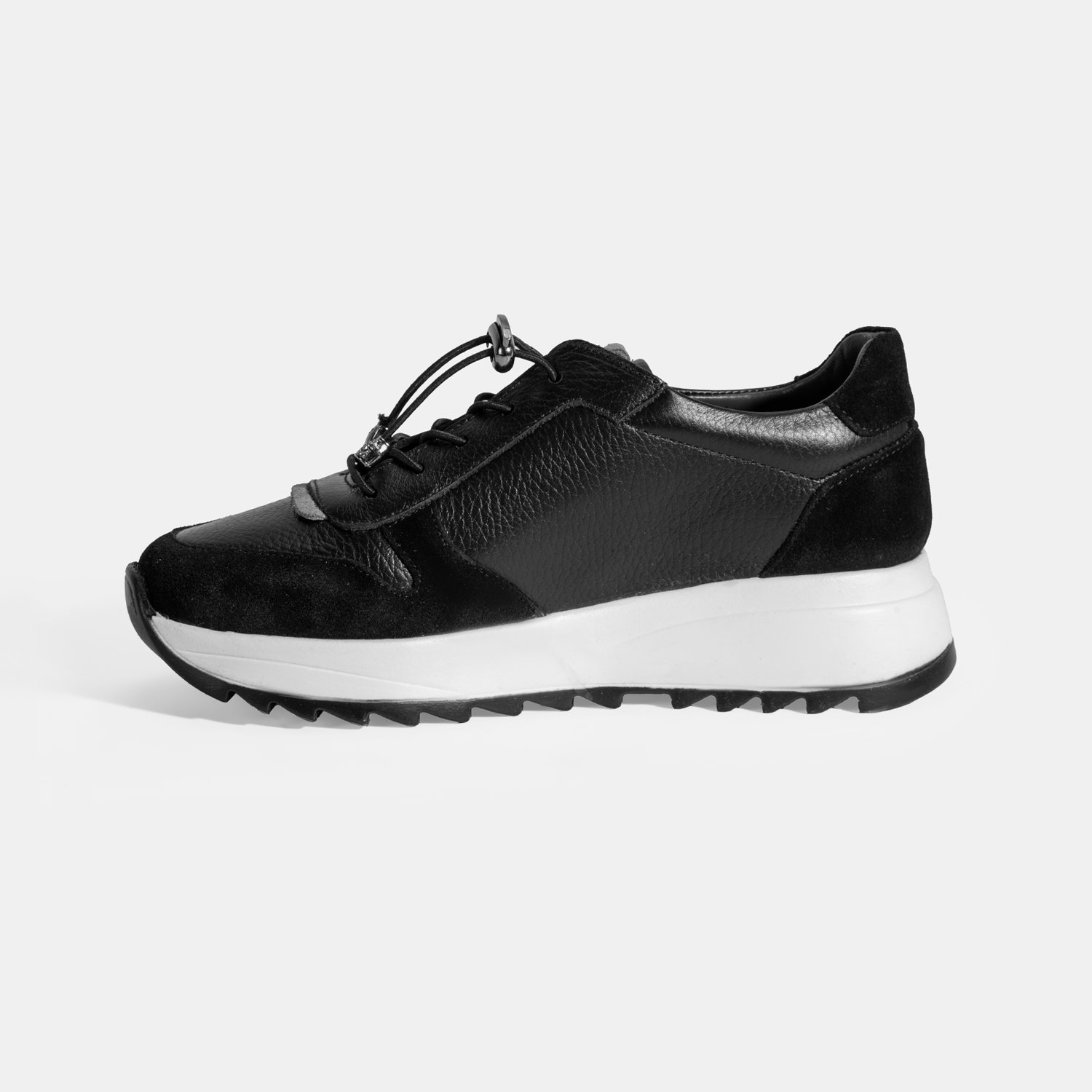 %100 deri, deri iç tabanlı, deri astarlı, pu tabanlı, kolay giyilebilir ve ayarlanabilir lastik bağcıklı kadın spor ayakkabı. Topuk yüksekliği 3,5 cm