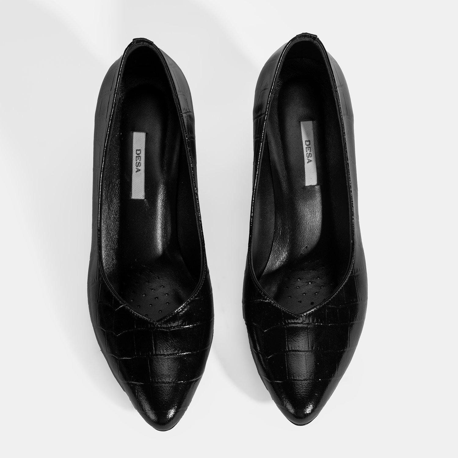 %100 kroko baskılı deri, deri iç tabanlı, deri astarlı, tpu tabanlı, sivri burunlu, kalın topuklu, kadın klasik ayakkabı. Topuk yüksekliği 6,5 cm