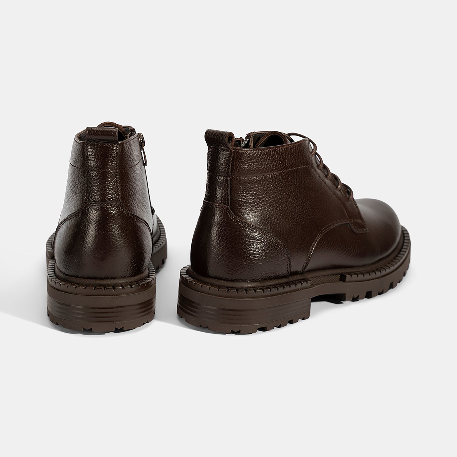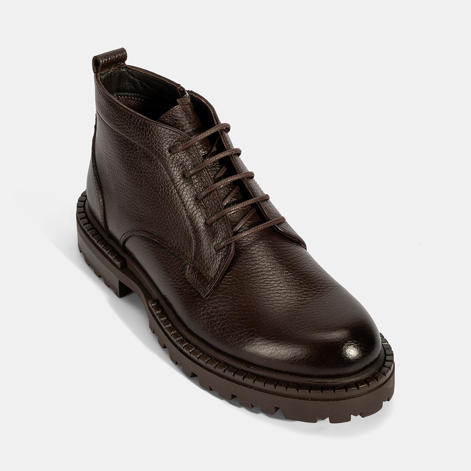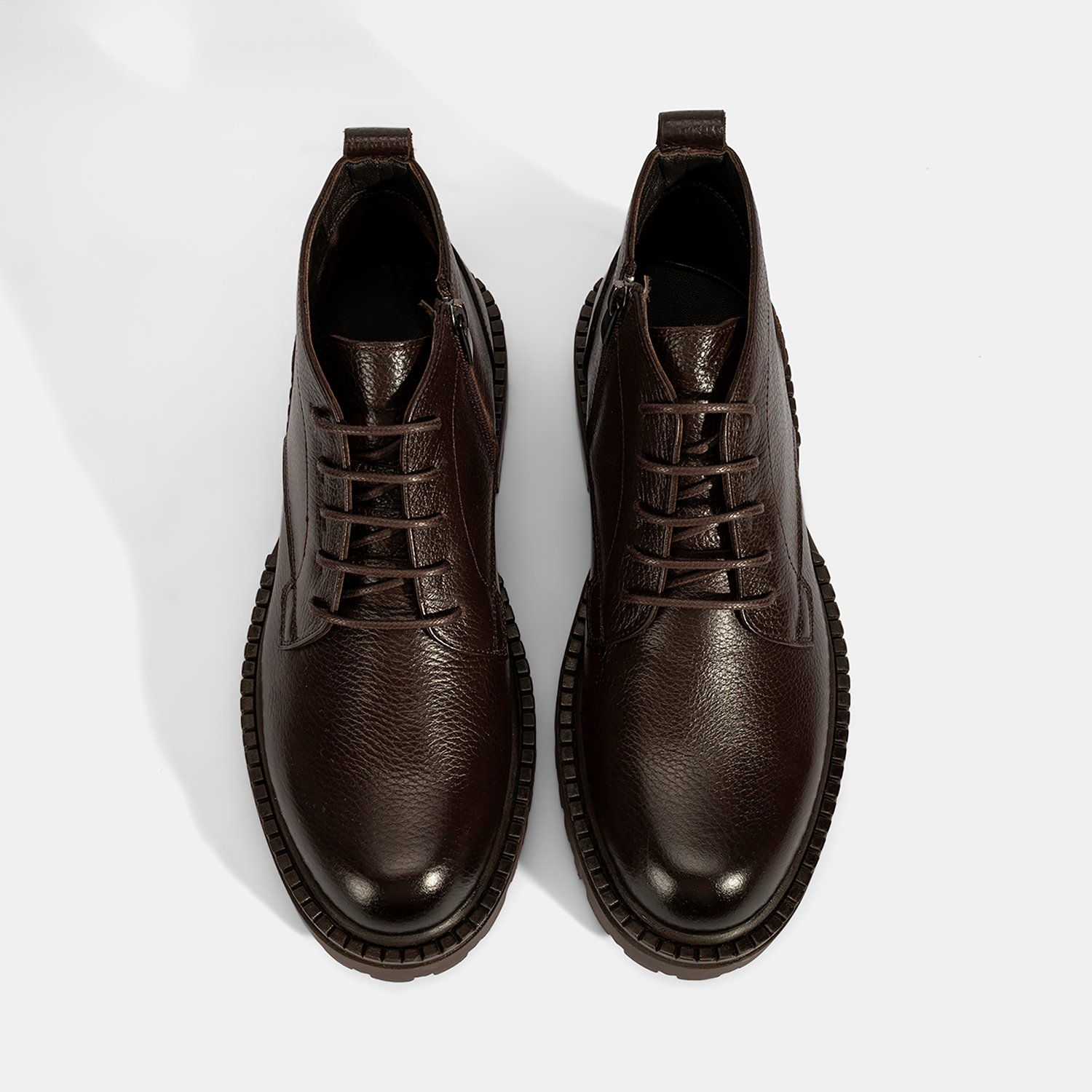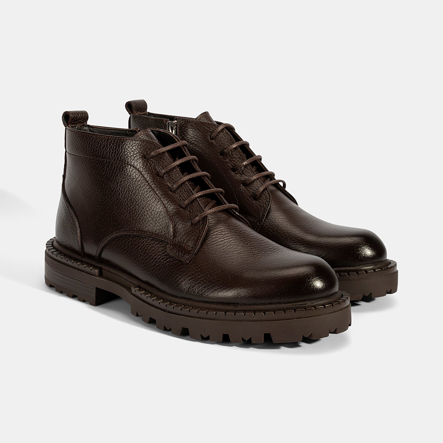 %100 deri, deri iç tabanlı, tekstil astarlı, termo tabanlı, içten fermuarlı erkek bağcıklı bot. Topuk yüksekliği: 3 cm.