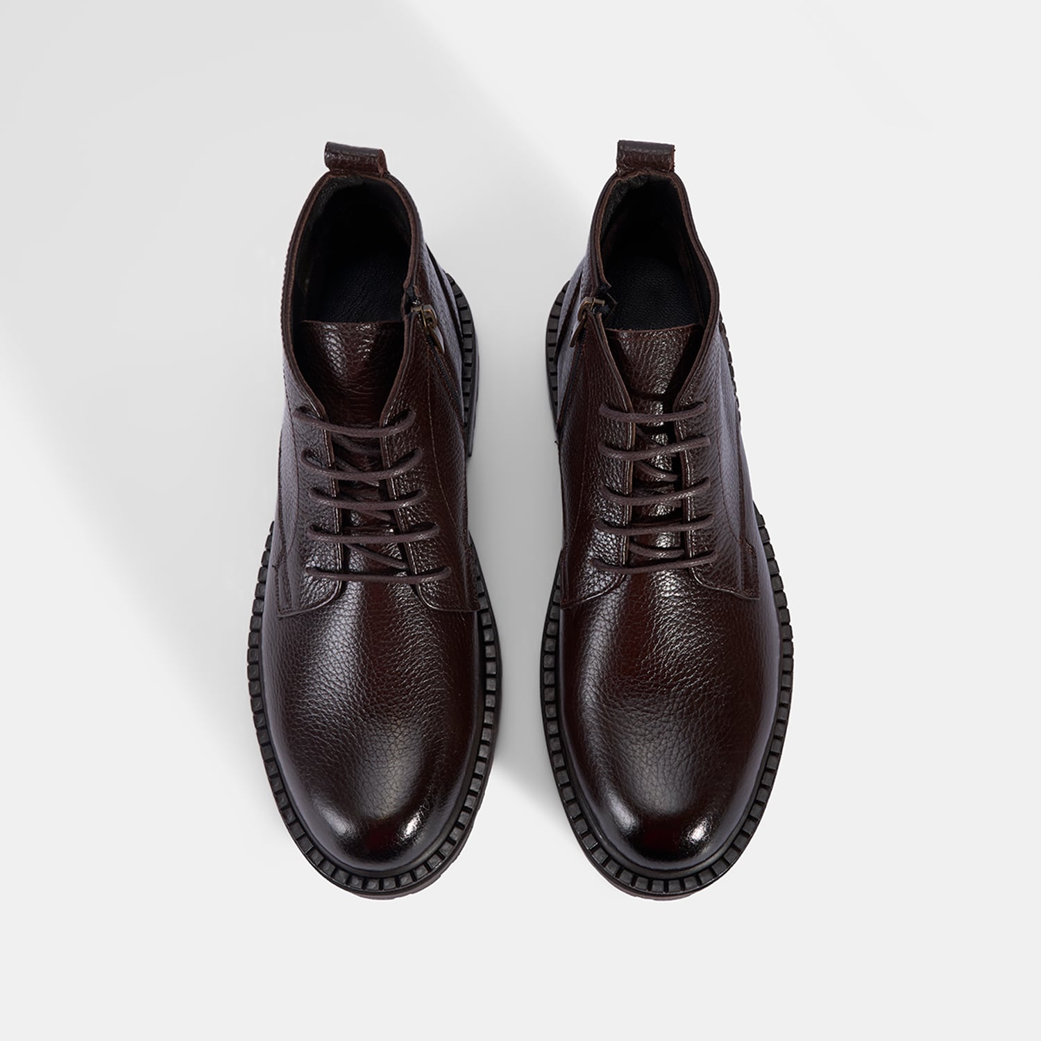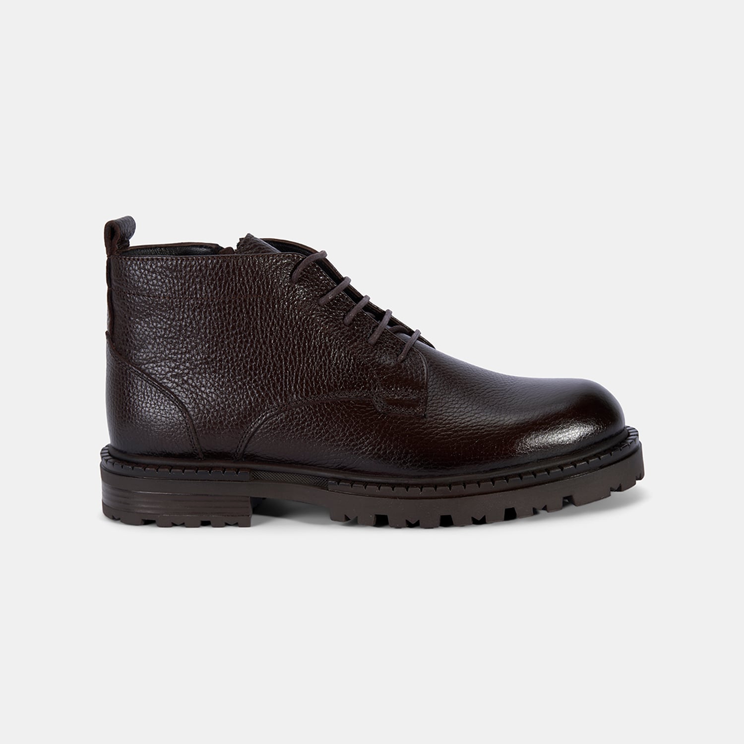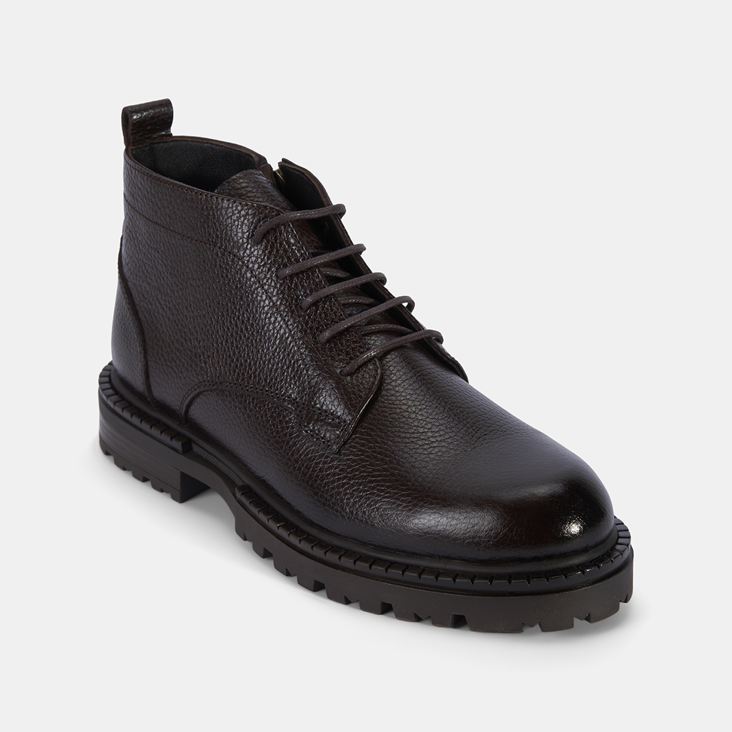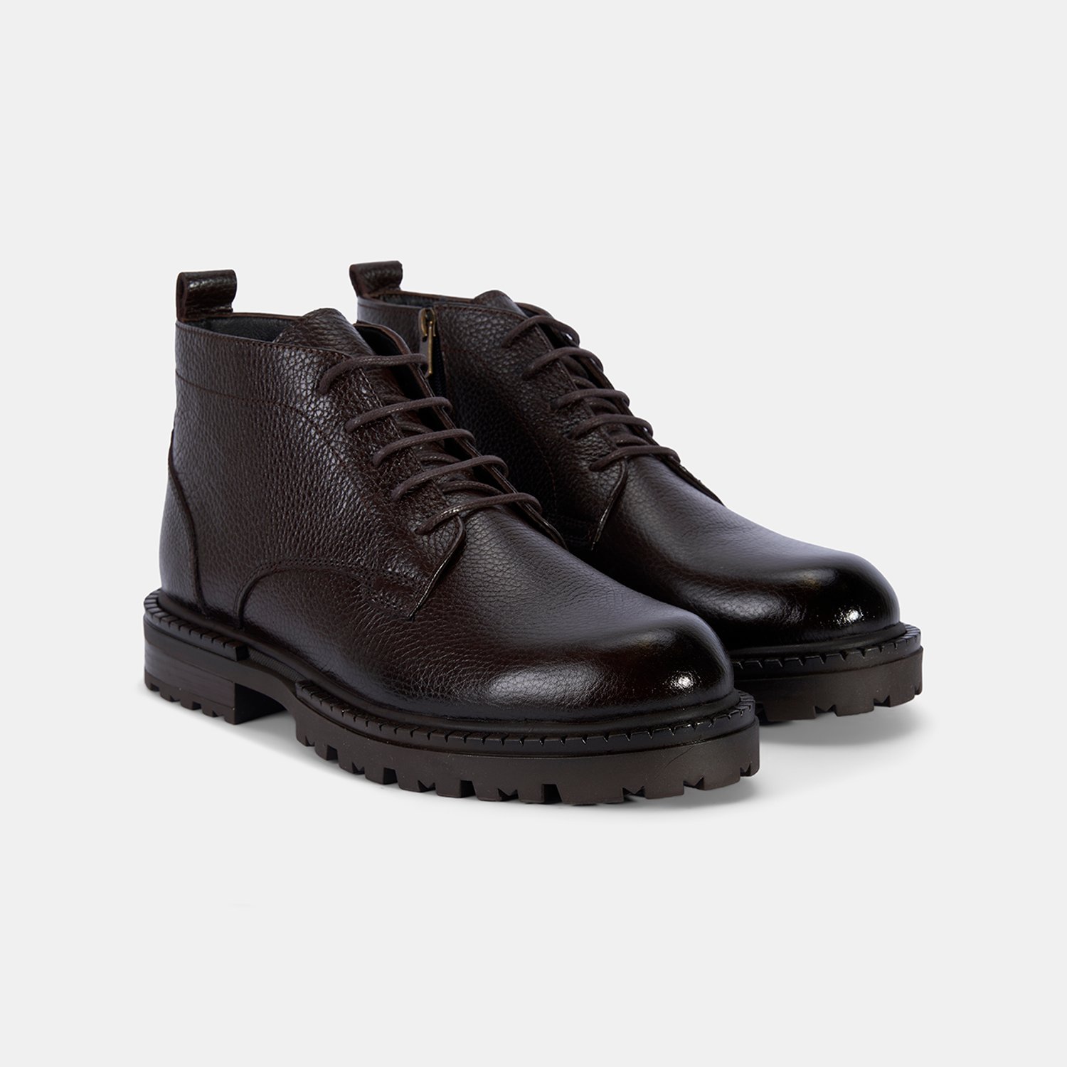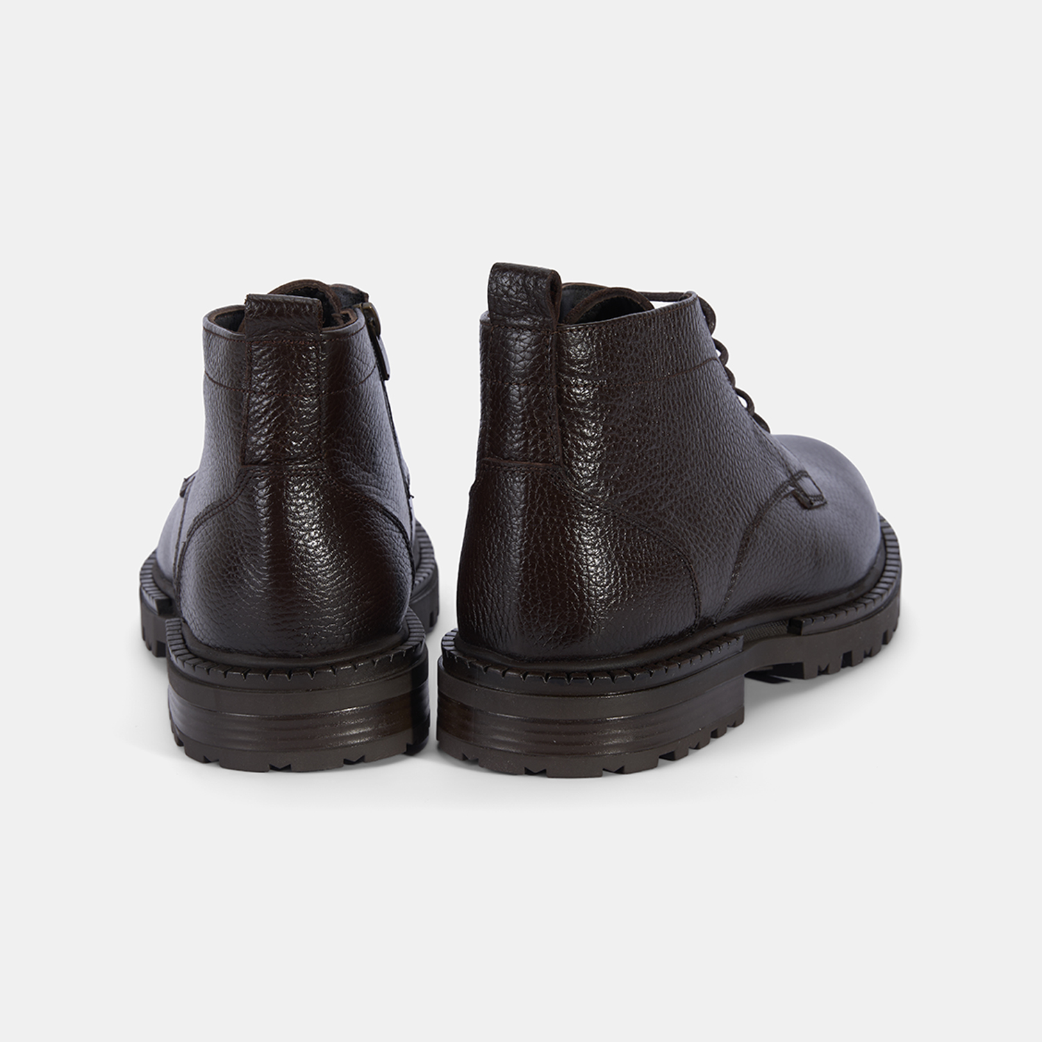 %100 deri, deri iç tabanlı, tekstil astarlı, termo tabanlı, içten fermuarlı erkek bağcıklı bot. Topuk yüksekliği: 3 cm.