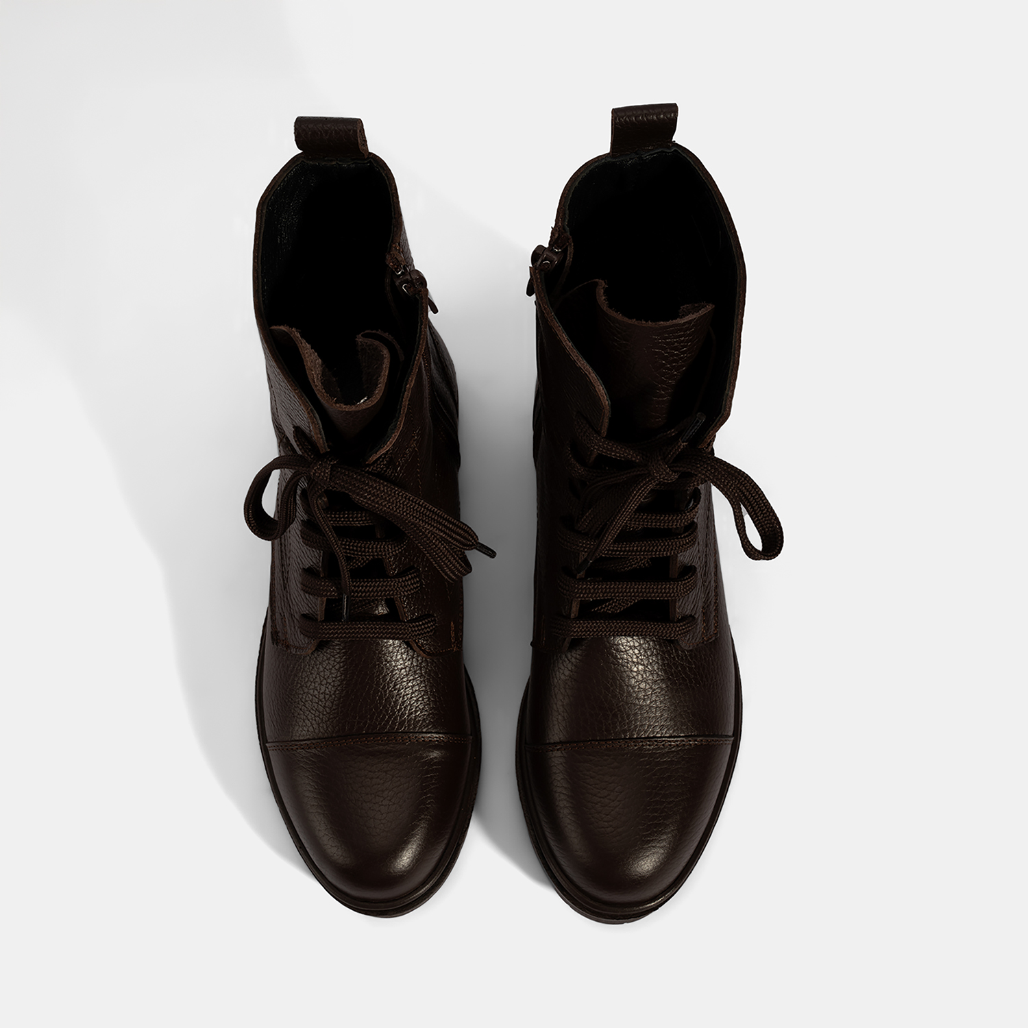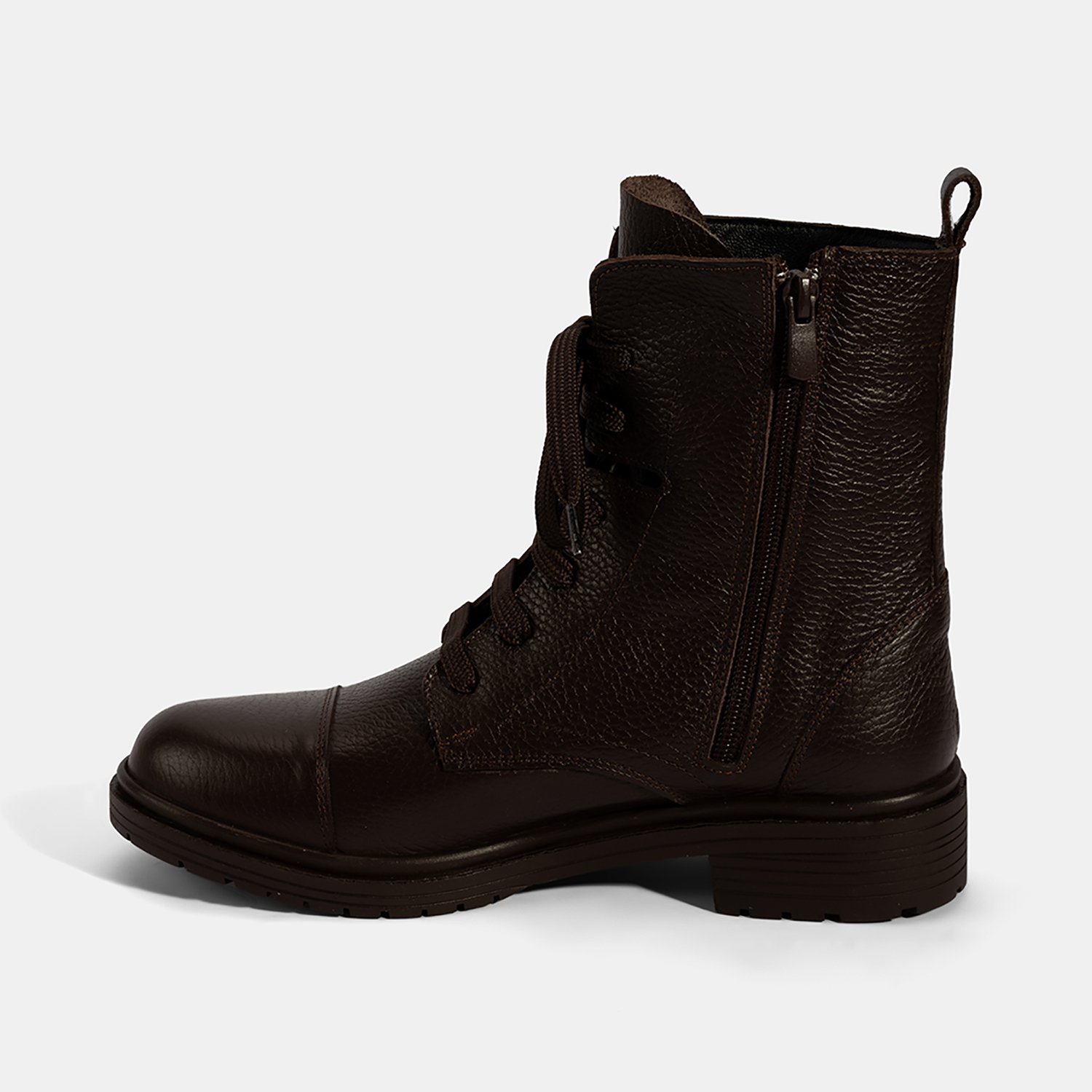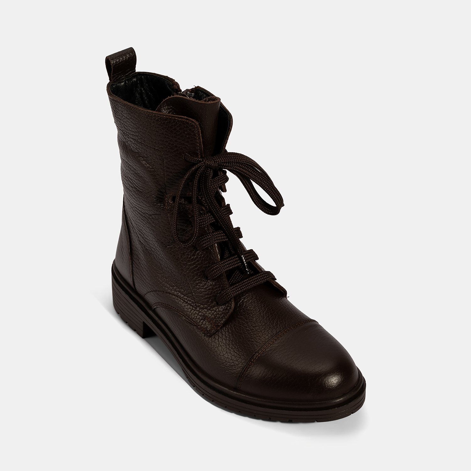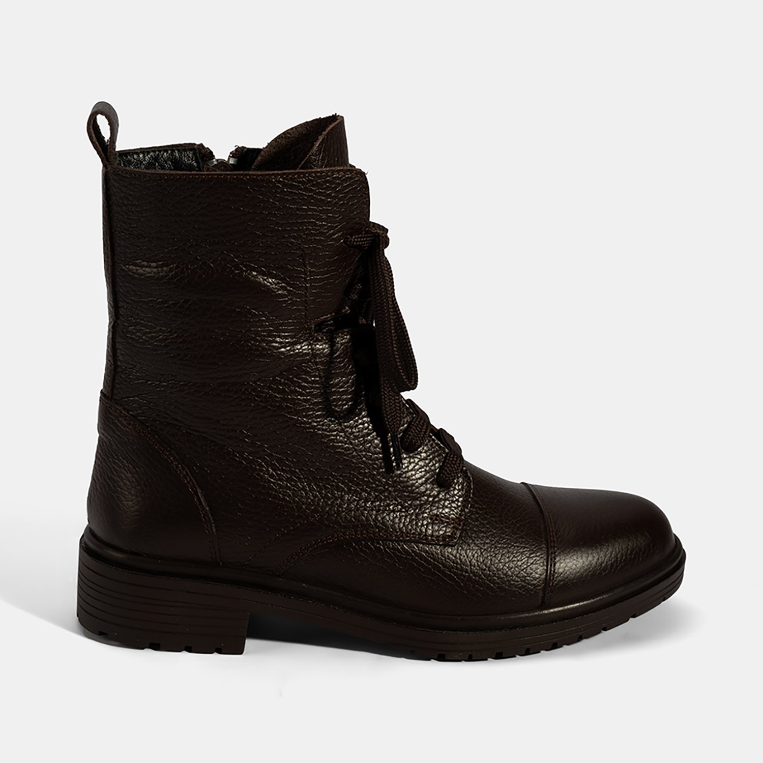 %100 deri, deri iç tabanlı, sıcak tekstil astarlı, termo tabanlı, bağcıklı kadın postalı. Topuk yüksekliği: 3,5 cm.