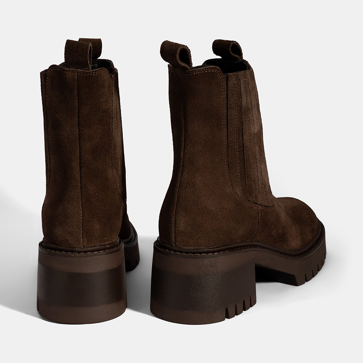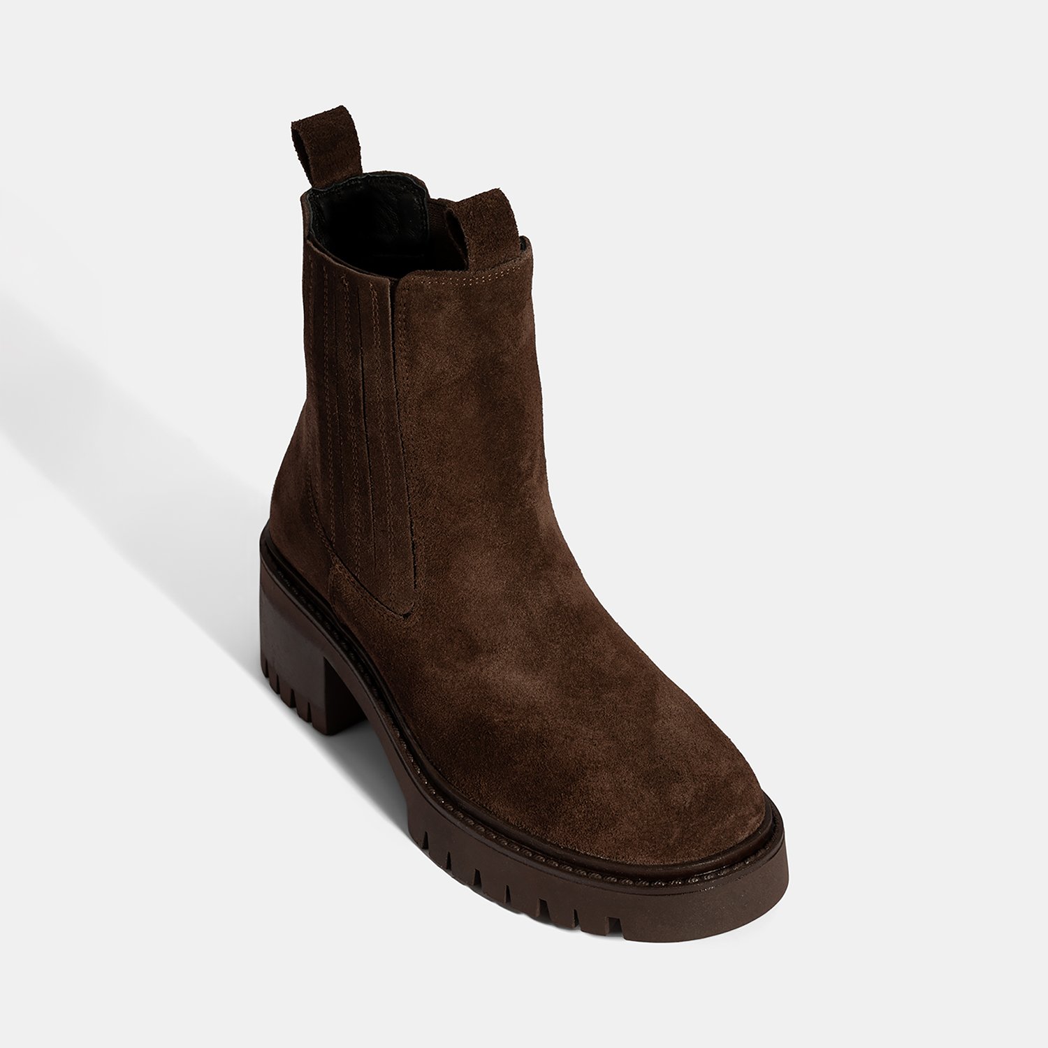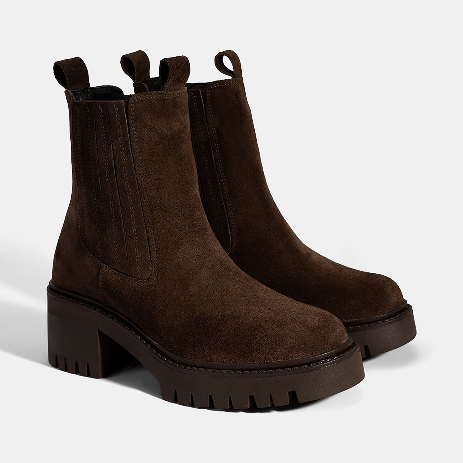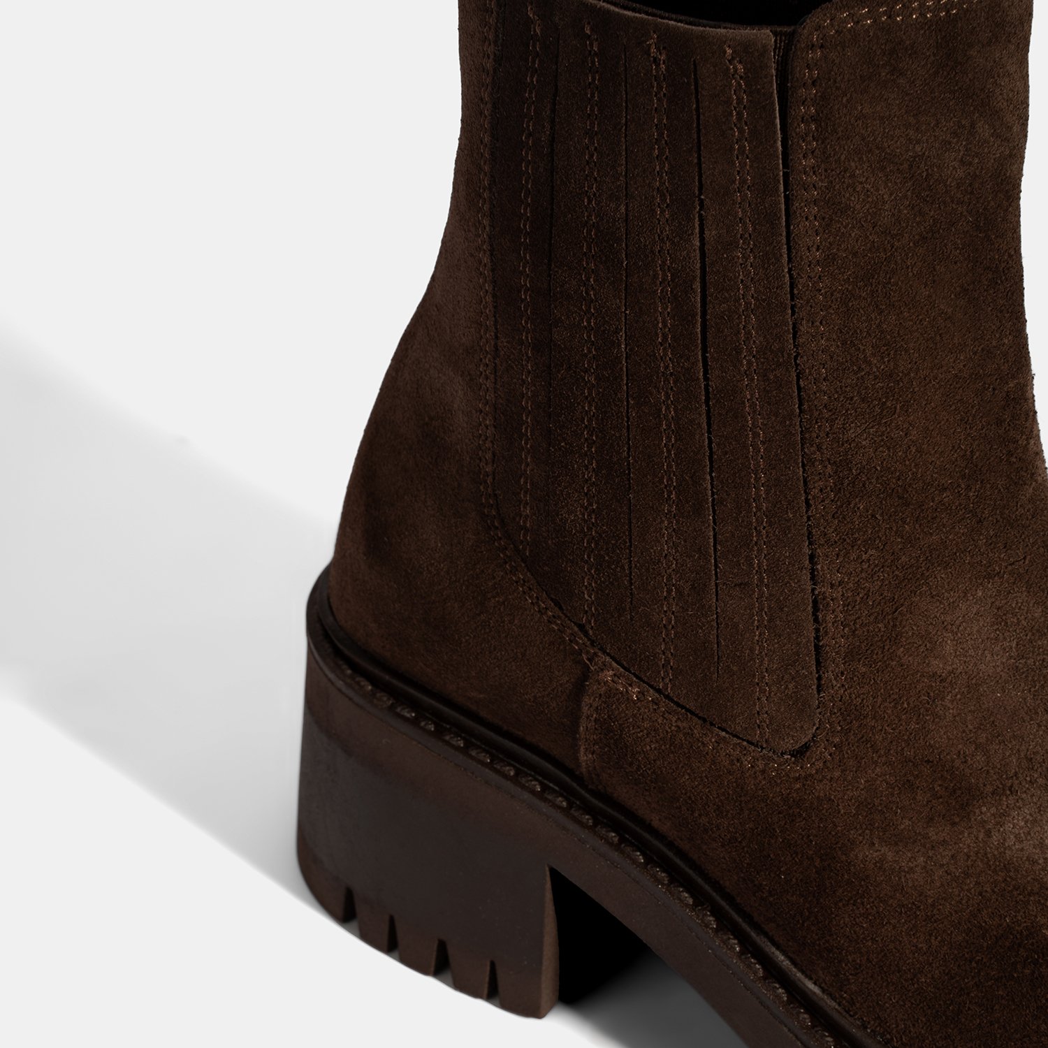 %100 süet deri, deri iç tabanlı, tekstil astarlı, termo tabanlı, lastik detaylı, kalın topuklu kadın Chelsea bot. Topuk yüksekliği: 3 cm.