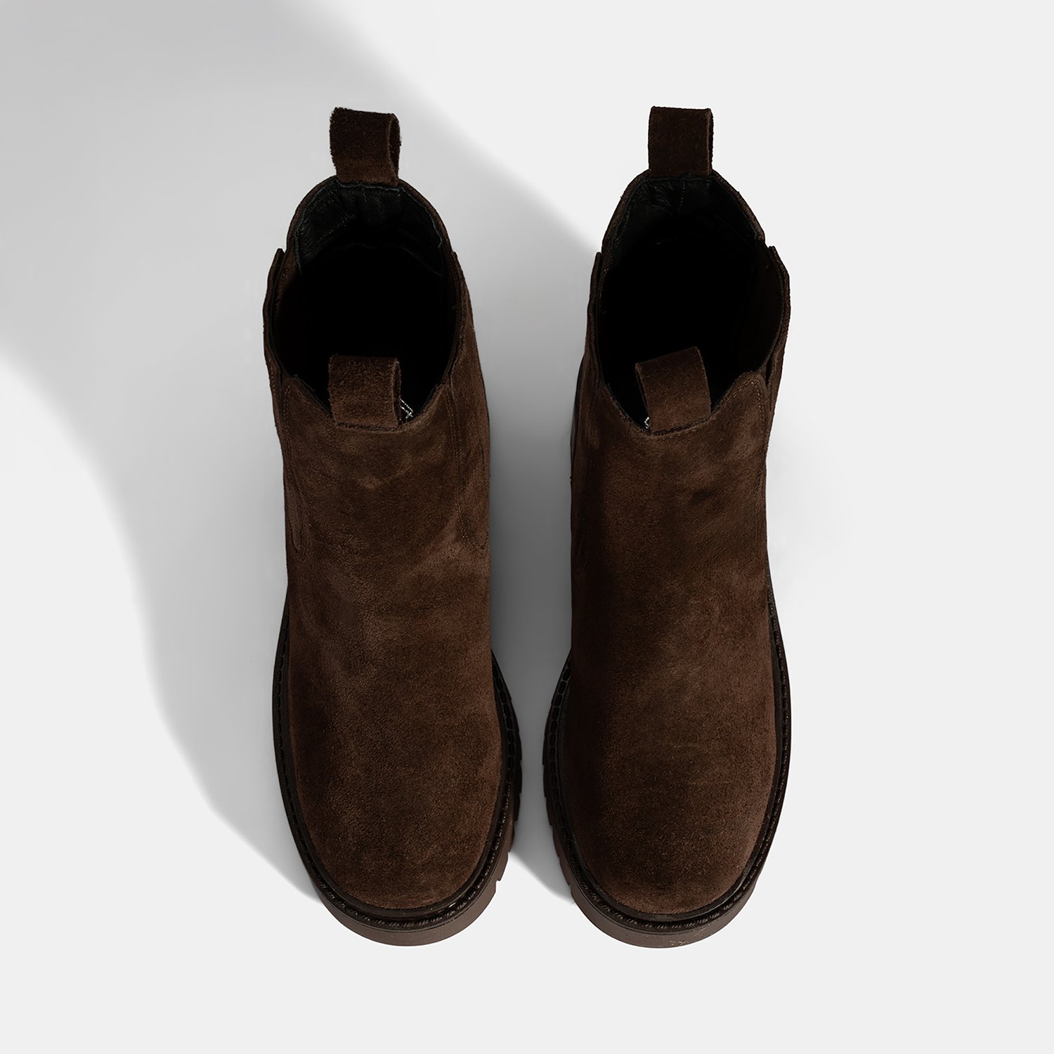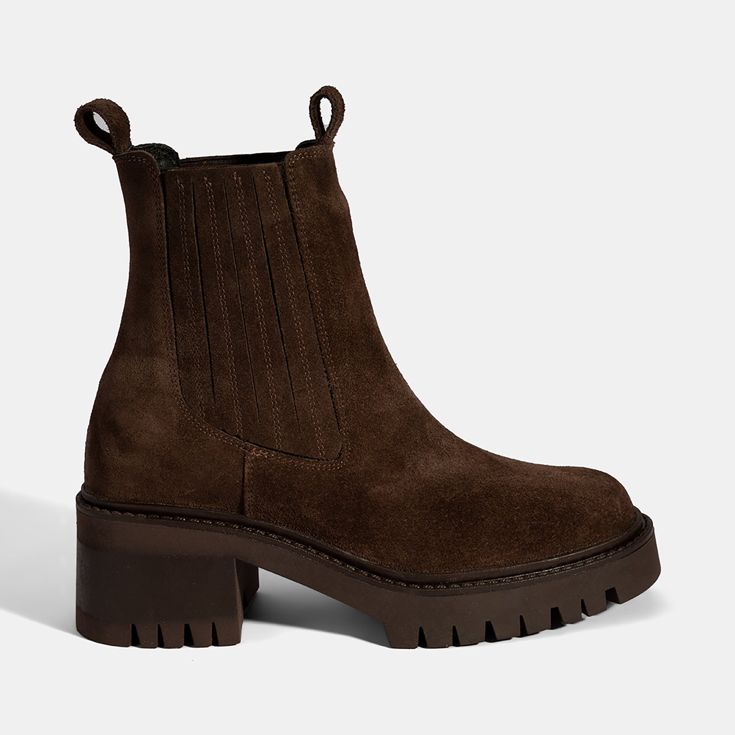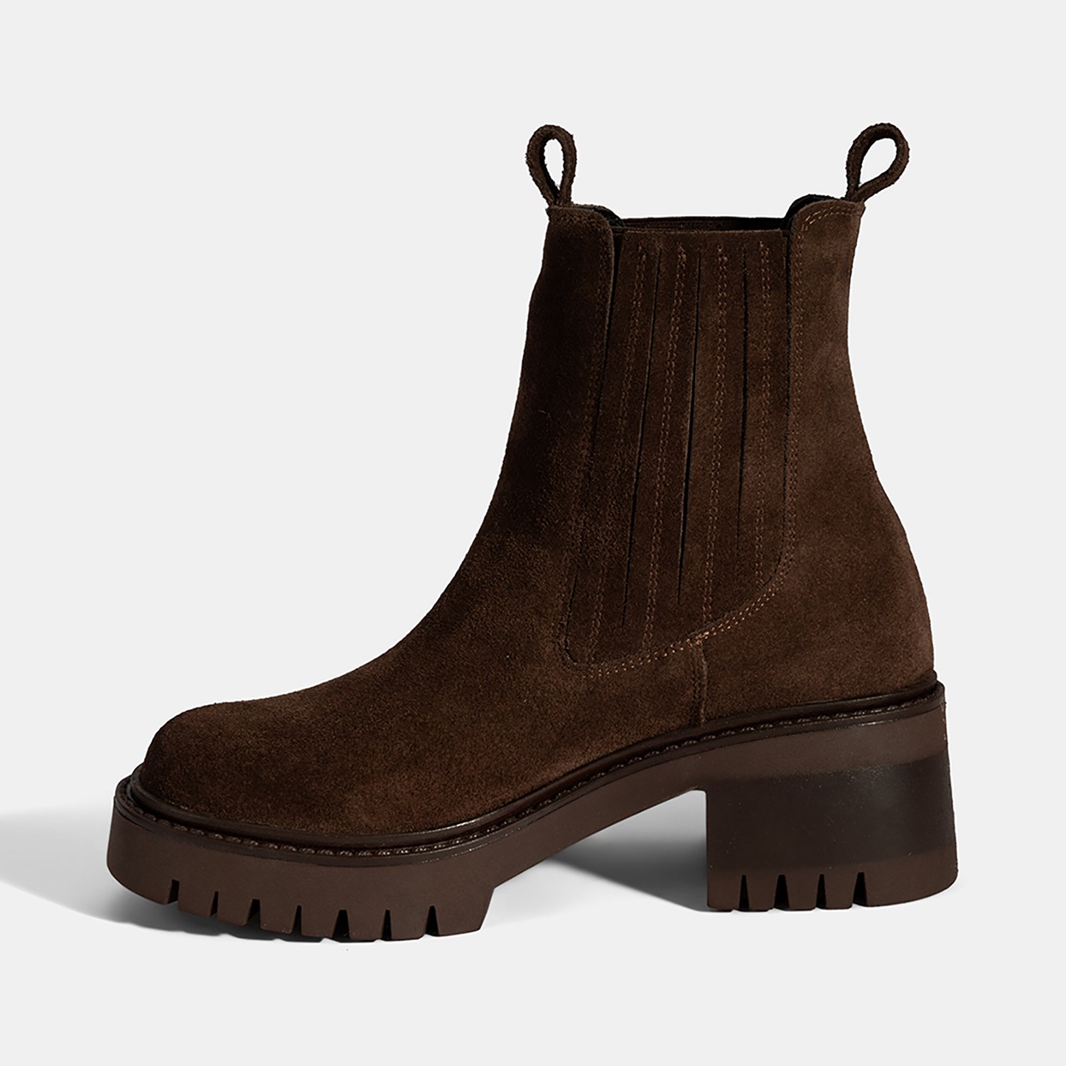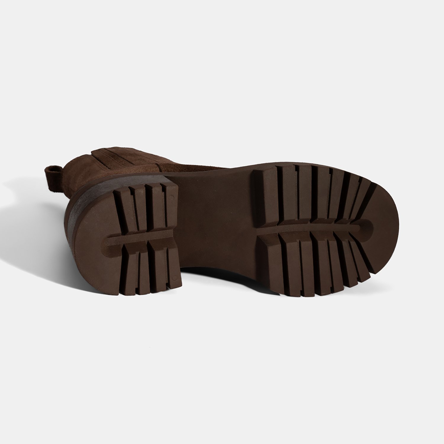 %100 süet deri, deri iç tabanlı, tekstil astarlı, termo tabanlı, lastik detaylı, kalın topuklu kadın Chelsea bot. Topuk yüksekliği: 3 cm.