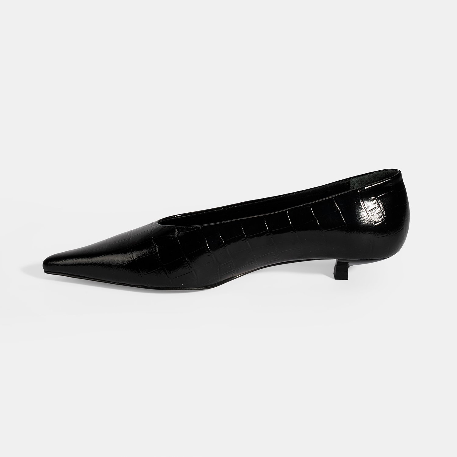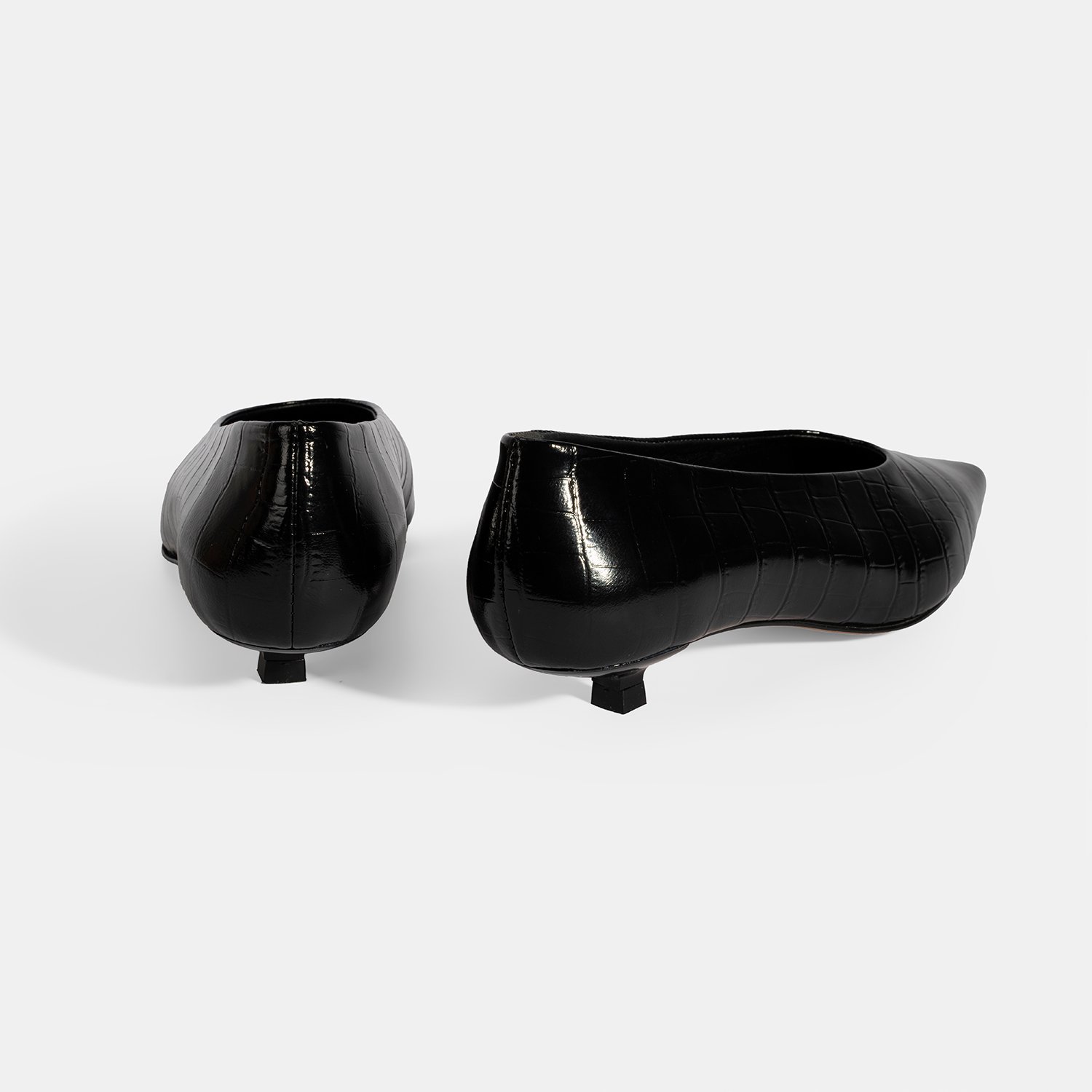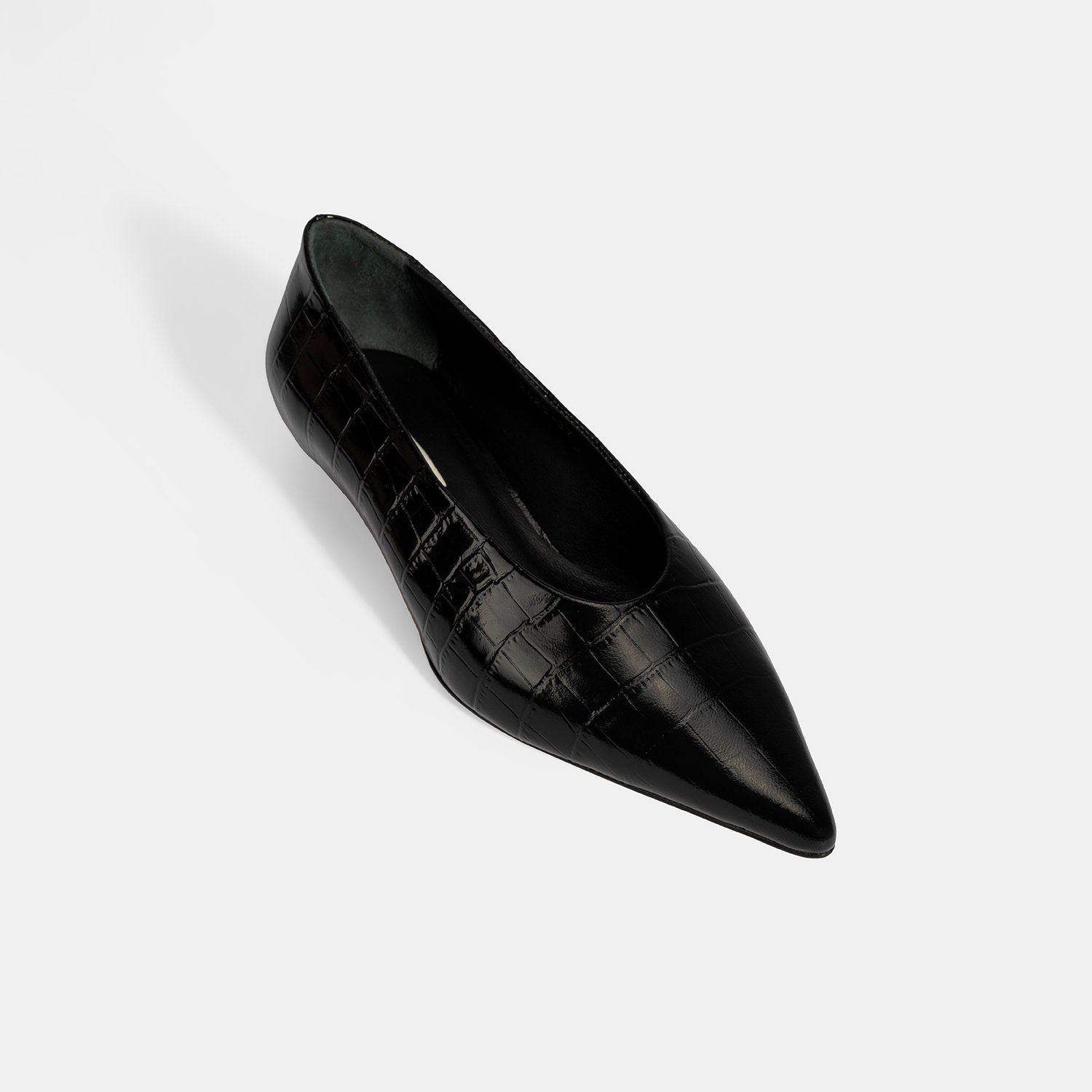 %100 kroko baskılı deri, deri iç tabanlı, deri astarlı, neolit tabanlı, kitten topuklu kadın ayakkabı. Topuk yüksekliği: 2,5 cm.