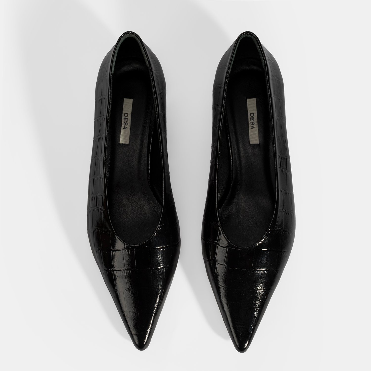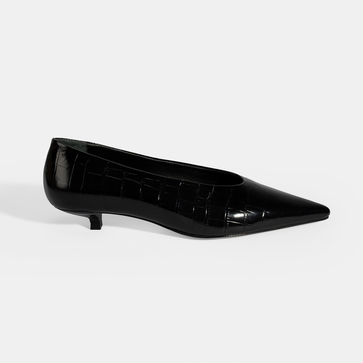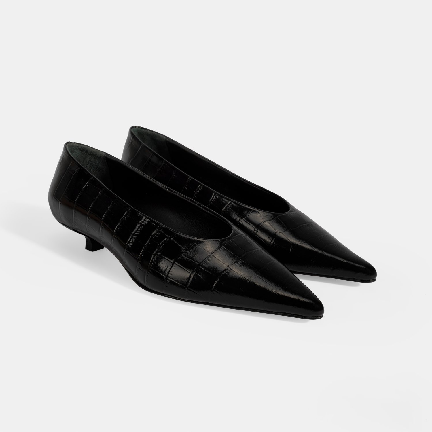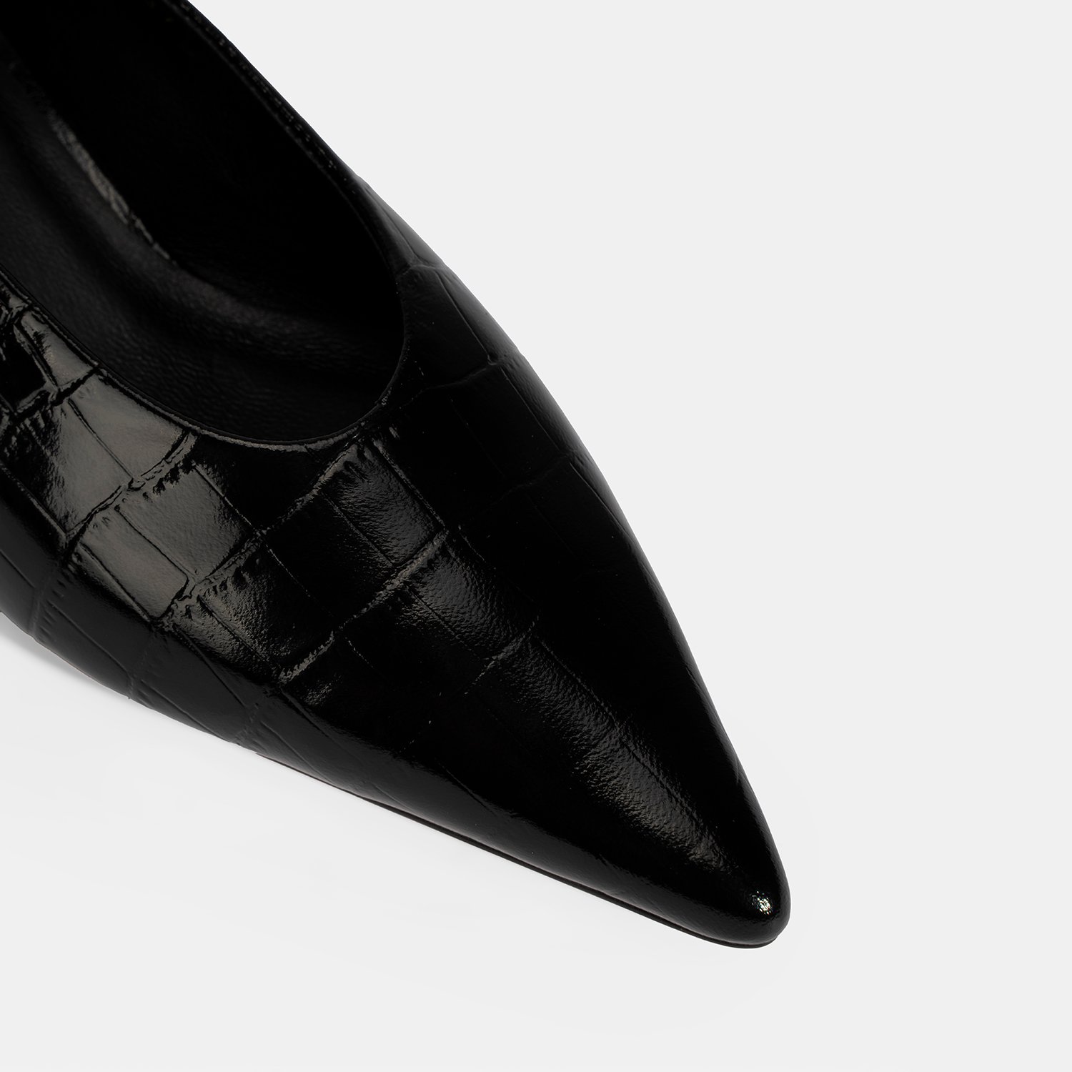 %100 kroko baskılı deri, deri iç tabanlı, deri astarlı, neolit tabanlı, kitten topuklu kadın ayakkabı. Topuk yüksekliği: 2,5 cm.
