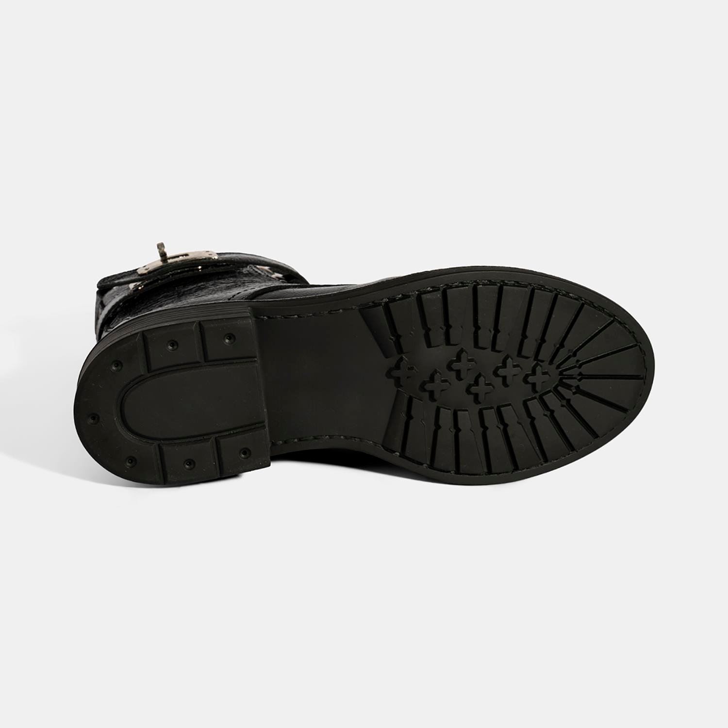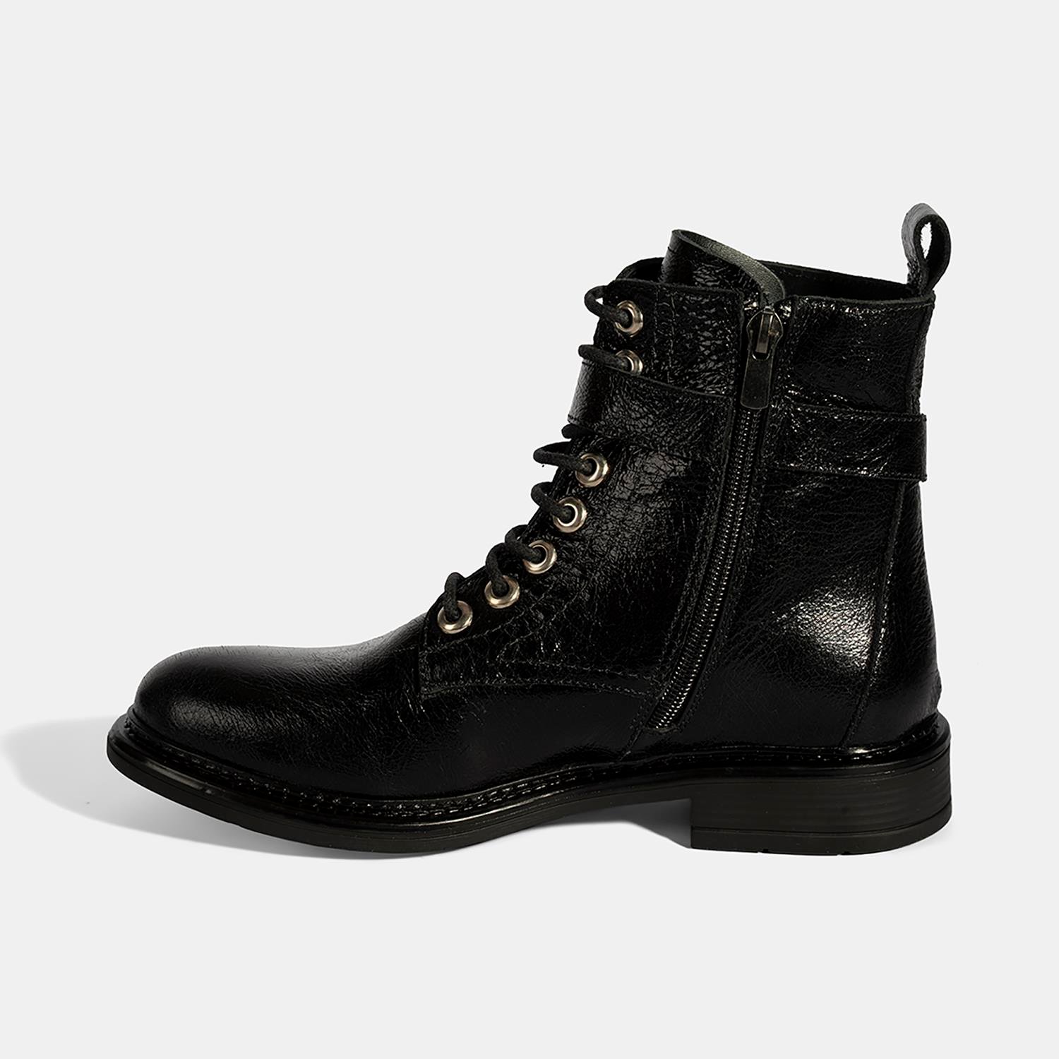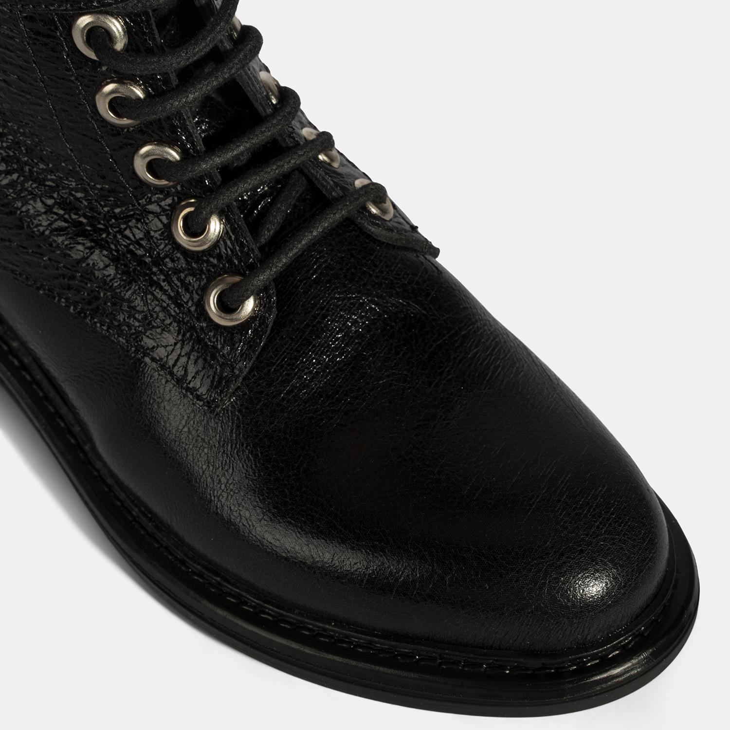 %100 deri, deri iç tabanlı, sıcak tekstil astarlı, metal aksesuar detaylı, içten fermuarlı, termo tabanlı, bağcıklı kadın bot. Topuk yüksekliği: 3 cm.