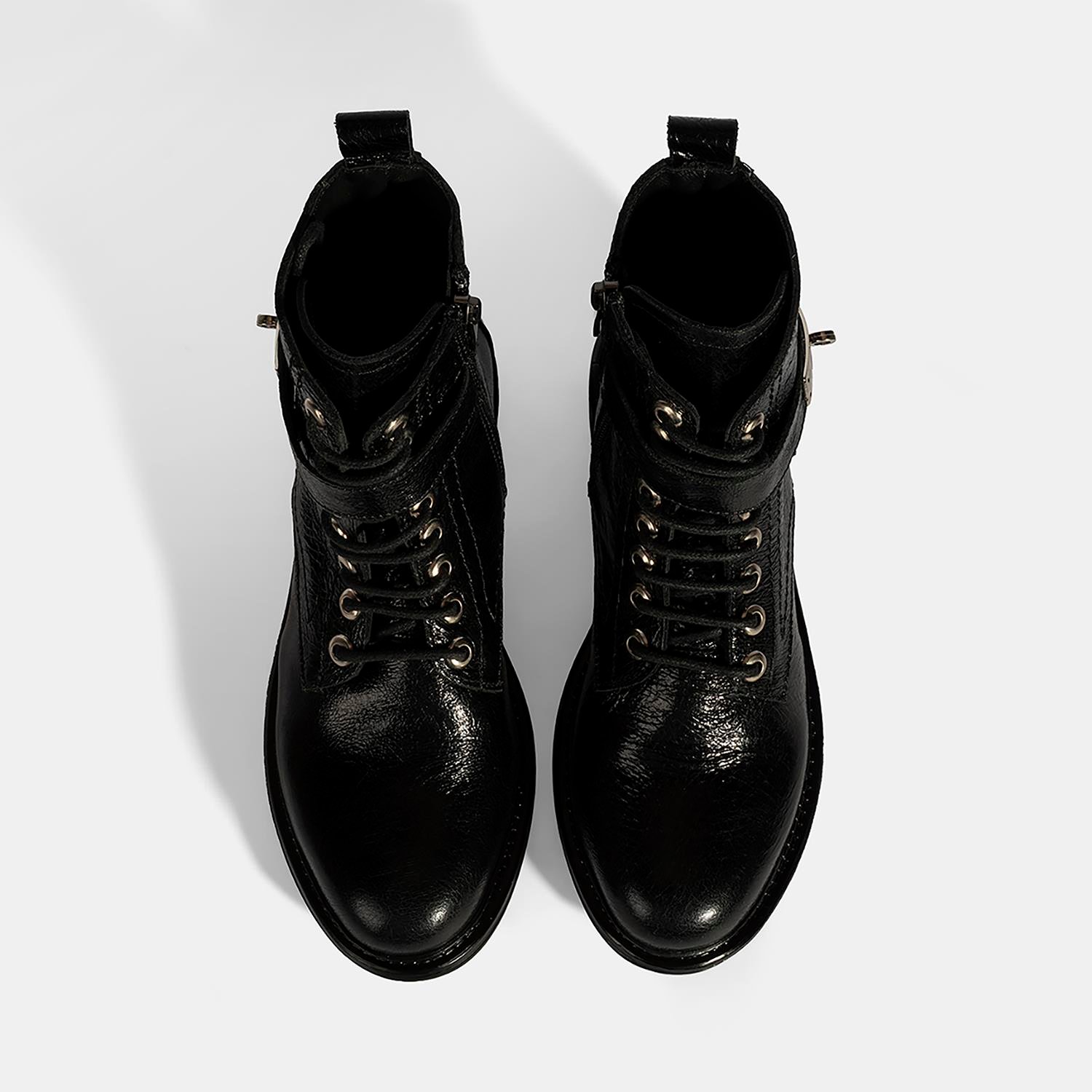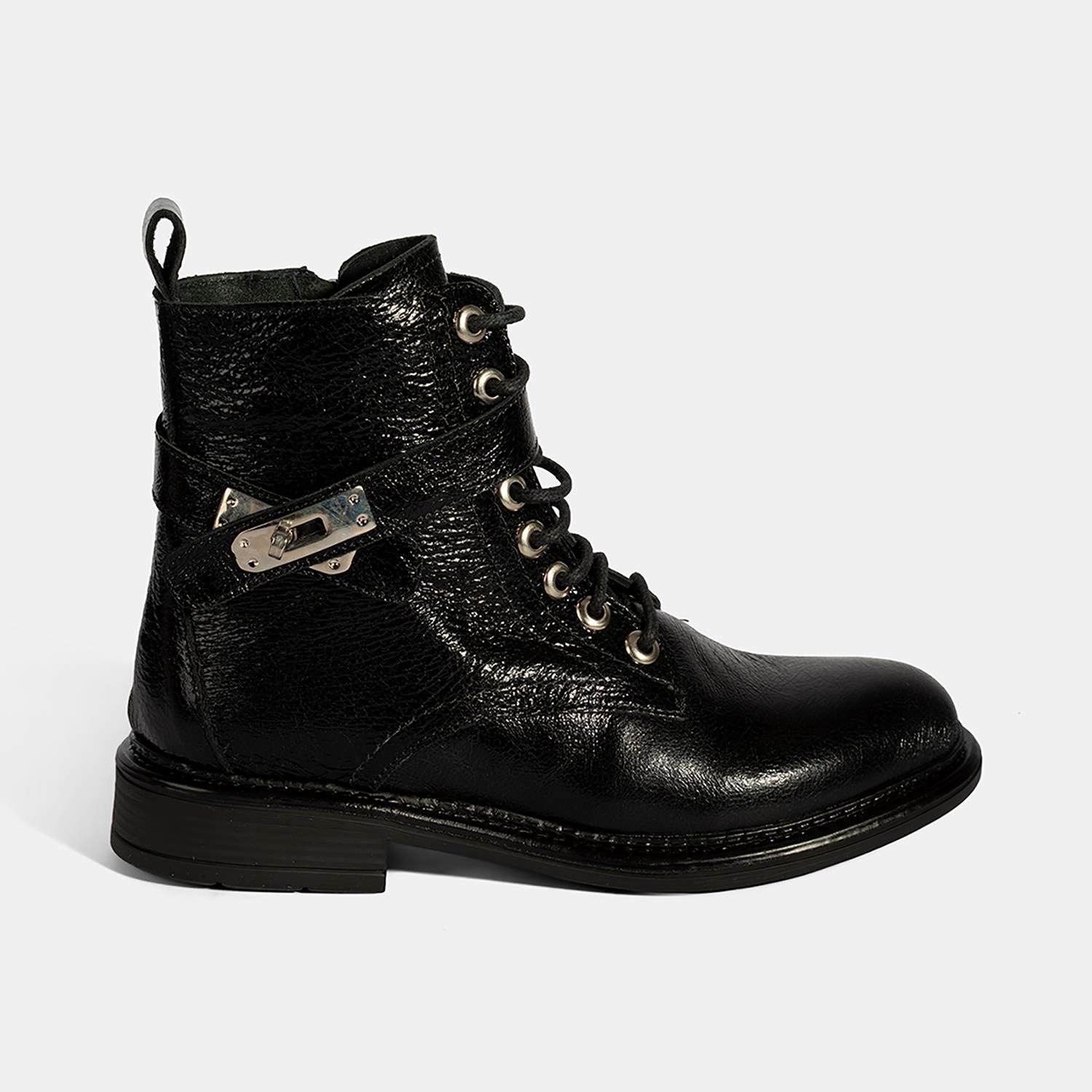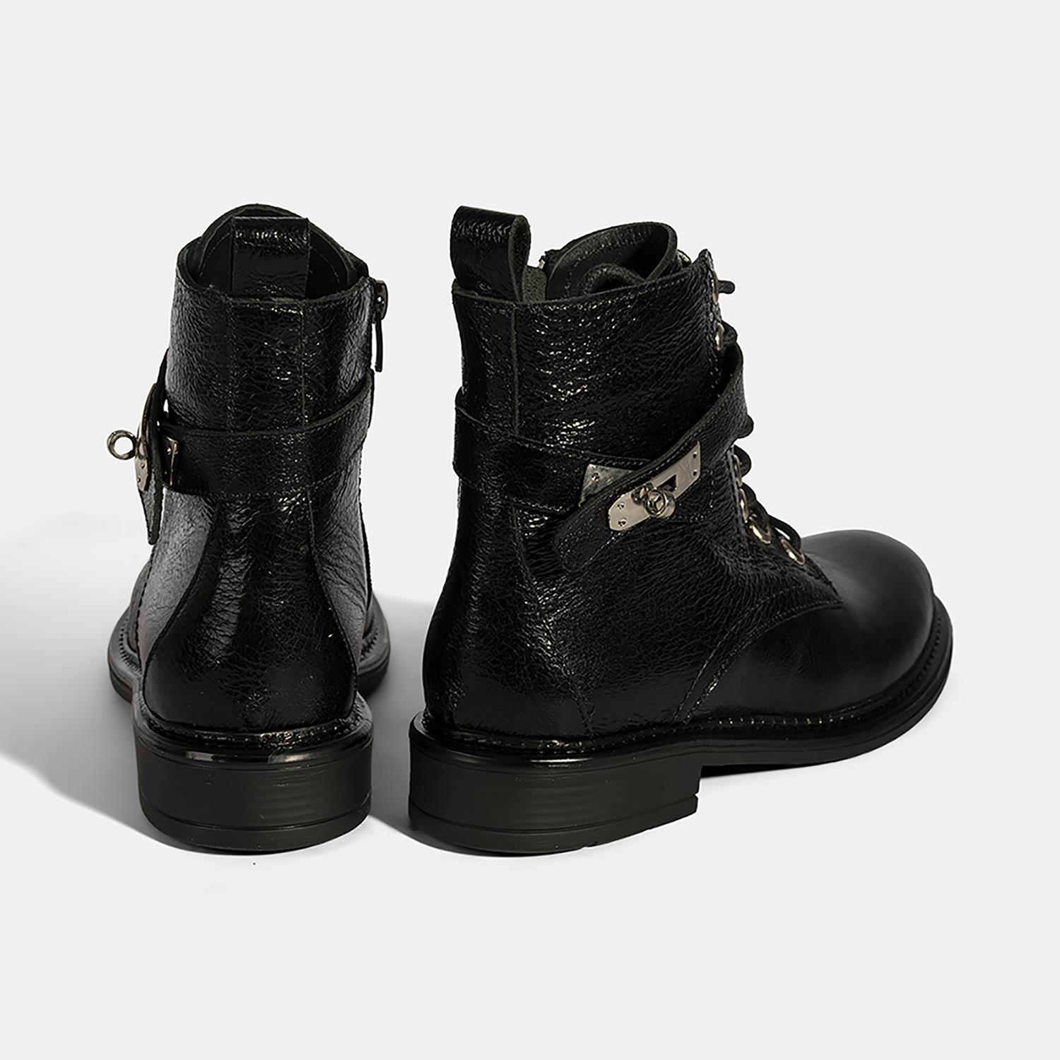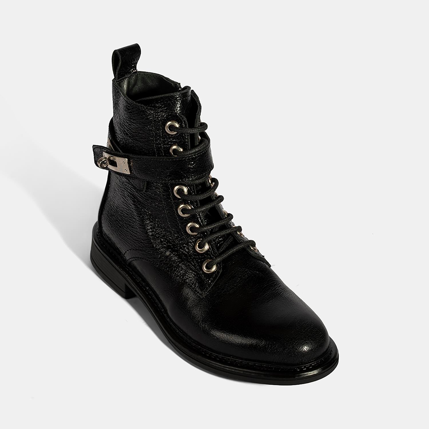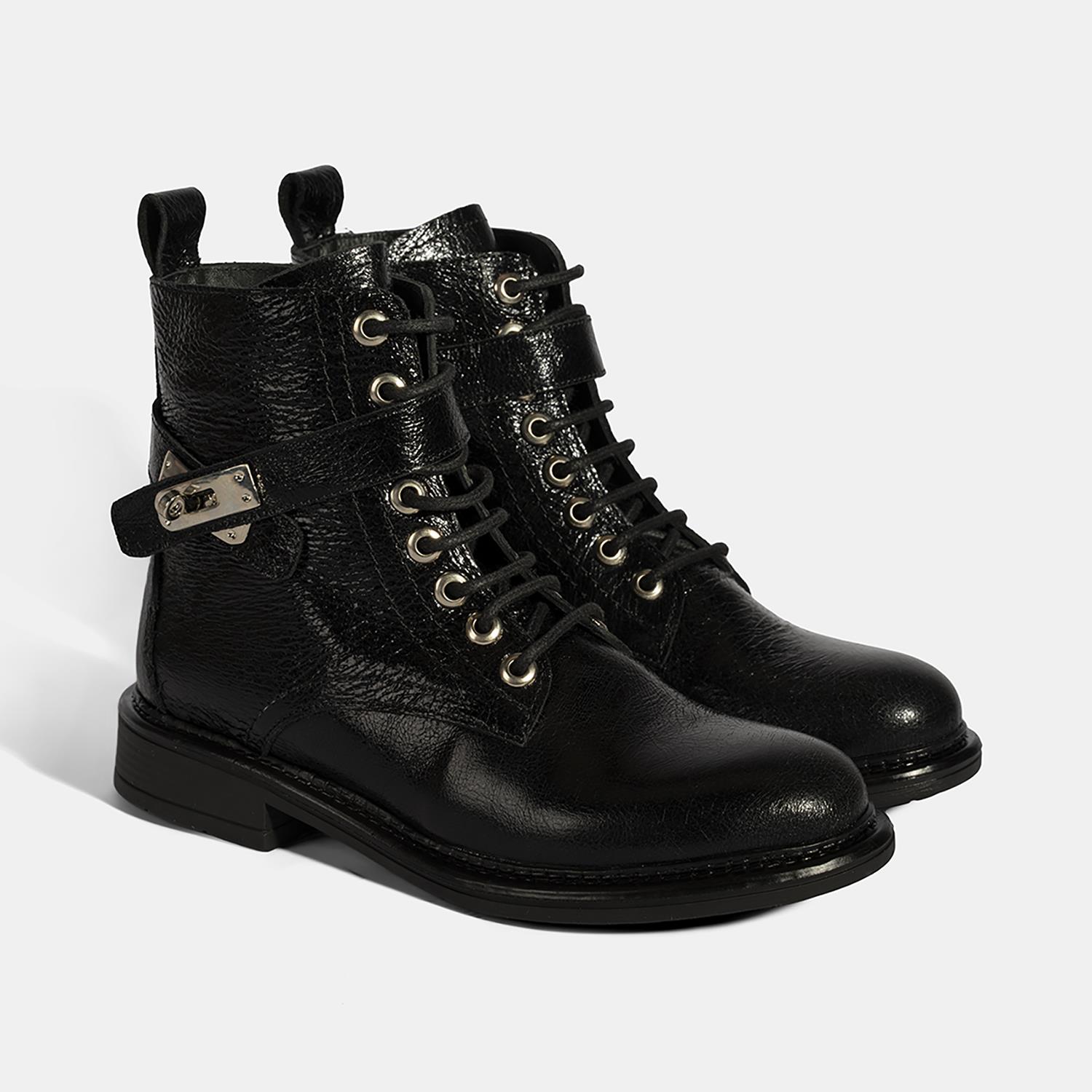 Kadın Siyah Bağcıklı Metal Aksesuarlı Deri Postal Bot