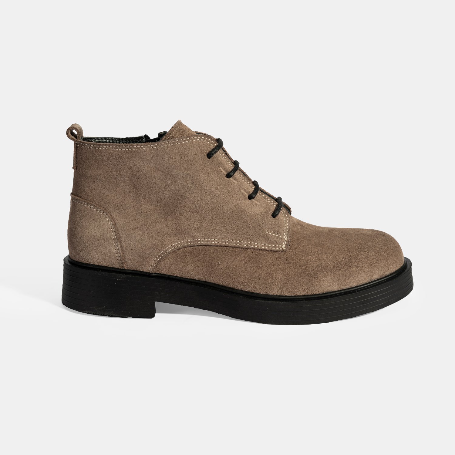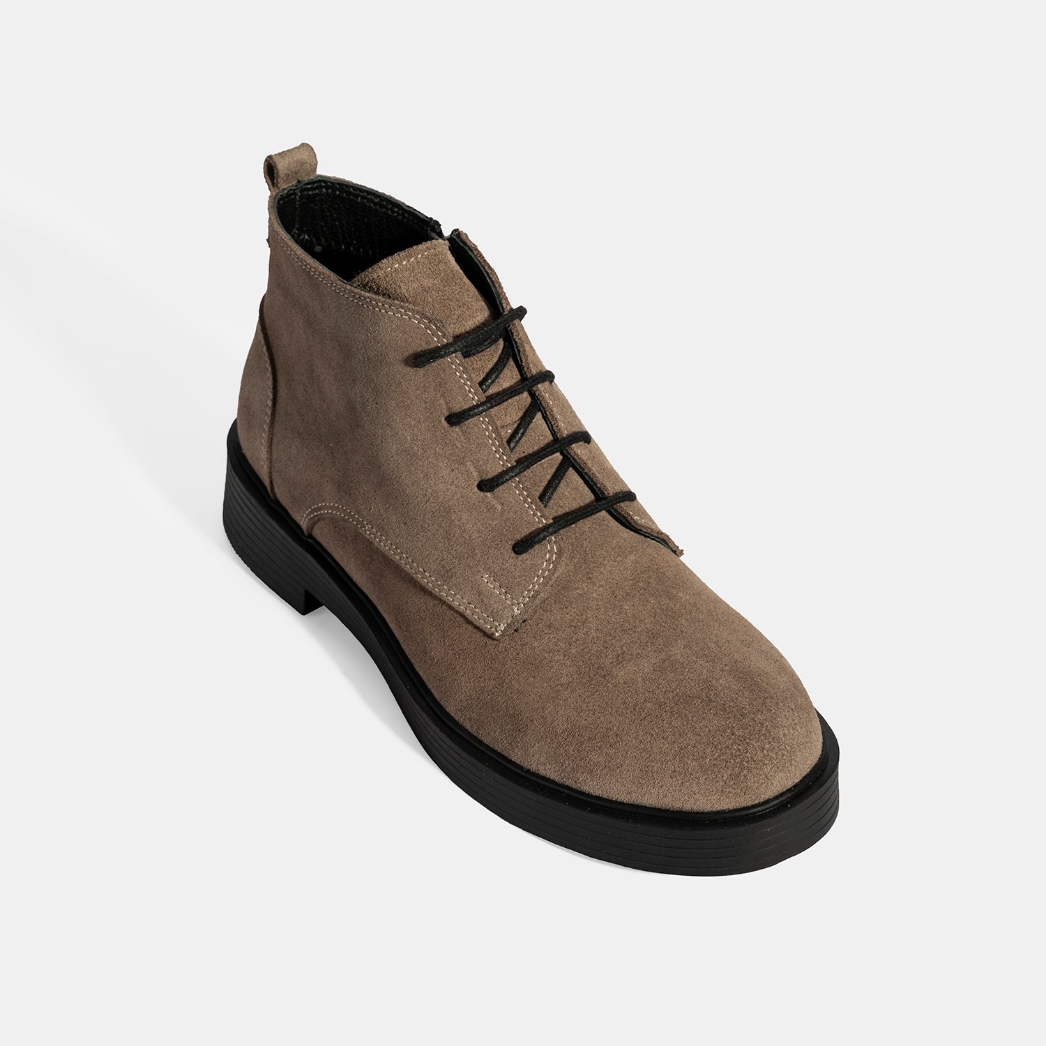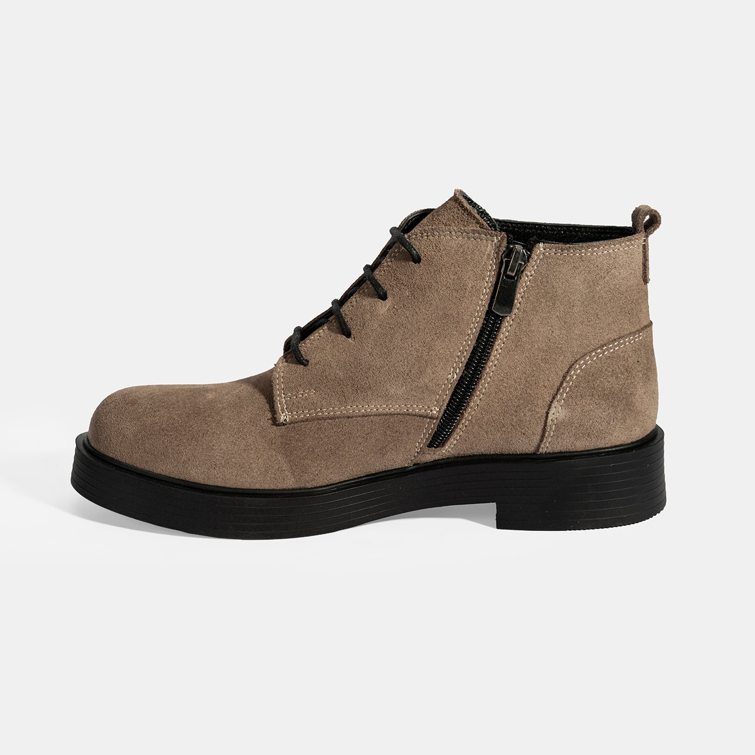 %100 süet deri, deri iç tabanlı, sıcak tekstil astarlı, termo tabanlı, yuvarlak burunlu, bağcıklı kadın günlük bot. Topuk yüksekliği: 3 cm.