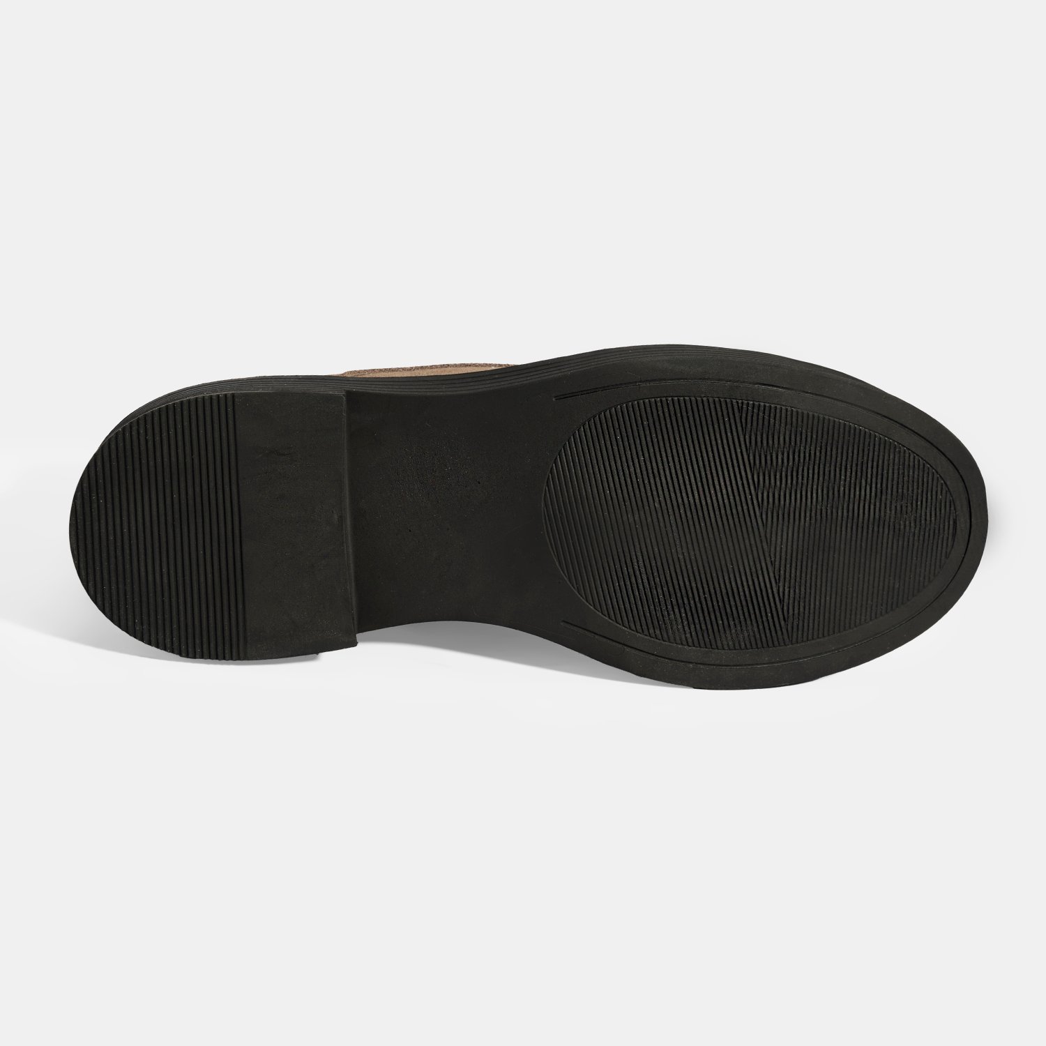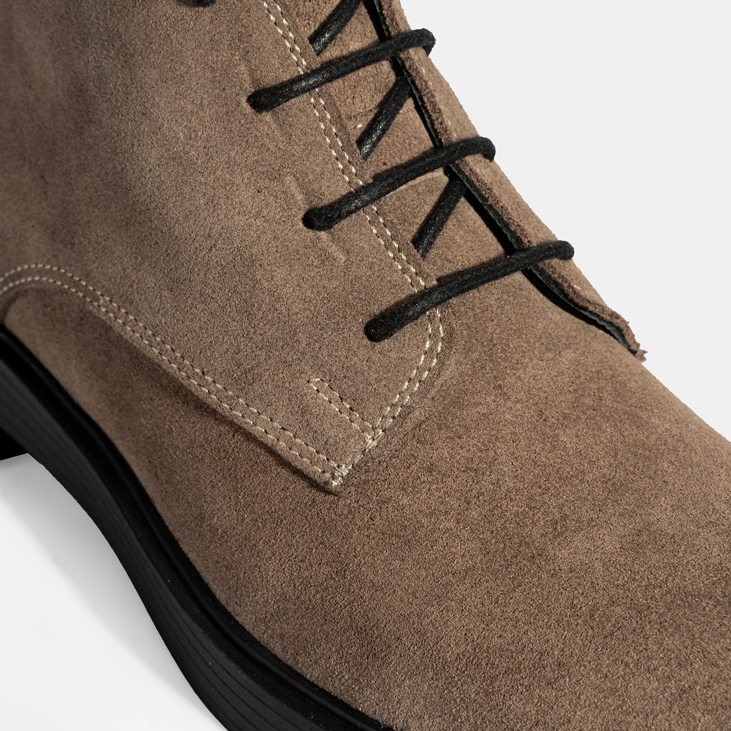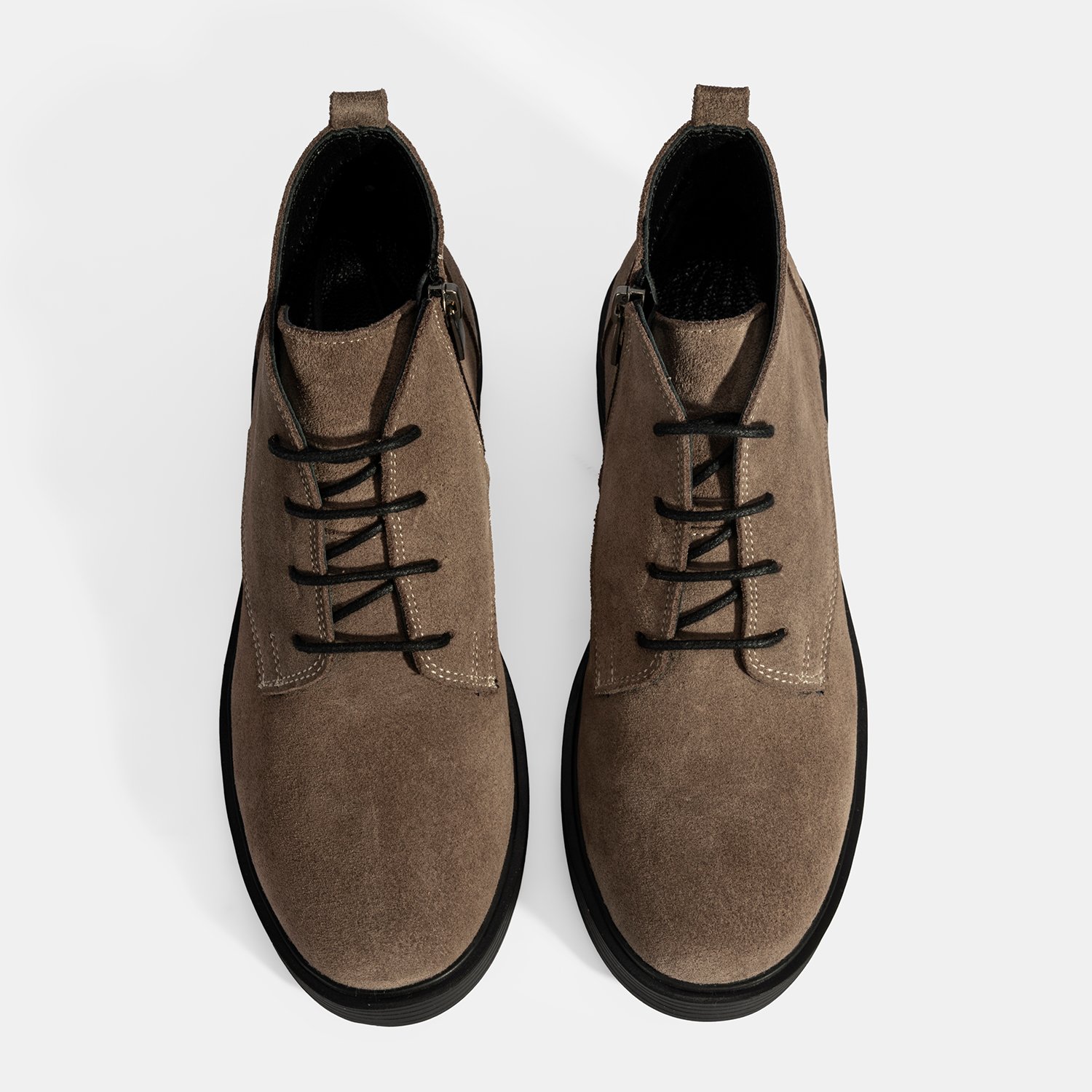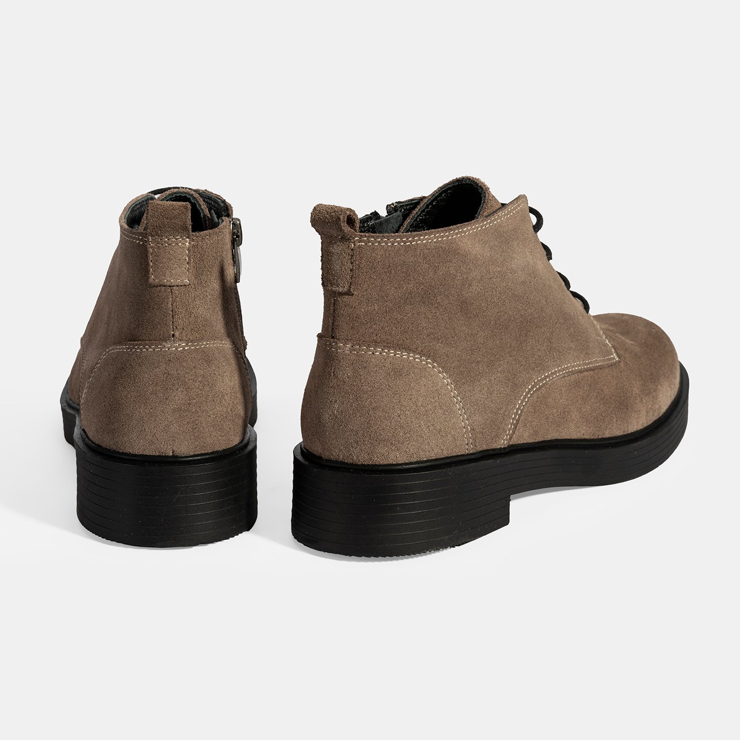 %100 süet deri, deri iç tabanlı, sıcak tekstil astarlı, termo tabanlı, yuvarlak burunlu, bağcıklı kadın günlük bot. Topuk yüksekliği: 3 cm.