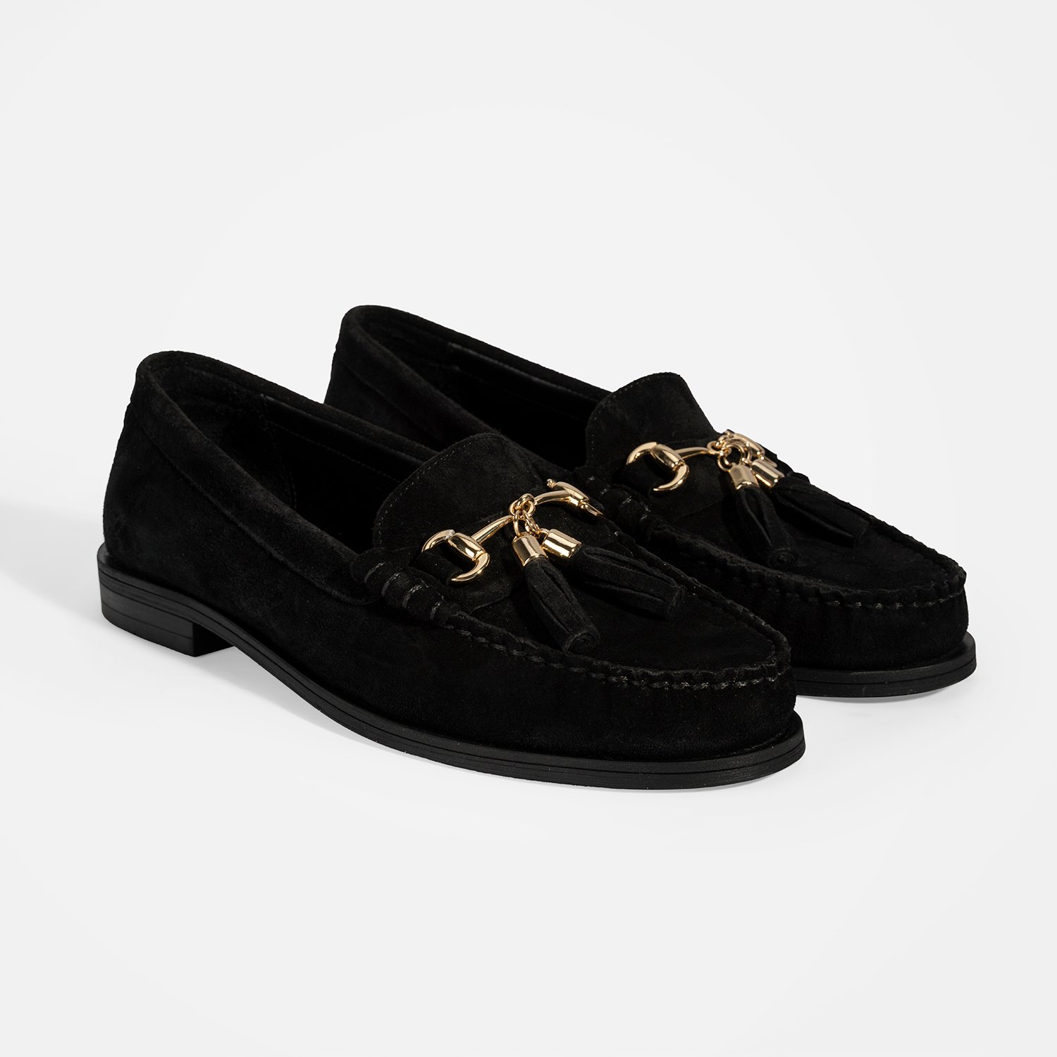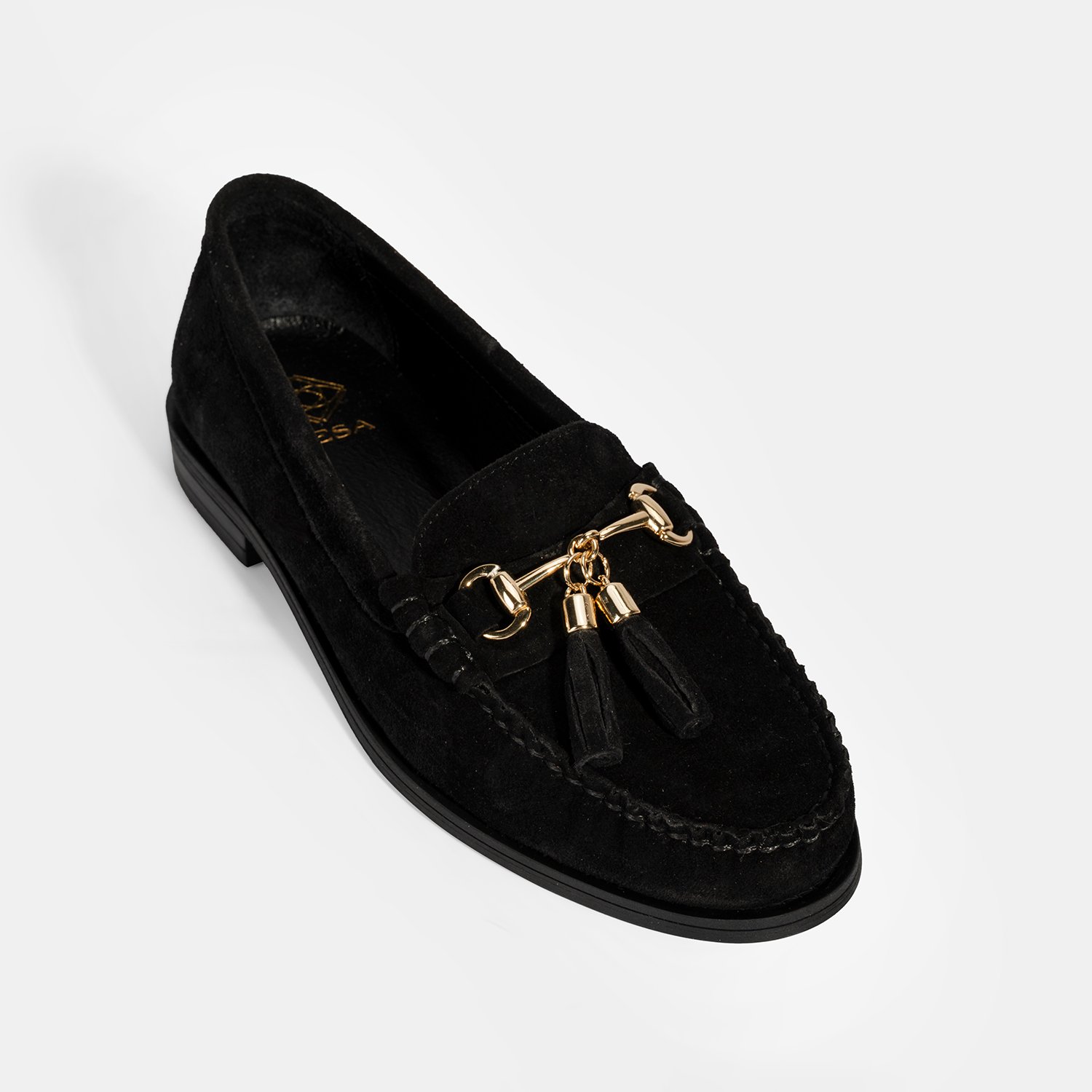 %100 süet deri, deri iç tabanlı, deri astarlı, metal toka detaylı, termo tabanlı, püsküllü kadın loafer. Topuk yüksekliği: 2 cm.