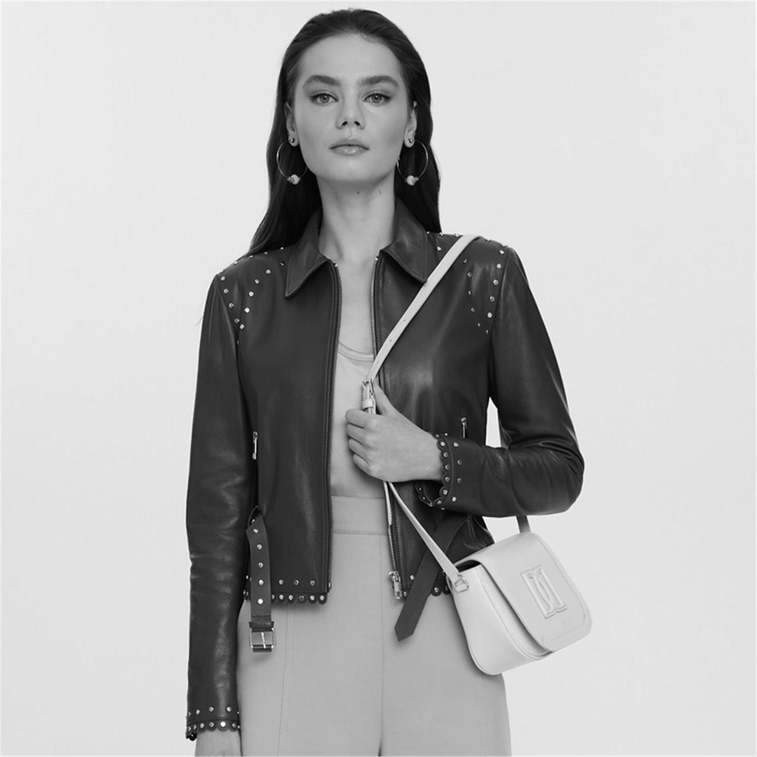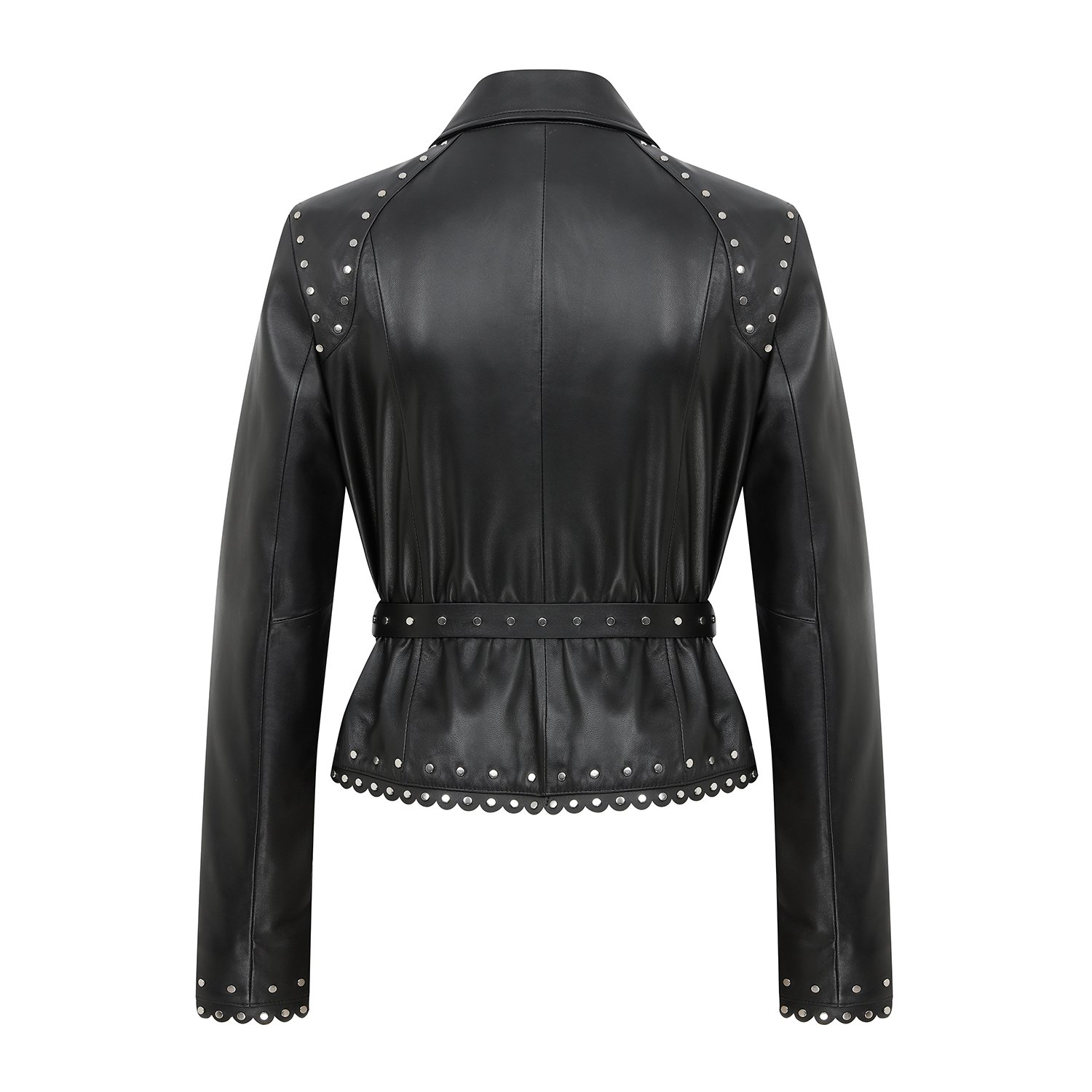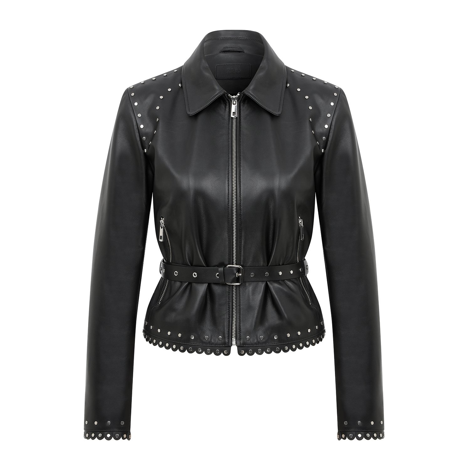 Kadın gömlek yakalı, trok detaylı deri ceket.