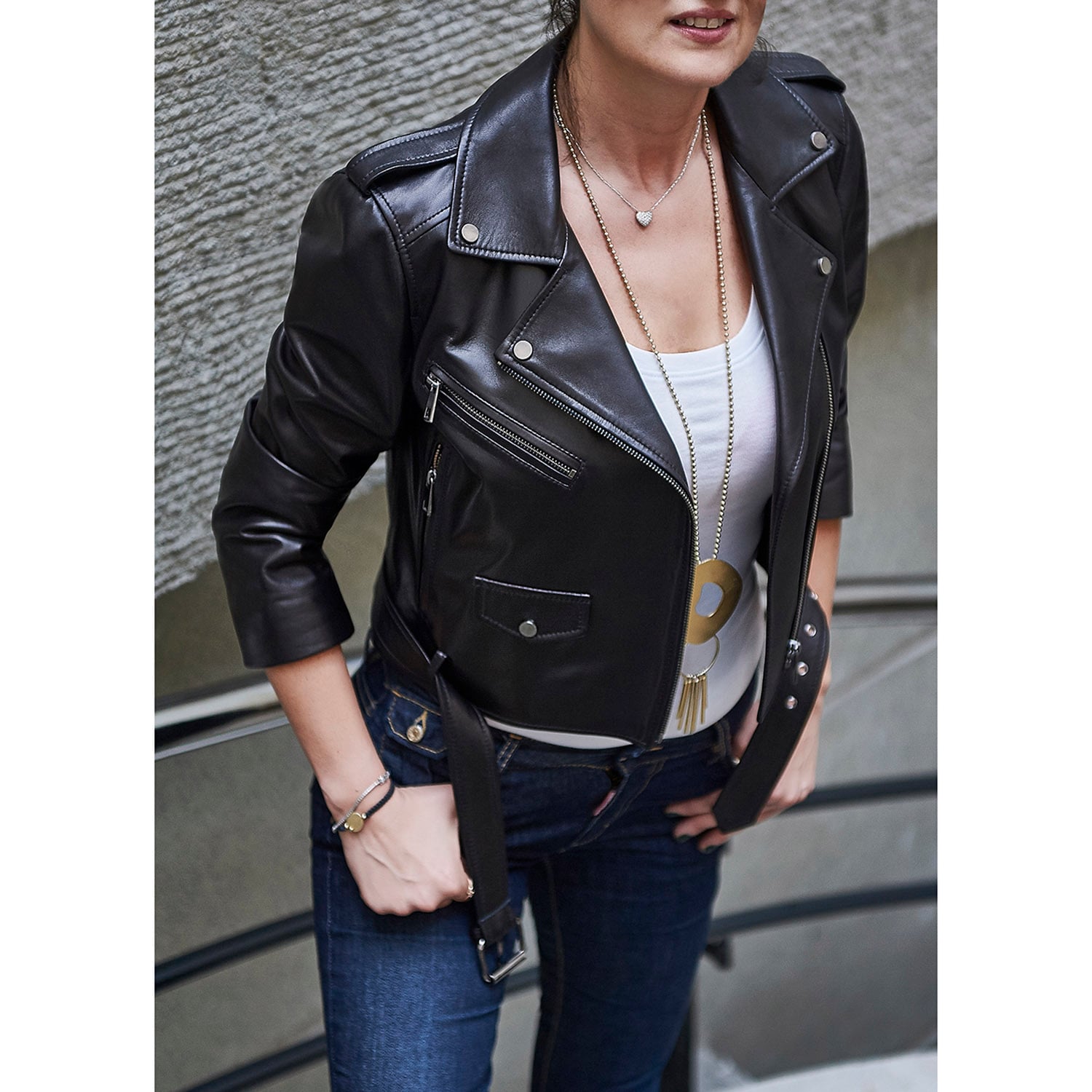 Kadın, deri biker mont.
