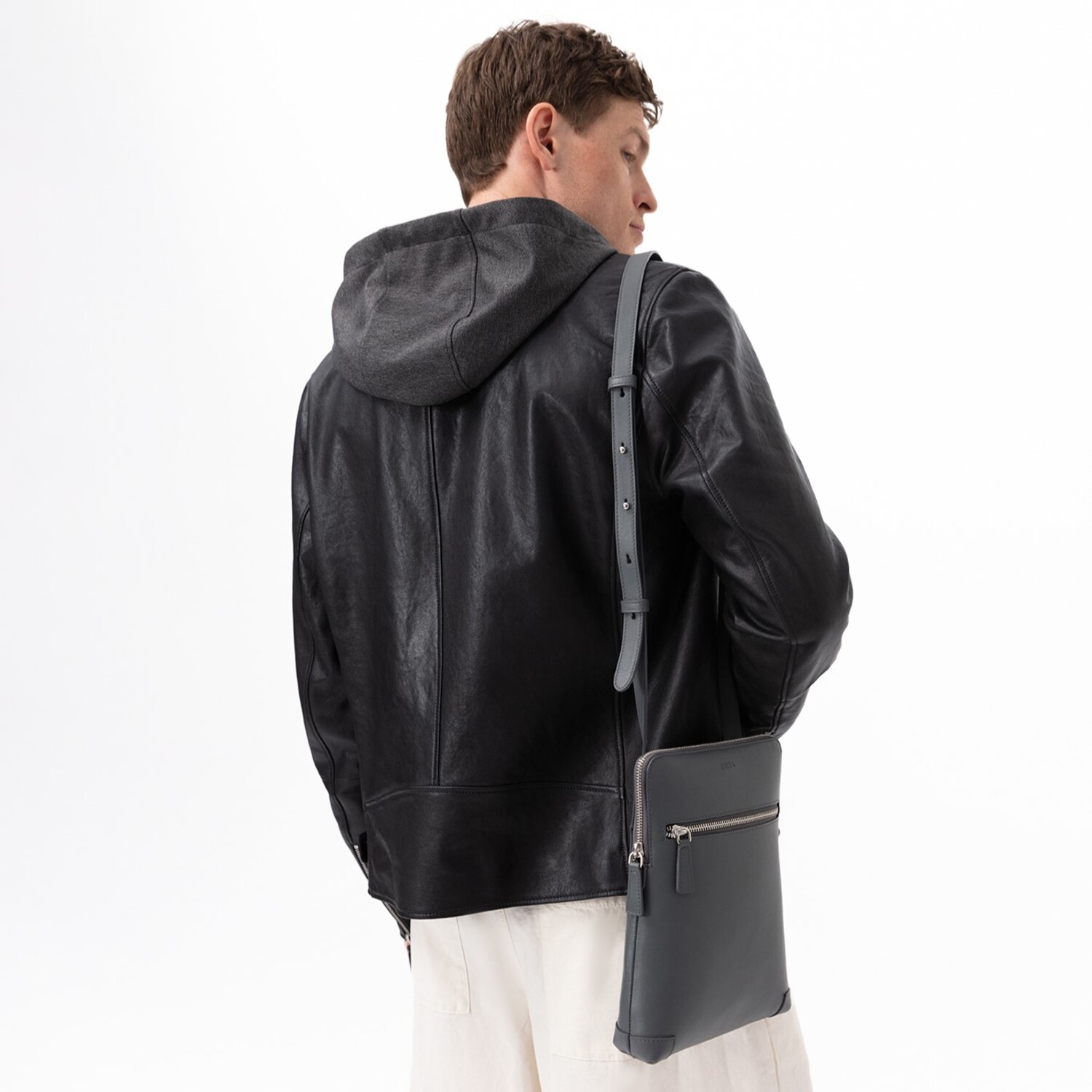 Erkek hafif hakim yakalı çıkma kapüşon detaylı deri ceket.