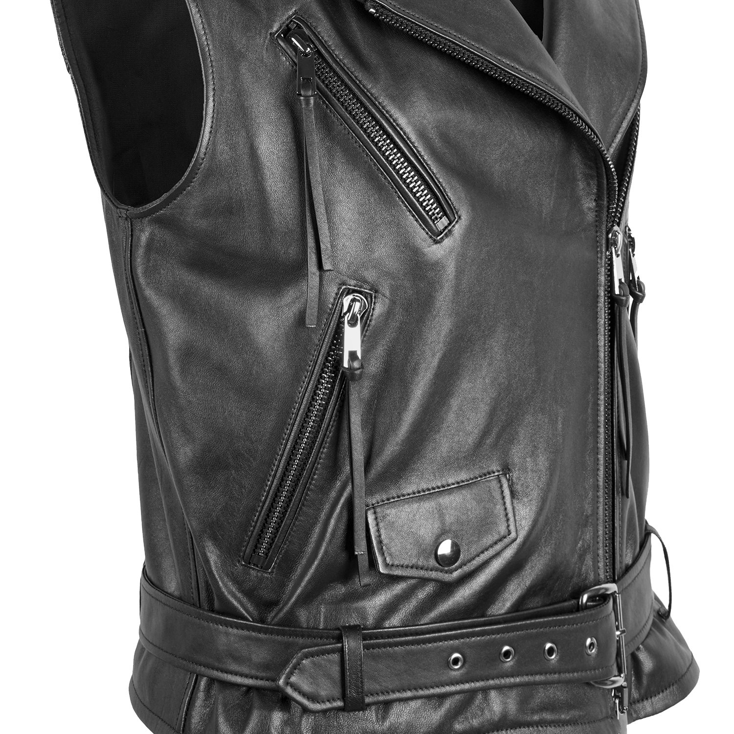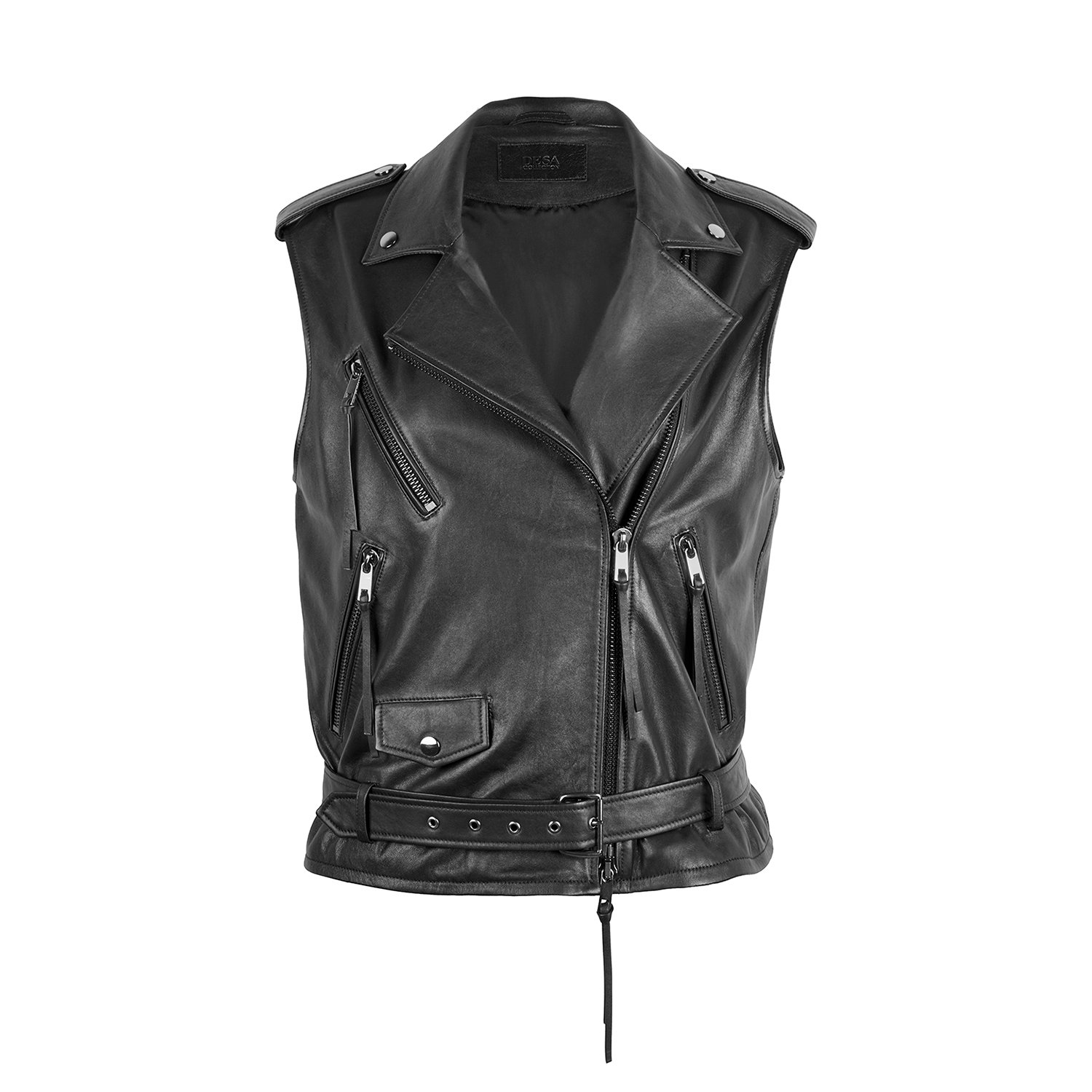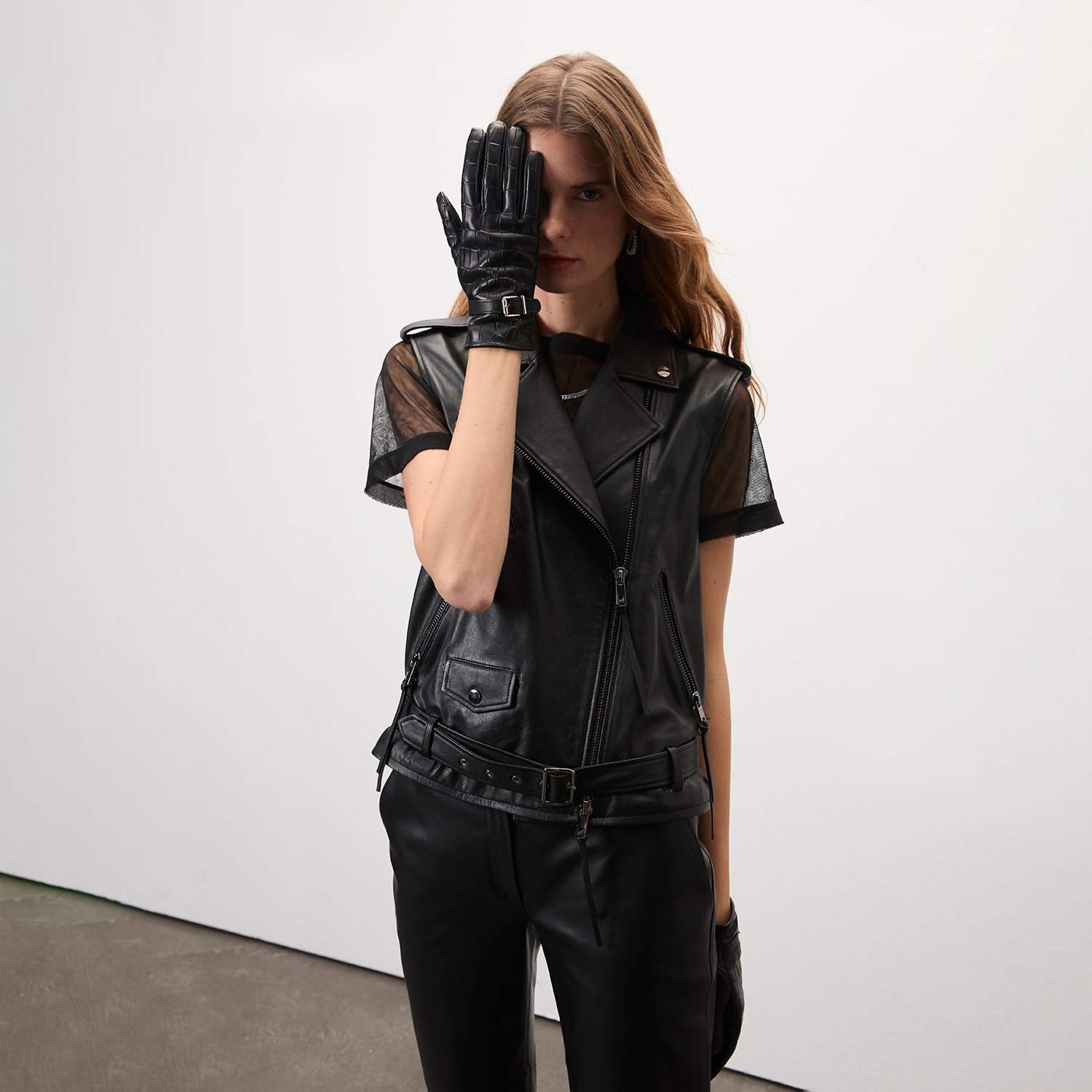 Kadın yakalı, kendinden kemerli deri biker yelek.